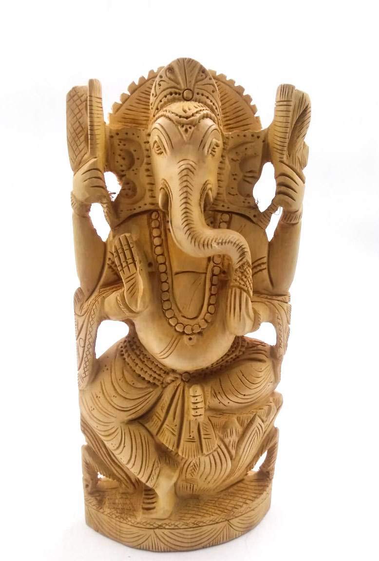 Lord Ganesha is widely revered as the remover of obstacles the patron of arts and sciences and the deva of intellect and wisdom. As the god of beginnings he is honoured at the start of rites and ceremonies. Ganesha is also invoked as patron of letters and learning during writing sessions. Shri Ganesha Is the remover of Obstacles. A Lord Ganesha statue made out of wood if placed in your house and worshipped regularly would help in bringing good health long life and success to the worshippers. Art: Handmade Wooden Carving An ancient craft originally practiced on ivory is adapted to different kinds of wood as well. The community of Ivory carvers still known as Hast daant waale from Rajasthan and Haryana have over the years evolved their craft to carving on wood as well. The craftsmen create decorative artifacts jewellery and utility products like lamps boxes photo frames and pen stands out of finely carved wood. These craftsmen generally work on sandalwood and the less expensive Kadam wood. Sandalwood is softer to work on and hence requires slightly blunt tools as against sharper ones for the Kadam wood. Carving involves shaping wood to make objects of utility and chiseling parts of wood to form intricate designs with the help of hand tools. Buyer will love the smooth lines and subtle detailing that gives this piece a sense of mystery. Other carved animals/designs adds a bold attraction to produce a piece that you will love displaying on your shelf or table. The warm stain enhances the natural beauty of the wood grain.