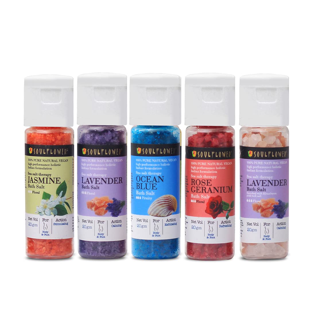 Soulflower Bath Salt Granules Combo Pack of 5 (20g Each) | Men & Women for Foot spa Muscle Pain Relief Relaxing body scrub |100% Pure & Natural Sea Salt