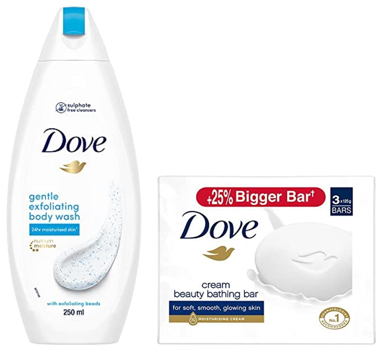 Dove Cream Beauty Bathing Bar 125 G (Combo Pack Of 3) With Moisturising Cream For Softer Glowing Skin & Body - Nourishes Dry Skin More Than Bar SoapDove Cream Bathing Beauty Bar combines a gentle cleansing formula with Doveâs signature ¼ moisturizing cream to give you softer smoother and more glowing skin with every shower. What makes Dove different? Doveâs beauty bars gently cleanse your skin and help retain its natural moisture rather than stripping it away. While ordinary soaps may leave your skin feeling dry and tight Dove cream Beauty Bar helps your skin maintain its natural moisture barrier and keep skin hydrated. Its moisturising and nourishing formula leaves skin soft smooth and glowing. Dove is the No.1 Soap Brand recommended by dermatologists. It is pH balanced and mild on skin making it suitable for all skin types. It has gentle cleansers which are suitable for dry and sensitive skin also. It cares for your skin and washes away germs. Regular soap may dry out your skin but the classic moisturizing formula of Dove bars will leave skin softer smoother and more glowing. For best results lather up your Dove Cream Beauty bathing bar and massage the smooth creamy lather over your face and body before rinsing thoroughly. Dove cares for skin and washes away germs. Try Dove And feel the Dove difference. Get soft smooth and glowing skin.Dove Gentle Exfoliating Nourishing Body Wash Mild Cleanser Moisturizes Skin Balances Ph For All Skin Type 250 mlGently wash away dead skin with Dove exfoliating body wash that leaves skin feeling smooth and soft after just one wash. Exfoliating beads help gently wash away dead skin. There are 631 million beautiful women in India. Women of all ages shapes sizes and skin tones. Yet as a society weâre often led to believe in a very limited idea of beauty. And while youthful looks fair skin long black flowing hair and a trim figure are some ways to express beauty â they are not the only ways. With your help we can represent the true diversity of beauty in India and empower every woman to realise her personal beauty potential. Together we can break the rules and change the face of beauty. We donât believe that the 631 million women living in India can possibly be represented by just one beauty ideal. Ours is a country rich in diversity and thatâs something we can all be proud of especially when it comes to beauty. We received an incredible response when we asked you to help us showcase #Real Beauty. We think that speaks volumes about how much we all want to see a more diverse range of beauty represented in India.