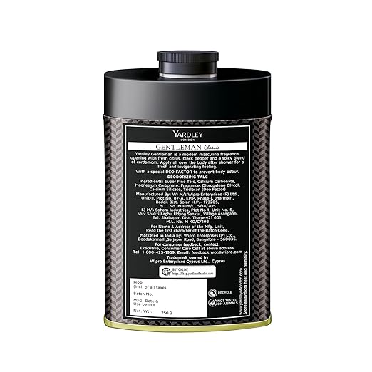 Step into the world of timeless elegance with Yardley London Gentleman Classic Perfumed Talc, designed exclusively for the refined, masculine gentleman. This talcum powder artfully blends spicy notes and citrus accents, delivering an alluring fragrance that captivates from the first application and lingers throughout the day. Crafted with utmost precision, the Gentleman Classic Perfumed Talc exudes a woody accord, interlaced with a hint of white chocolate, creating a delightful and invigorating sensation. Feel fresh, confident, and enveloped in an aura of sophistication every moment you use it.Yardley, a brand synonymous with Englishness, luxury, and quality, brings you this signature talc, a true testament to the legacy of English perfumes. With an exquisite blend of fine English talc and a unique 'Deo Factor,' this talcum powder leaves you scented and prevents unwanted body odour, providing a lasting sense of freshness. Elevate your grooming experience with Yardley London Gentleman Classic Perfumed Talc, where modernity meets tradition, and natural fragrances blend harmoniously to create an unforgettable impression. Trust in Yardley's time-honored expertise and add this talc to your collection, a touch of English elegance that complements your personality flawlessly.