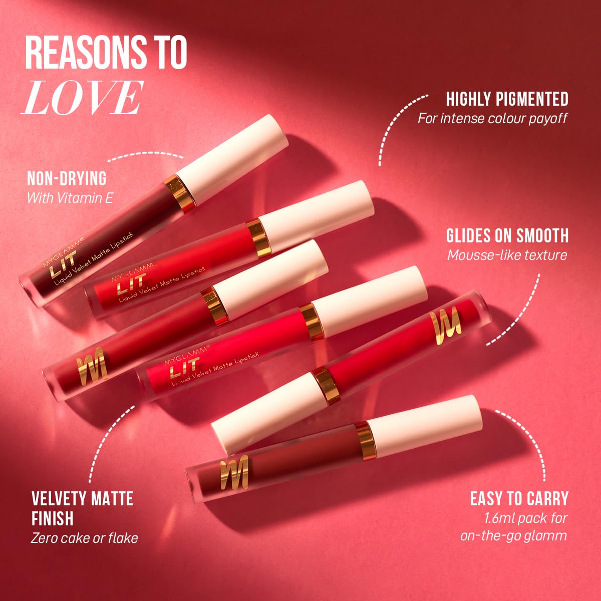 A smooth creamy mousse formula MyGlamm LIT Velvet Matte Liquid Lipstick is poppin with pigment. This true matte lipstick gives one swipe pigmentation for super-saturated payoff. Infused with Vitamin E the moisturising matte glides on the lips for a comfy and cushy feel. MyGlamm LIT Velvet Matte Liquid Lipstick is available in 12 vivid shades in an easy-to-carry pack for velvety lips that do all the talking (and more) - zero cake or flake!