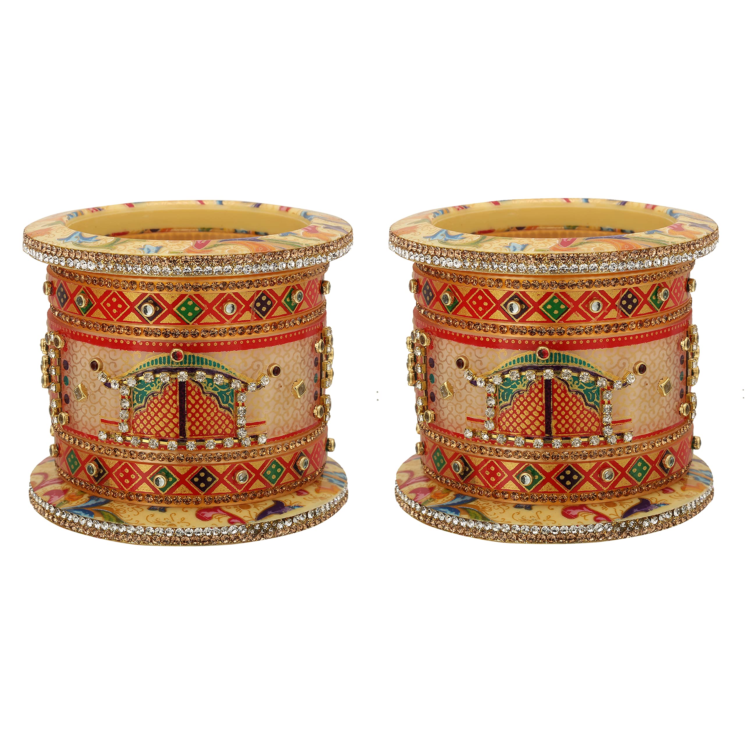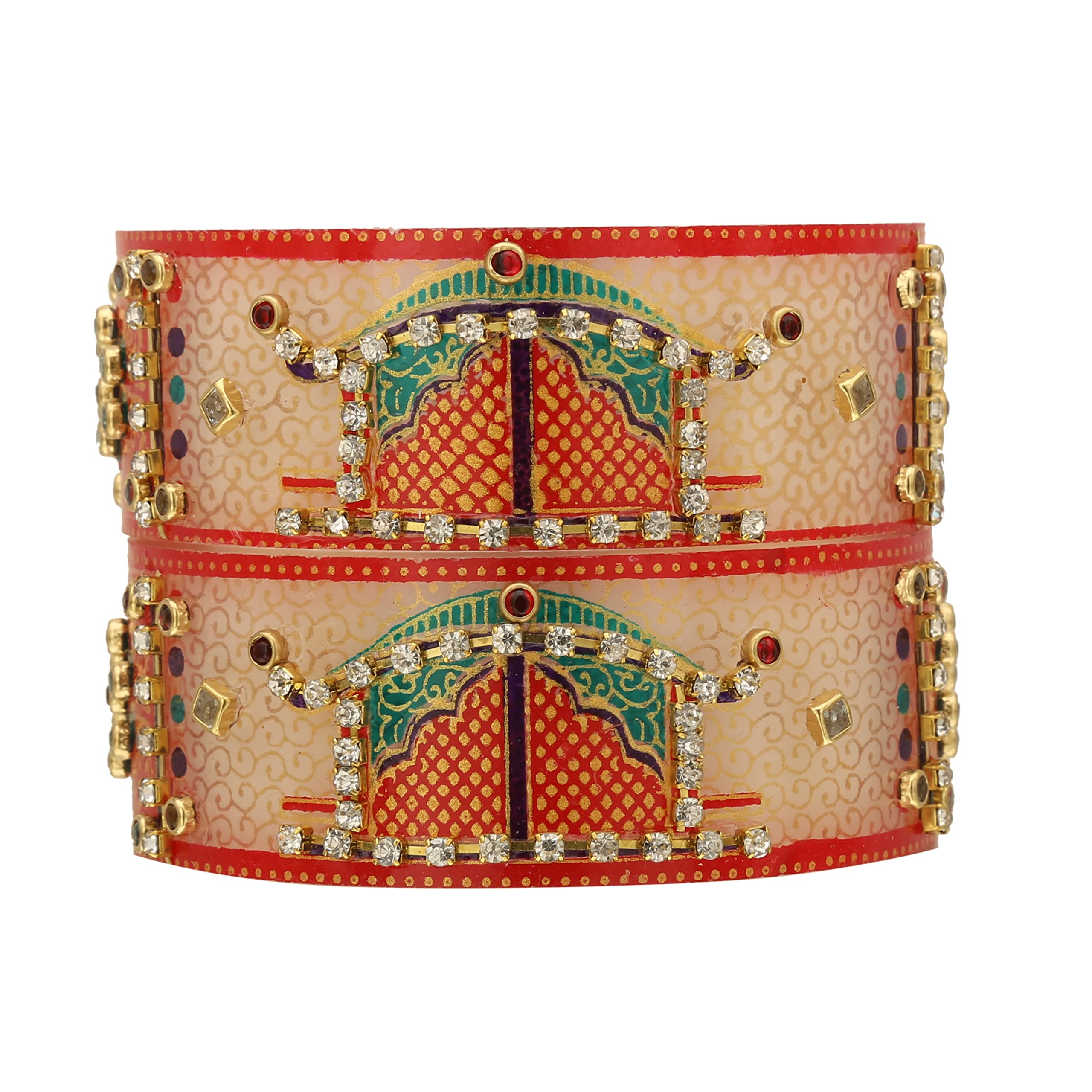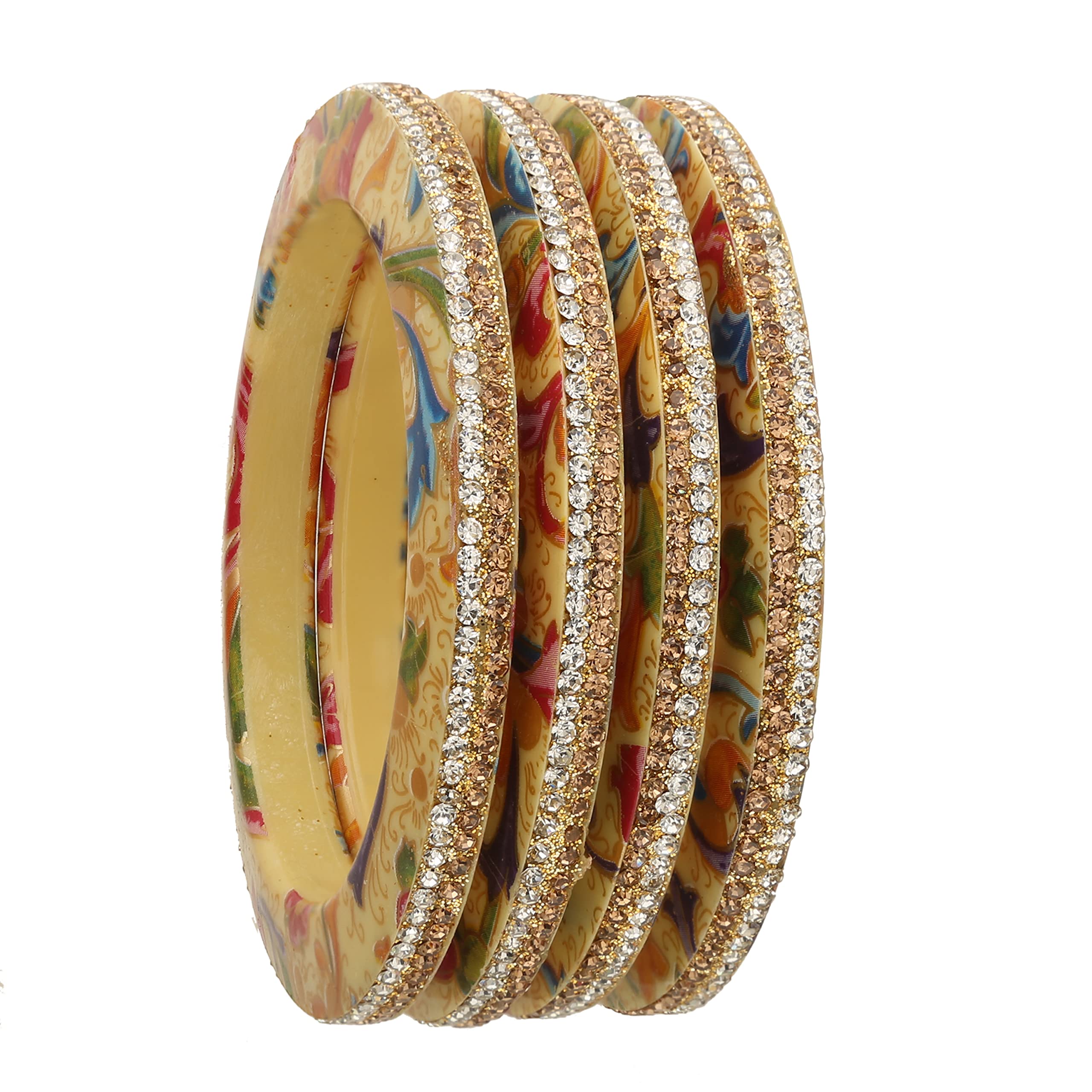 LAC BANGLES presents you an eye-catching wonderful latest design bangles by the artisans of Rajasthan India. This bangle set has 9 bangles in one hand a total of 18 seep / plastic bangles which comprises 4 designer bangadi bangles stud with white & golden color stones 8 bangles with golden stones 4 kada with diamond shape design 2 dulhan palki design big kadas. This unique Indian handicraft is an all-occasion gift to add grace to any outfit. Pair it with any traditional ethnic designer casual or any party wear & create your own style statement.