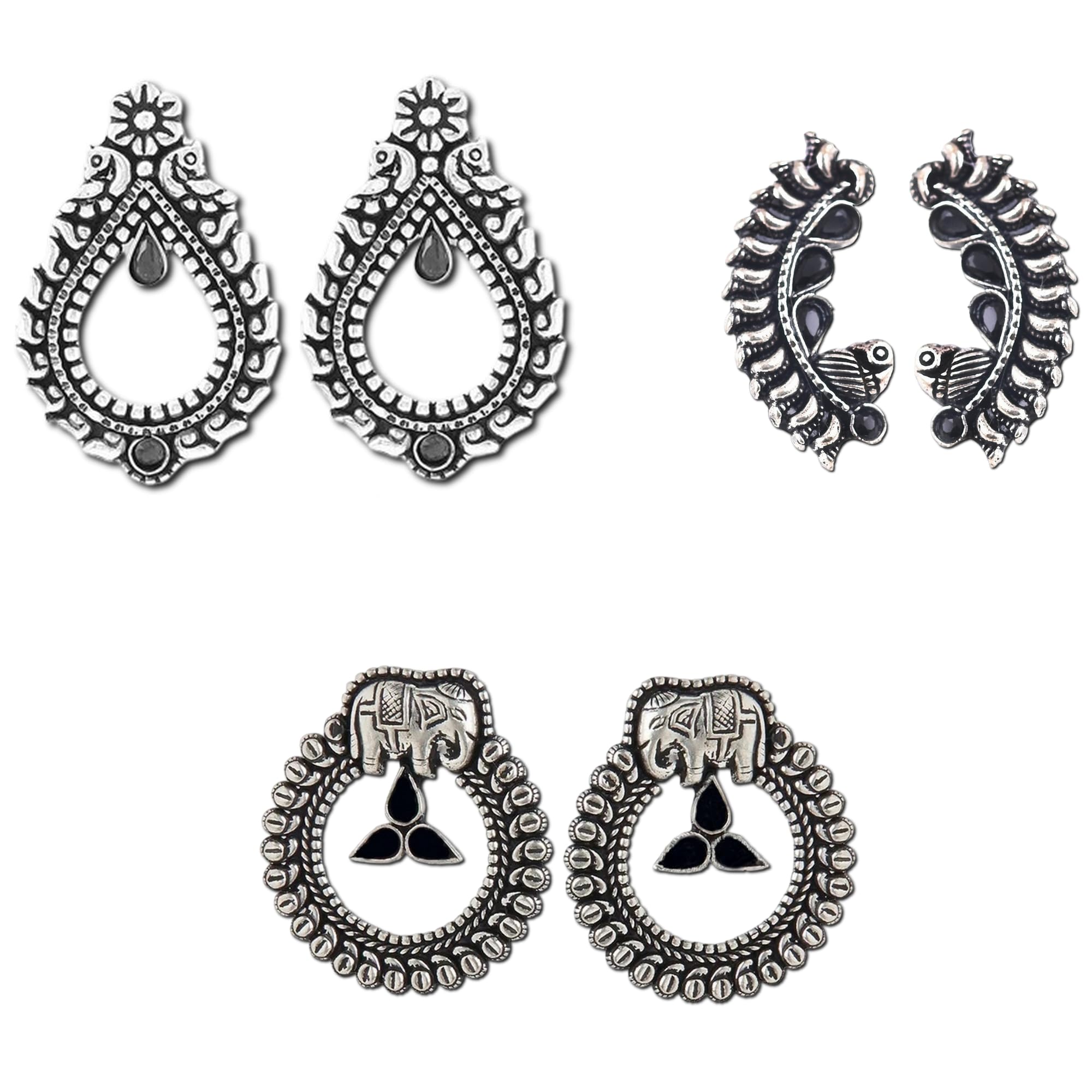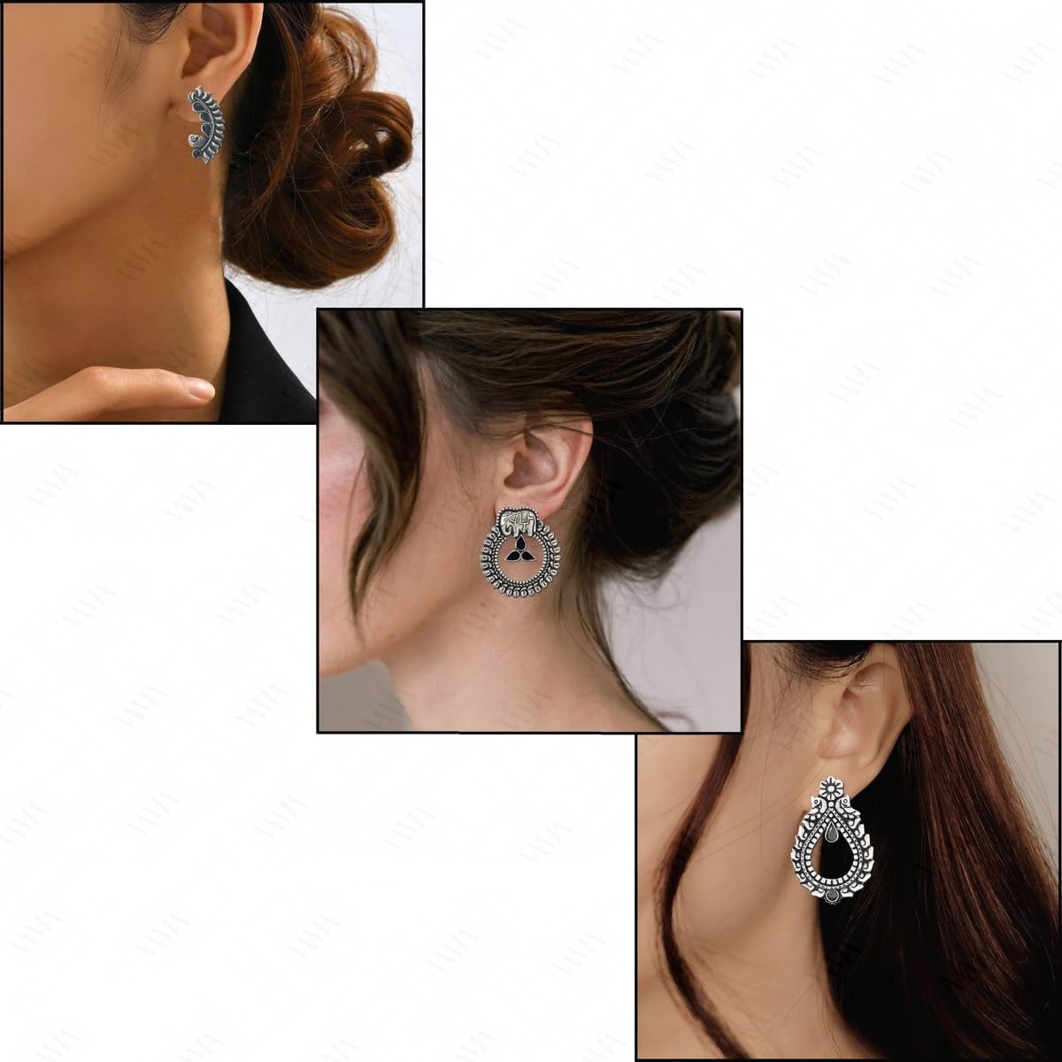 VAMA Fashions Premium Boho Gypsy Style German Silver Oxidised Afghani Tribal Stud Earrings Combo Set for Women & Girls