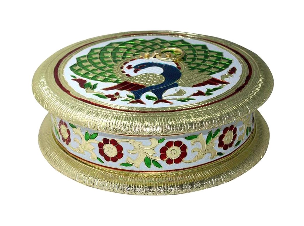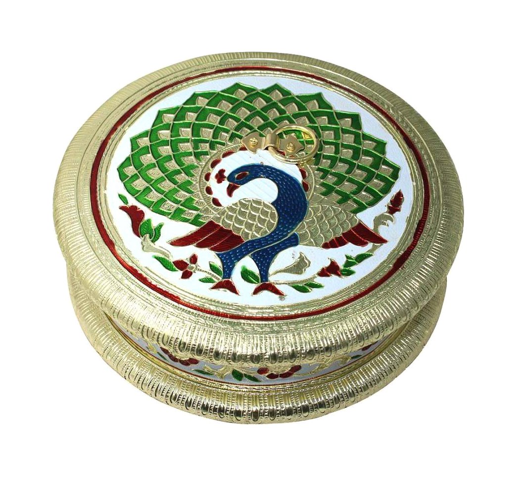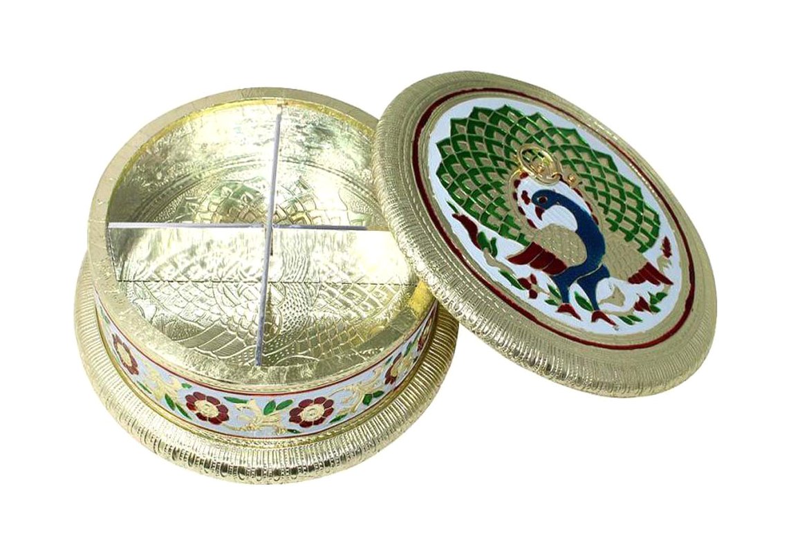 Peacock designed beautiful wooden and aluminium handicraft dry fruit box with meenakari Art work .It Showcases The rich Art of Rajasthan . Can be used as Dry Fruit Box Mouth Freshner Box Wedding Gifts And many More.