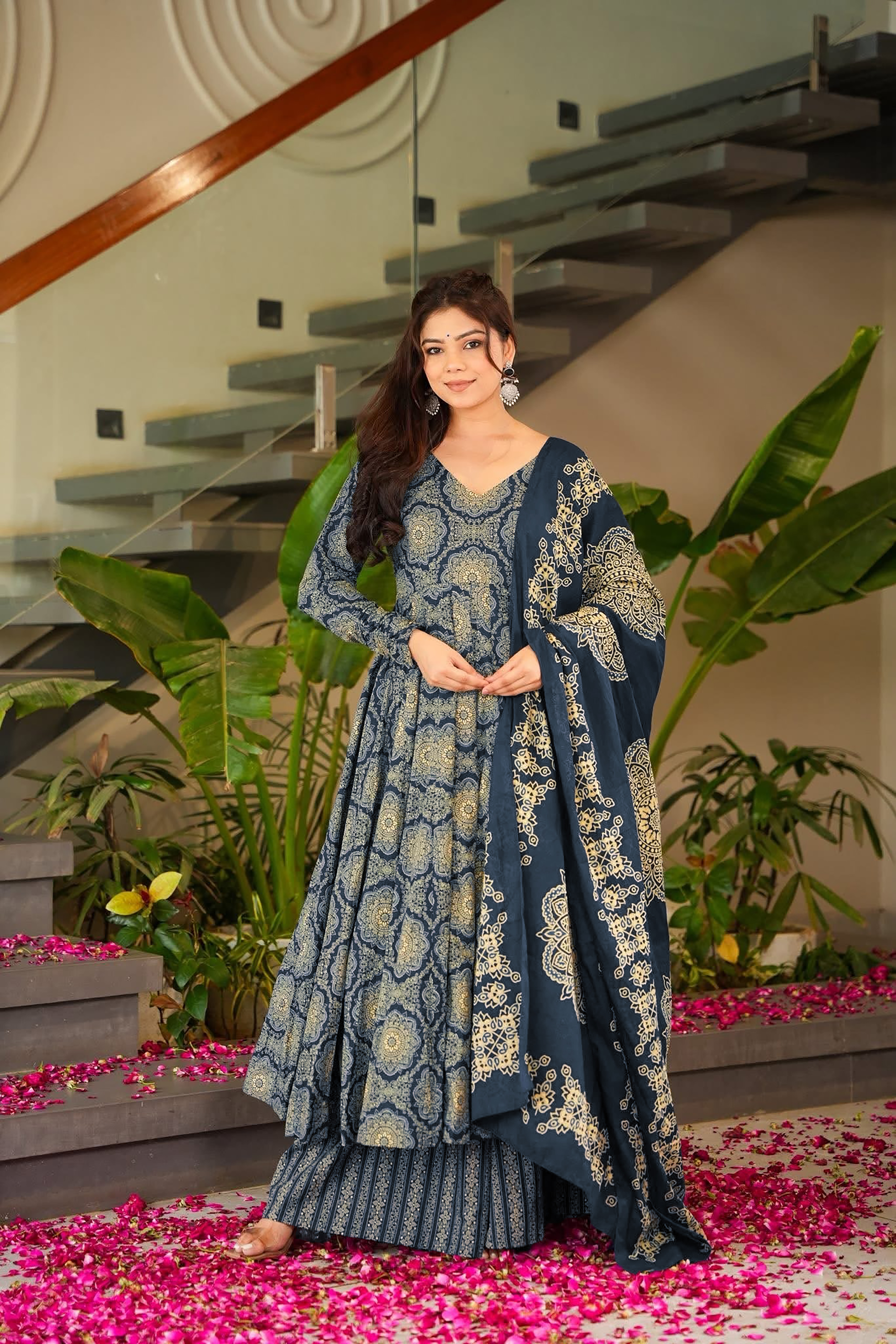 Elevate your festive wardrobe with this elegant Anarkali top and bottom set paired with a matching dupatta. Designed with a graceful flare and comfortable fit, this readymade ensemble blends traditional charm with modern styling, making it ideal for festive celebrations, family functions, and special occasions.