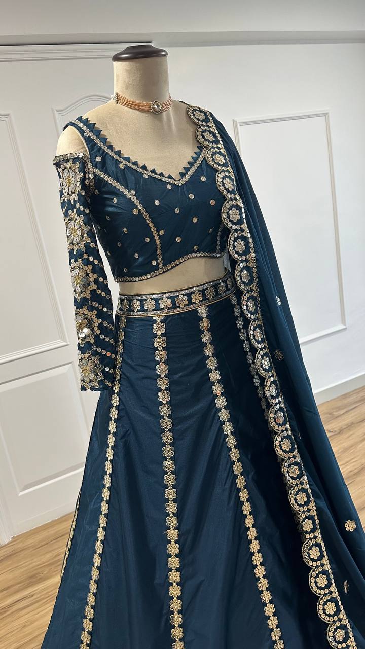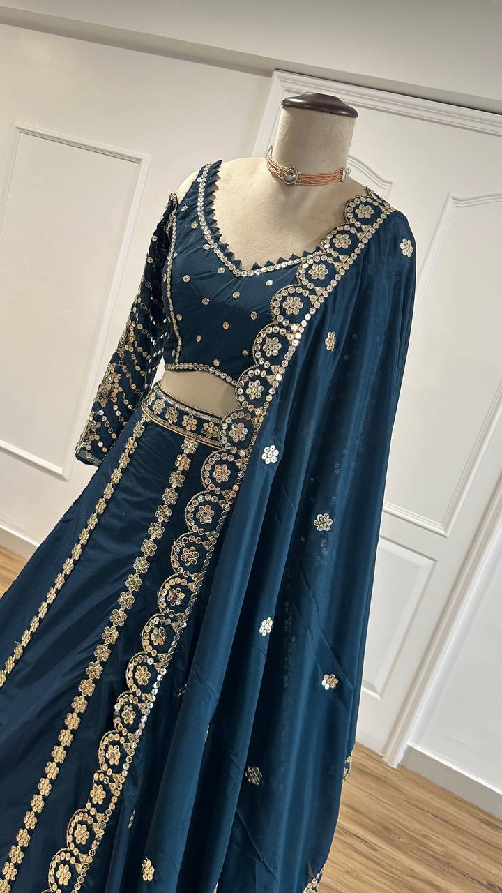 Designer Lehenga Choli Set with Dupatta Malai Silk Fabric 9Mm Sequins Work & Zari Work for Women – Blue Color