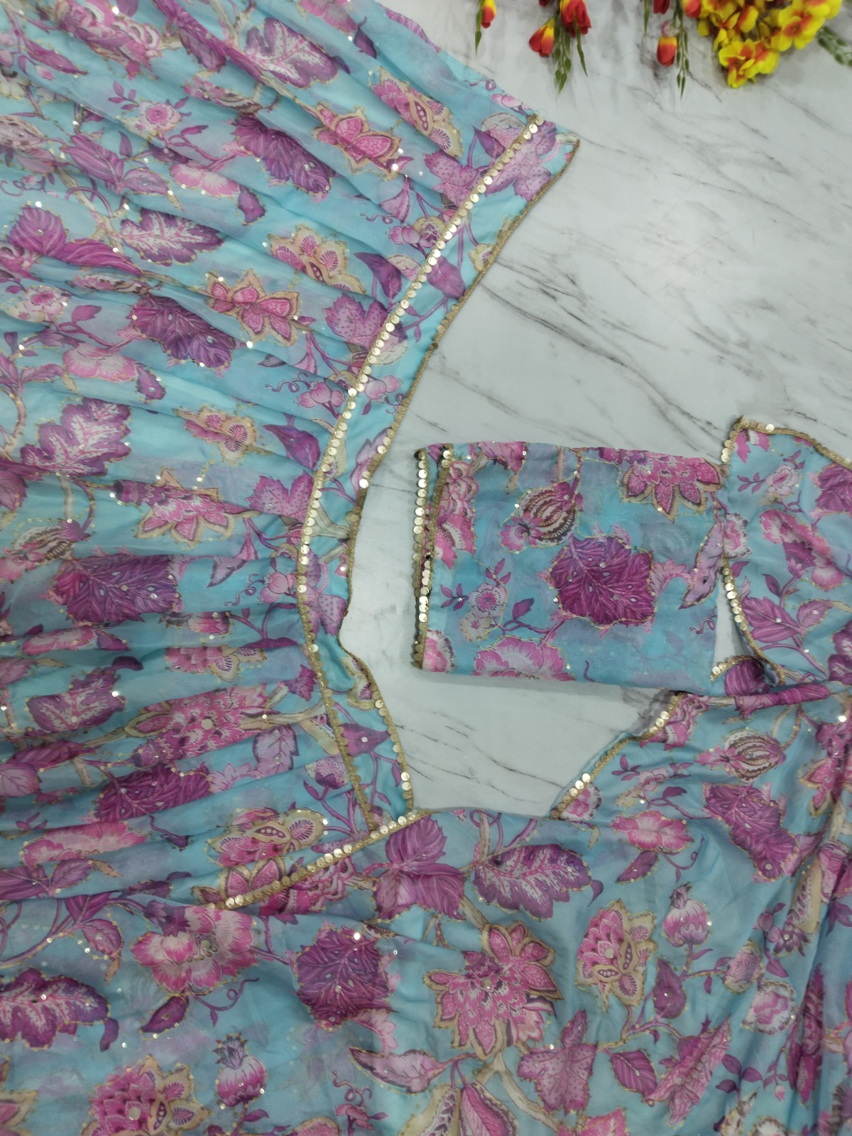 • Detailed work and attractive patterns give the outfit a grand festive appearance.