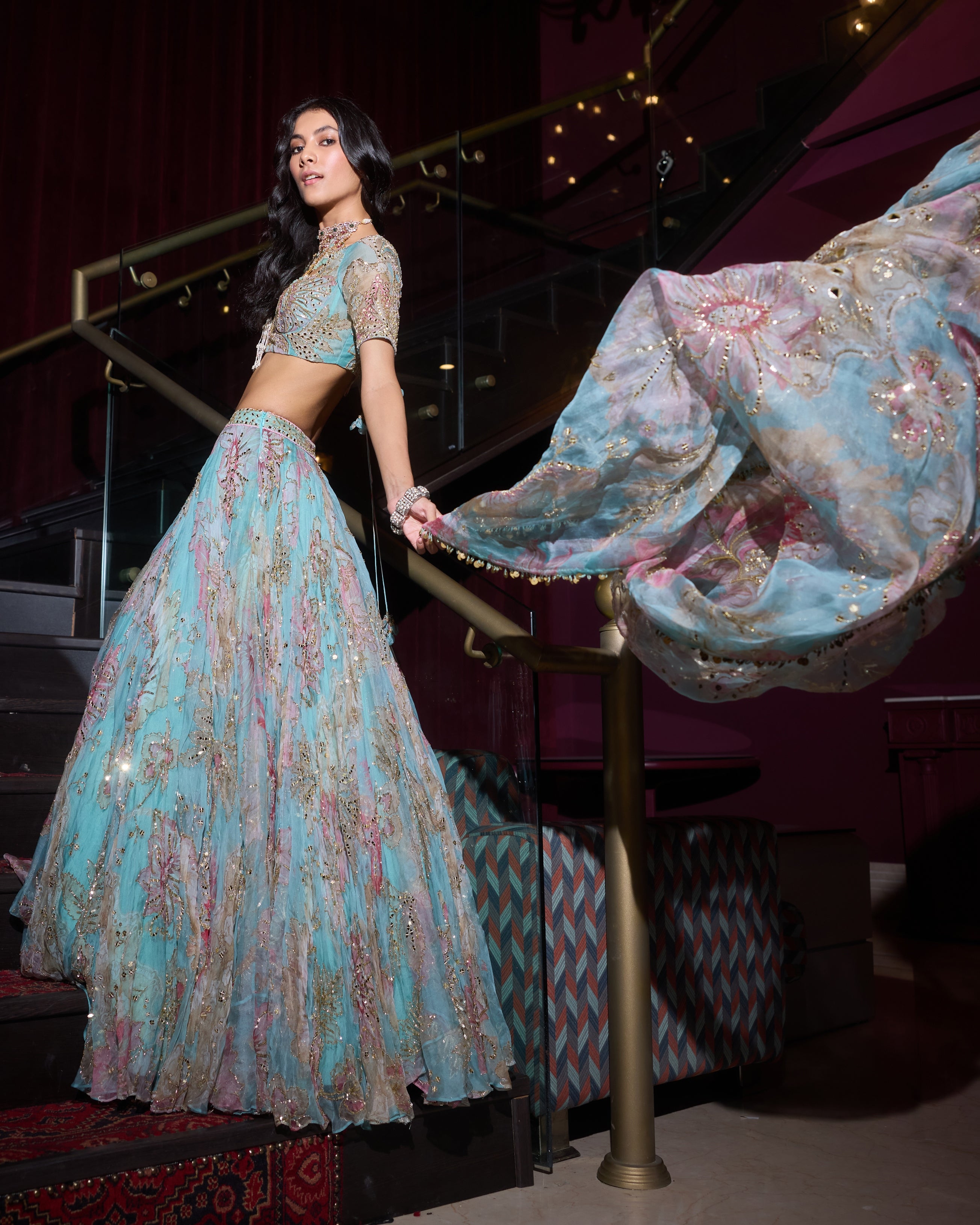 • Includes lehenga (skirt), matching choli (blouse) and dupatta for a coordinated ethnic look.