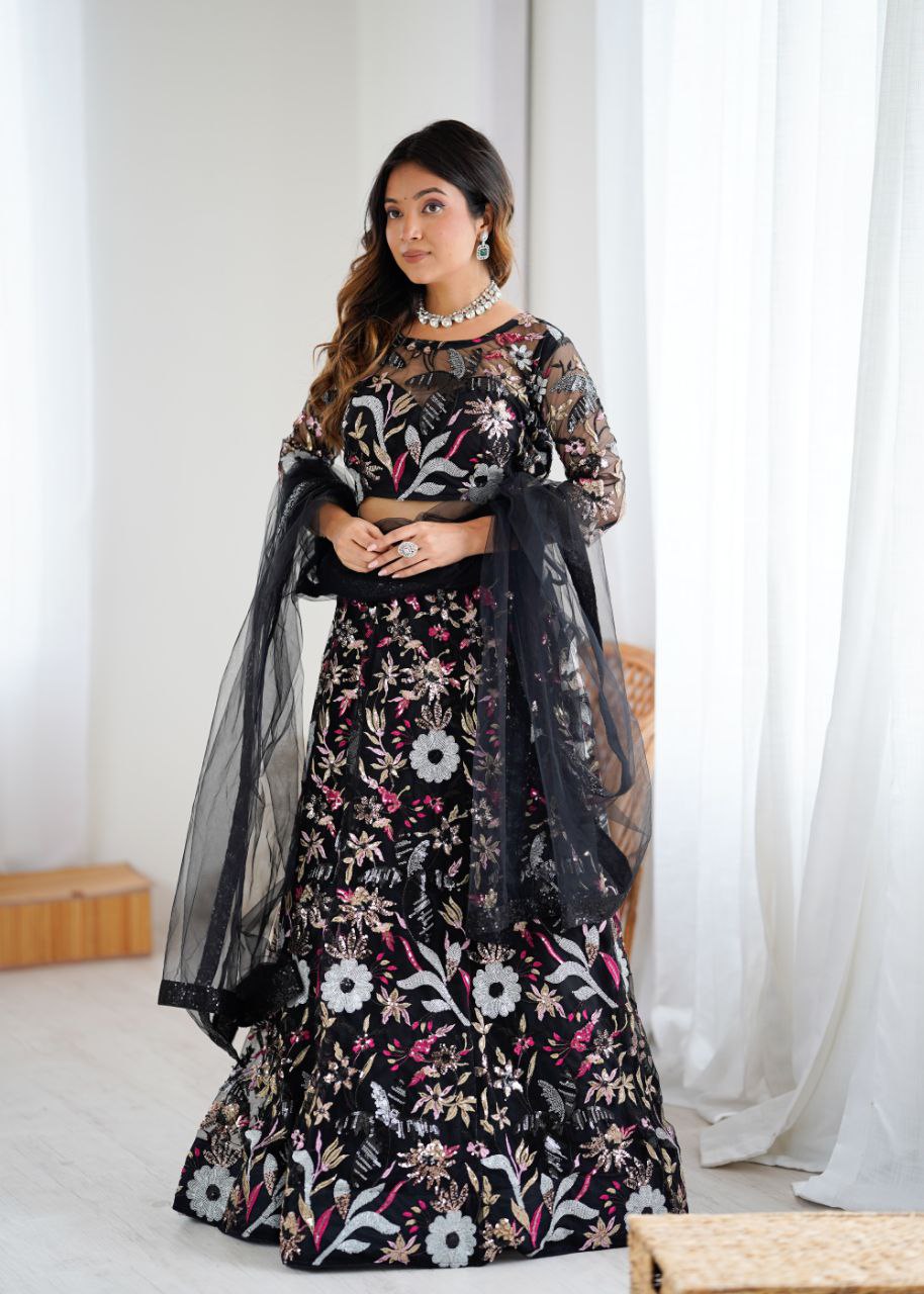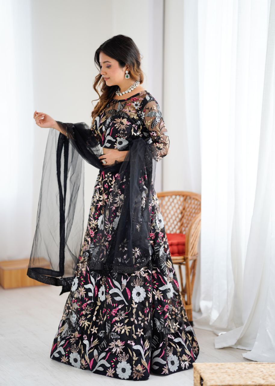 Lehenga : Premium Butterfly Net Lehenga Embellished With Beautiful Heavy Thread Embroidery Work With Heavy Four Sequins Work All Over With Heavy Cancan And Canvas With Double Inner Covering With 3.5 Mtr Flair( Semi Stitched. )Blouse : Premium Butterfly Net Embellished With Beautiful Heavy Thread Embroidery Work With Beautiful Four Sequins Work Both Side Work Front And Back WithWork sleeves With Satin Inner( Unstitched )Dupatta: Premium Butterfly Net Embellished With Beautiful Sequins Work Border Lace( 2.5 MTR ).
