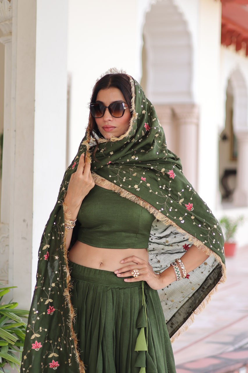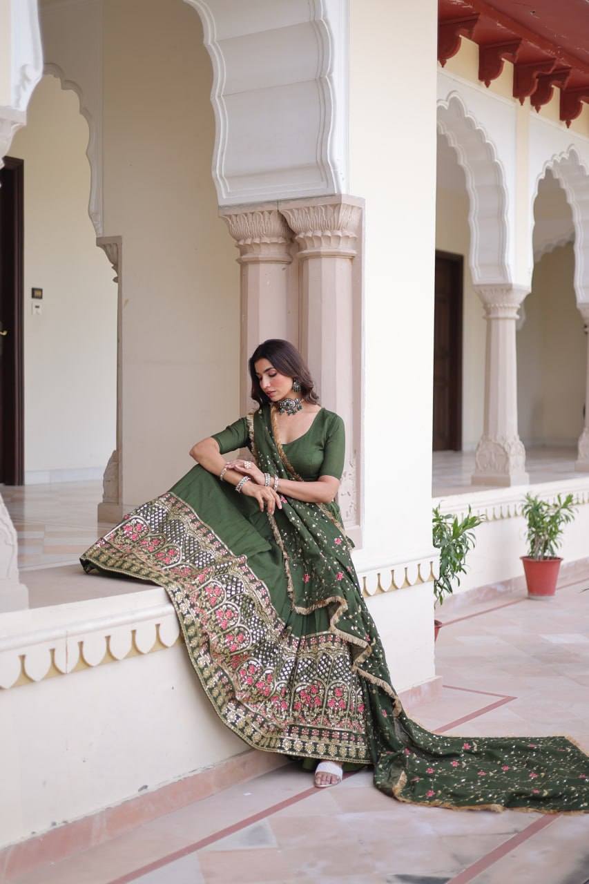 Lehenga:- (Full-Stitched) Fabric Work :- Vichitra Silk With Heavy Sequins Thread Embroidered work Length :- 42 Waist :- 42 Inner :- Cotton Flair :- 3 Mtr Closure :- Zip Attached With Dori Latkan Stitching Type :- Stitched with Canvas Can-canBlouse:- (Un-stitched) Fabrics :- Vichitra Silk Length :- 1 Mtr (Unstitched)Dupatta :- Fabrics Work :- Vichitra Silk with Sequins Thread Embroidered work with Designer Lace Border Length :- 2.2 Mtr.