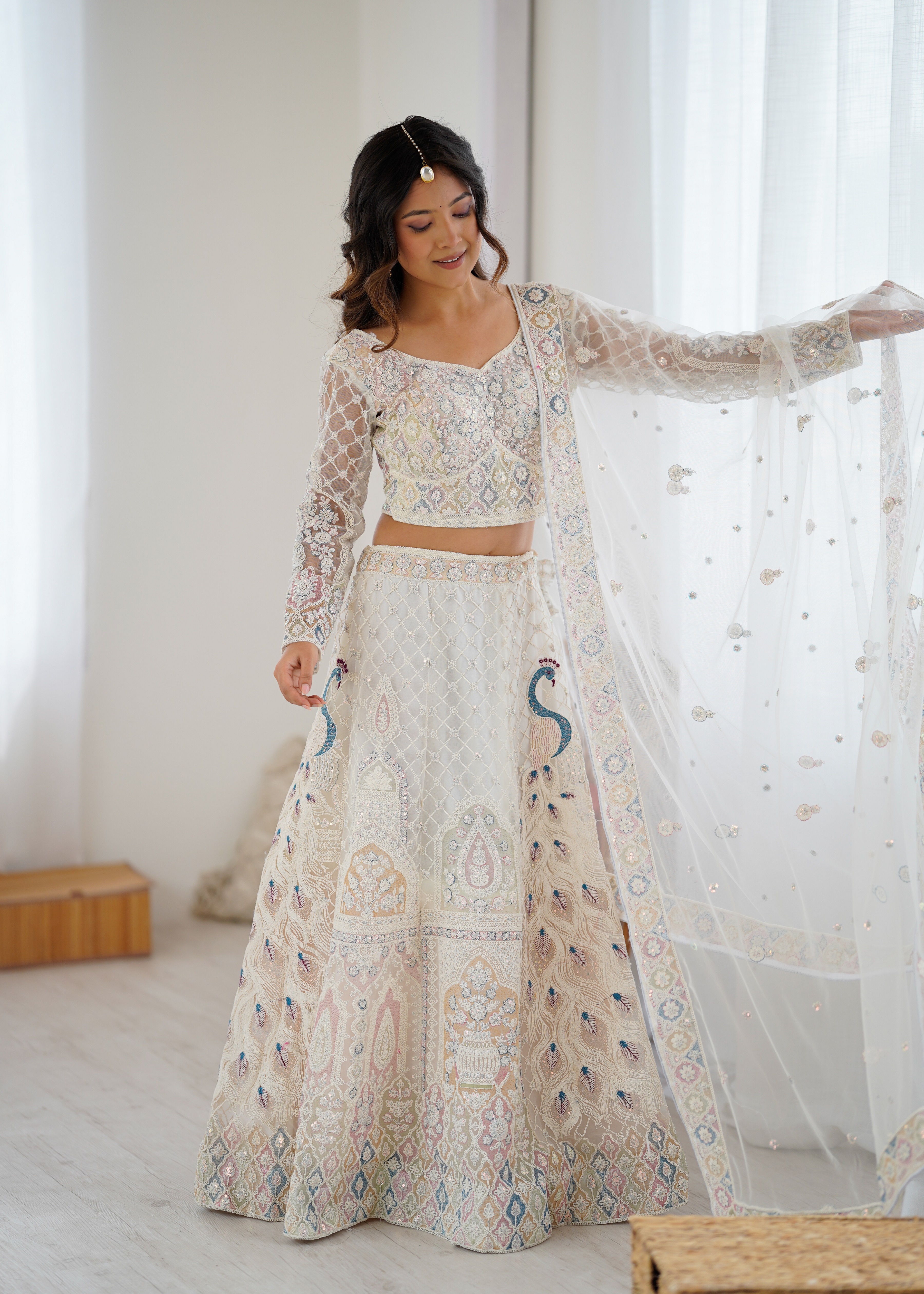 Fabric DetailsLehenga : Premium Soft Butterfly Net Lehenga Embellished With Beautiful Multy Thread Embroidery, And Dual Coding Work And Heavy Sequins Work All Over Lehenga With Peacock Design With Heavy Cancan And Canvas With Double Inner Covering With Flair 3.5 MTR( Semi Stitched Upto Xxl )With Heavy Cancan And Canvas With Double Inner CoveringBlouse : Premium Soft Butterfly Net Embellished With Beautiful Multy Thread Embroidery, Dual Coding Work And Beautiful Heavy Sequins Work, Both Side Work Front And Back With Sleeves Work( Unstitched Fabric, Stitched Upto 44 )Dupatta : Premium Soft Butterfly Net Embellished With Multy Thread Embroidery Work, Dual Coding Work And Beautiful Heavy Sequins Work( 2.5 MTR ).