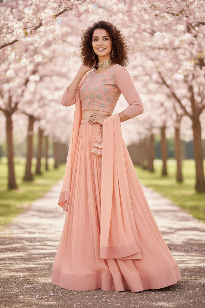 LEHNGA(BOTTOM)FABRIC:- FAUX GEORGETTEINNER:- MICRO FABRICWORK:- CRUSH WORKSTITCH:- SEMI STITCHED WITH CANVASSIZE:- 42HEIGHT AND 42WAISTFLAIR:- 4.80 TO 5.00 METER FLAIR COLOR:- PEACHCHOLI(TOP):-FABRIC:- HEAVY BANGLORI SILKSIZE:- 0.80 METER FABRICWORK:- 3MM SEQUENCE WITH JARI EMBROIDERY WORK STITCH:- UN STITCHED FABRICCOLOR:- PEACHDUPATTA:-FABRIC:- FAUX GEORGETTESIZE:- 2.25 METER DUPATTASTITCH:- FULL STITCHEDCOLOR:- PEACH.