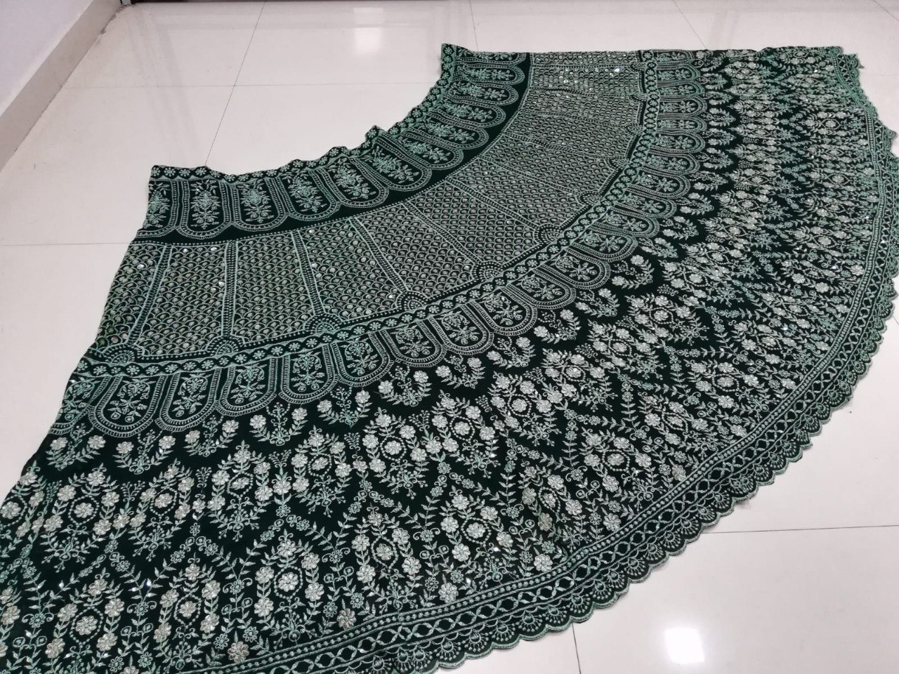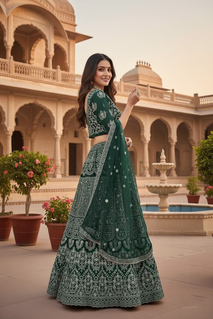 Green Sequin Thread Embroidered Banglori Silk Lehenga Set