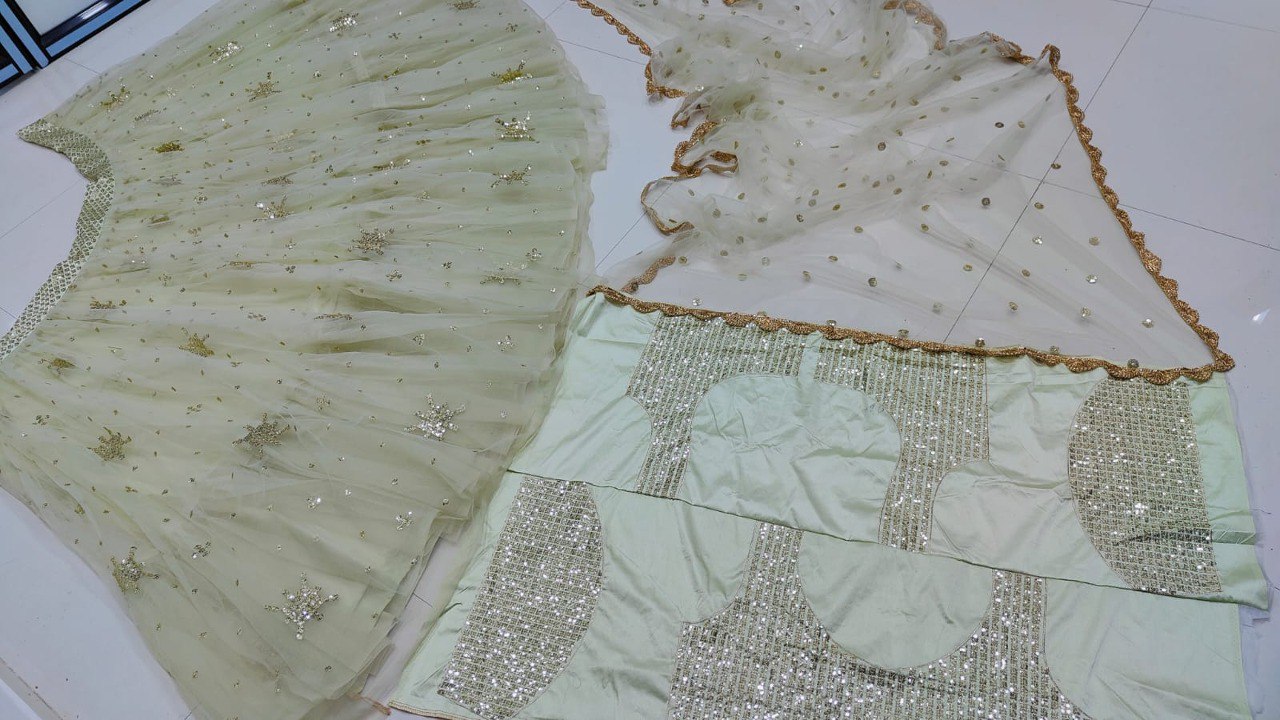 LEHENGA(BOTTOM)FABRIC:- NETINNER:- MICRO FABRICWORK:- 3MM SEQUINS WITH JARI EMBROIDERY WORKSTITCH:- SEMI STITCHED WITH CANCAN AND CANVASSIZE:- 41 TO 42 HEIGHT AND 42 WAIST FLAIR:- 3.80 METER TO 4.00 METERADDITIONAL:- HEAVY NET FLAIR ATTACHED UNDER THE FIRST LAIR OF EMBROIDERY WORK.CHOLI(TOP)FABRIC:- SATIN SILKSIZE:- 0.80 METER FABRICWORK:- 3MM SEQUINS WITH JARI EMBROIDERY WORK STITCH:- UN STITCHED FABRICDUPATTAFABRIC:- NETWORK:- 3MM SEQUINS WITH JARI EMBROIDERY WORK SIZE:- 2.25 METER DUPATTASTITCH:- FULL STITCHEDADDITIONALWASH CARE: - DRY CLEAN ONLYCOLOR: - PRODUCT COLOR MAY SLIGHTLY VARY DUE TO PHOTOGRAPHIC LIGHTNING SOURCES OR YOUR DEVICE DISPLAY SETTINGSTHESE ARE MADE TO ORDER DESIGNER STYLES, HENCE EXPECT A SLIGHT VARIATION FROM THE IMAGE DISPLAYEDIN THE BOX 1 PIECE LEHENGA 1 PIECE DUPATTA 1 PIECE BLOUSE FABRIC.