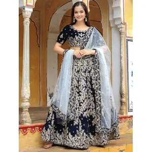 Womens Navy Blue Velvet Zari Work...
