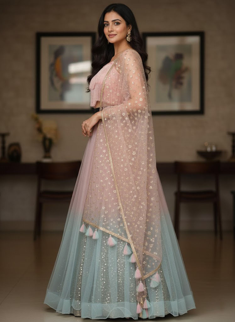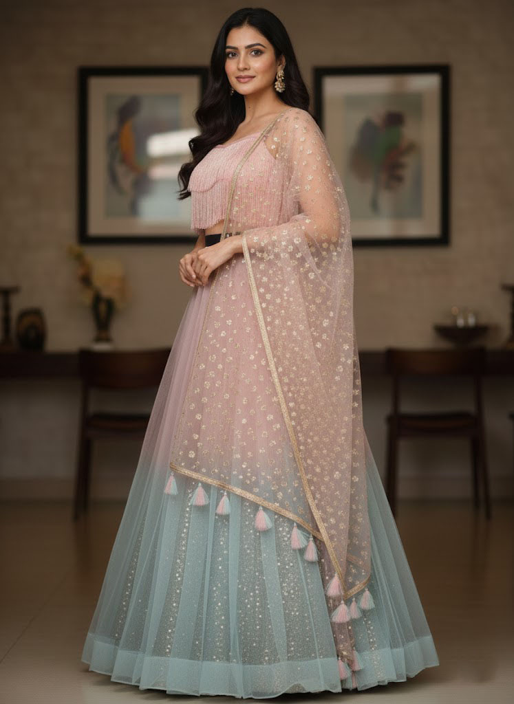 LEHENGA(BOTTOM)FABRIC:- NETFABRICINNER:- CHINA GLITTERING FABRICSTITCH:- SEMI STITCHEDSIZE:- 42HEIGHT AND 42WAISTFLAIR:- 5 METER FLAIRCOLOR:- MULTI COLOR HALF AND HALF, PINK AND GRAY CHOLI(TOP)FABRIC:- CHINA GLITTERING FABRIC WITH JHALARSIZE:- 0.80 METER FABRICSTITCH:- UN STITCHED FABRICCOLOR:- PINK COLOR FABRICDUPATTAFABRIC:- NET FABRICWORK:- 3MM SEQUINS EMBROIDERY WORK WITH NWT TASSELSSIZE:- 2.25 METER DUPATTASTITCH:- FULL STITCHEDCOLOR:- PINK COLOR ADDITIONALWASH CARE: - DRY CLEAN ONLYCOLOR: - PRODUCT COLOR MAY SLIGHTLY VARY DUE TO PHOTOGRAPHIC LIGHTNING SOURCES OR YOUR DEVICE DISPLAY SETTINGSTHESE ARE MADE TO ORDER DESIGNER STYLES, HENCE EXPECT A SLIGHT VARIATION FROM THE IMAGE DISPLAYEDIN THE BOX 1 PIECE LEHENGA 1 PIECE DUPATTA 1 PIECE BLOUSE FABRIC.