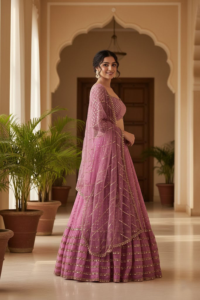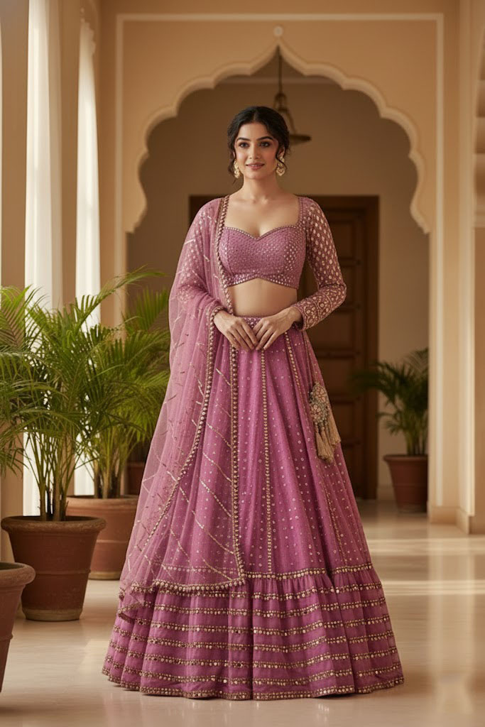 LEHNGA(BOTTOM): -FABRIC: - FAUX GEORGETTEINNER: - MICRO FABRICWORK: - 3MM, 5MM AND 9MM SEQUINS WITH ZARI EMBROIDERY WORKSTITCH: - SEMI STITCHED WITH CANCAN AND CANVASSIZE: - 42 HEIGHT AND 42 WAIST FLAIR: - 4 METERCHOLI(TOP): -FABRIC: - FAUX GEORGETTESIZE: - 0.70 METER CHOLI ALLOVER EMBOIDERED FABRIC 0.40 METER SLEEVES ALLOVER EMBROIDERED FABRICWORK: - 5MM SEQUINS EMBROIDERY WORK IN BLOUSE, 3MM, 5MM AND 9MM SEQUINS EMBROIDERY WORK IN SLEEVES STITCH: - UNSTITCHED FABRICDUPATTA: -FABRIC: - NETWORK: - 5MM, 9MM SEQUENCE AND JARI EMBROIDERY WORK SIZE: - 2.25 METER DUPATTASTITCH: - FULL STITCHADDITIONALWASH CARE: - DRY CLEAN ONLYCOLOR: - PRODUCT COLOR MAY SLIGHTLY VARY DUE TO PHOTOGRAPHIC LIGHTNING SOURCES OR YOUR DEVICE DISPLAY SETTINGSTHESE ARE MADE TO ORDER DESIGNER STYLES, HENCE EXPECT A SLIGHT VARIATION FROM THE IMAGE DISPLAYEDIN THE BOX 1 LEHENGA 1 DUPATTA 0.70 METER BLOUSE FABRIC 0.40 METER SLEEVES FABRIC (1 SET OF HAND MADE TASSELS)ALTERNATIVEHANDMADE TASSELS MAY DIFFER FROM THE PHOTOS AND VIDEOS. TASSELS WILL BE AVAILABLE AS LONG AS THE CURRENT STOCK LASTS. ALTERNATIVELY, NEW STOCK MAY TAKE SOME TIME TO ARRIVE. WE ARE NOT STRICTLY BOUND TO PROVIDE TASSELS.