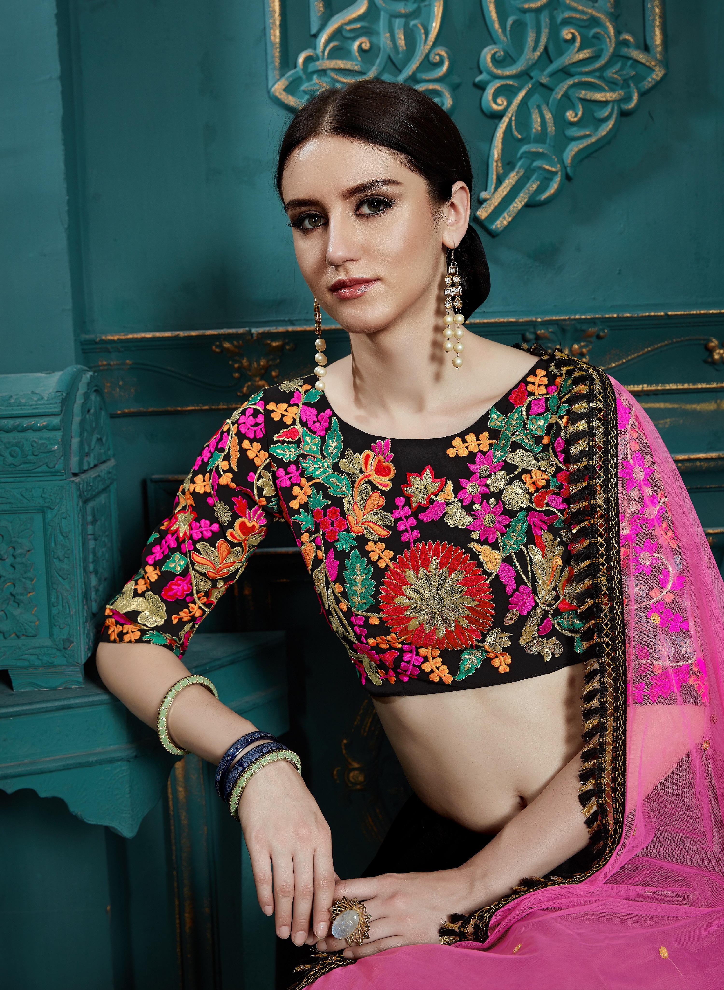 Womens Black Faux Georgette Thread Embroidery Lehenga Set