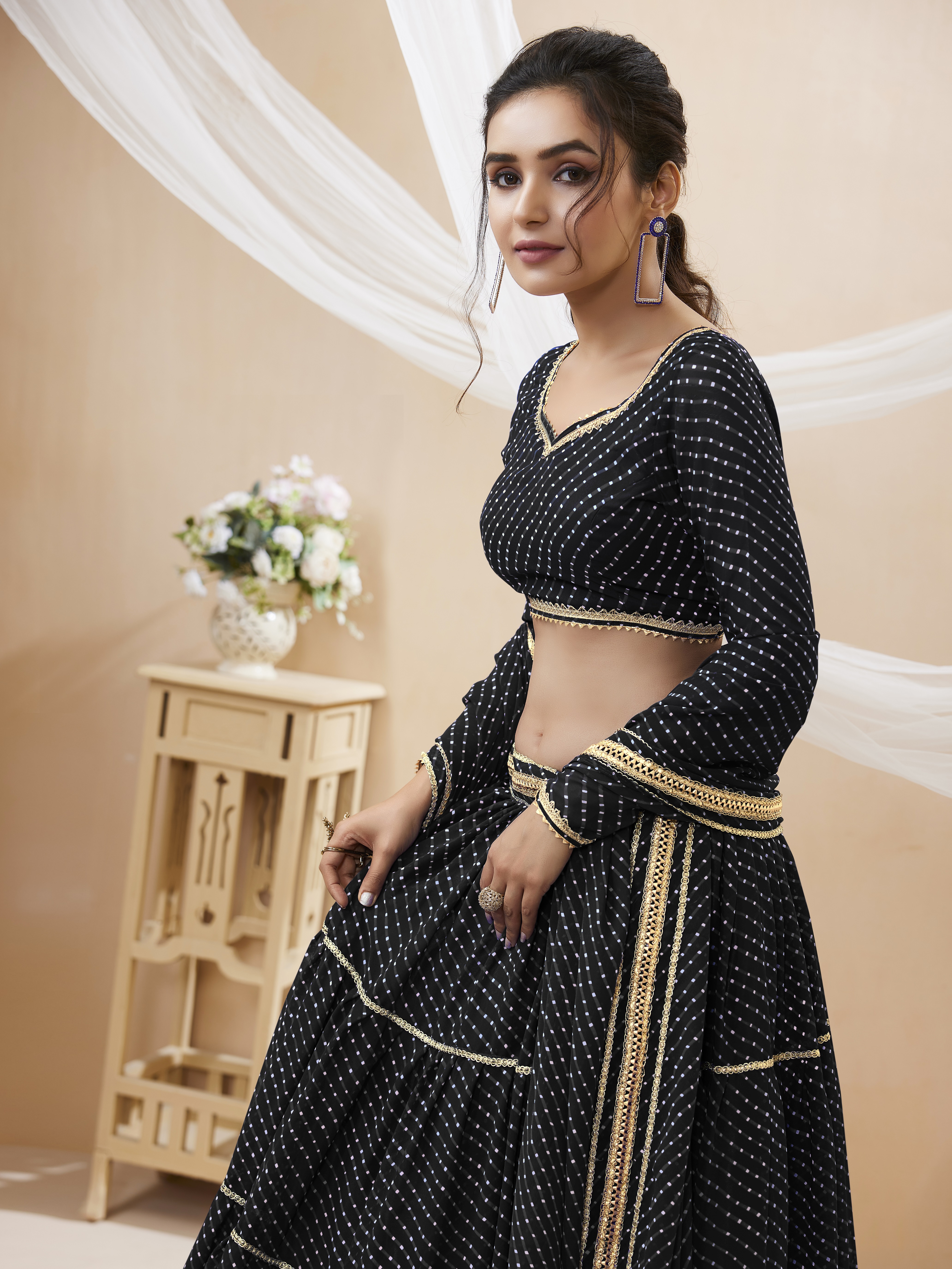 Elevate your ethnic look with this black georgette lehenga featuring lehariya work. Designed for festive occasions and celebrations, it offers a graceful flow and timeless appeal.Crafted from lightweight georgette fabric with a semi-stitched finish, this lehenga ensures comfort and easy customization. Dry clean recommended.