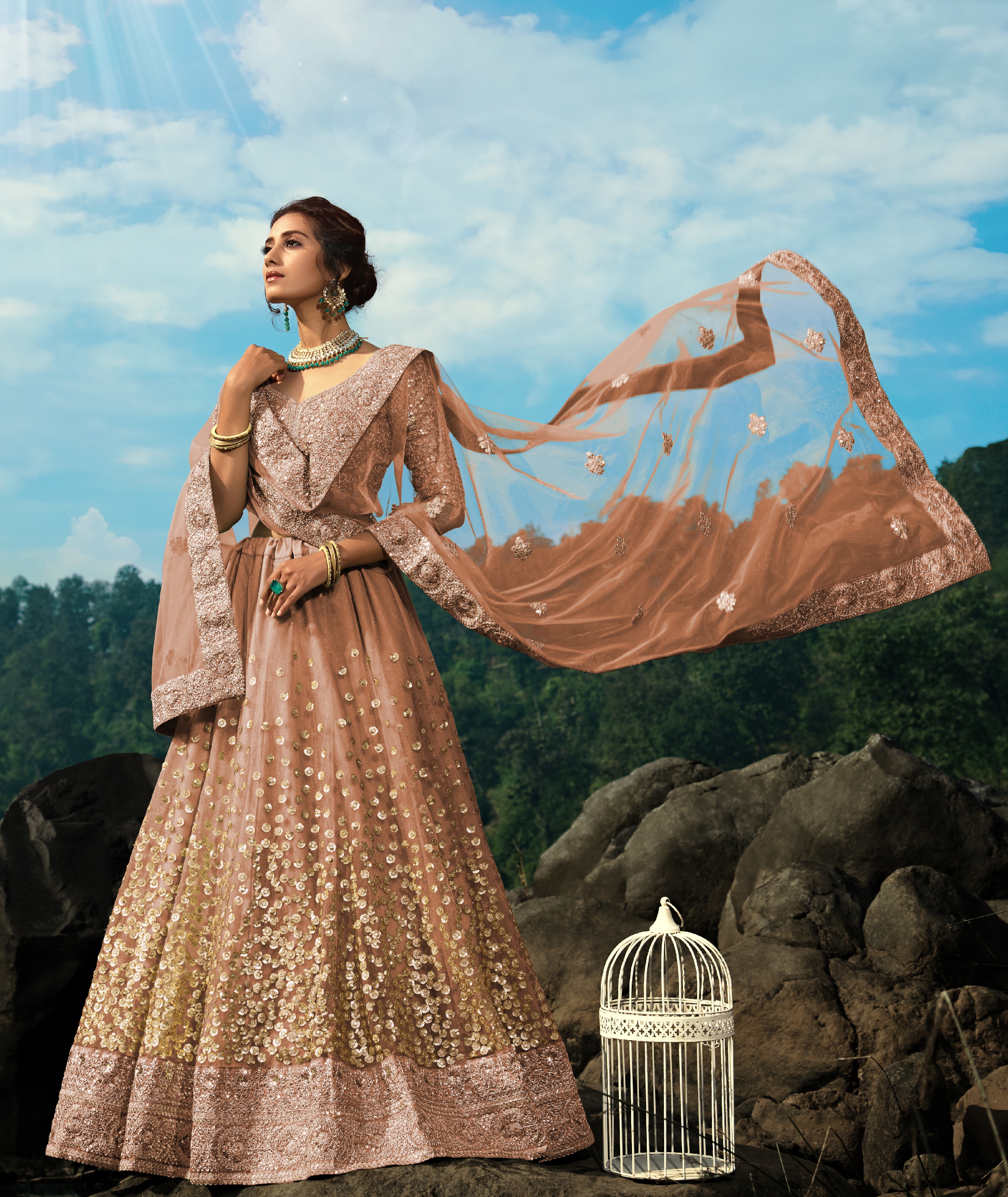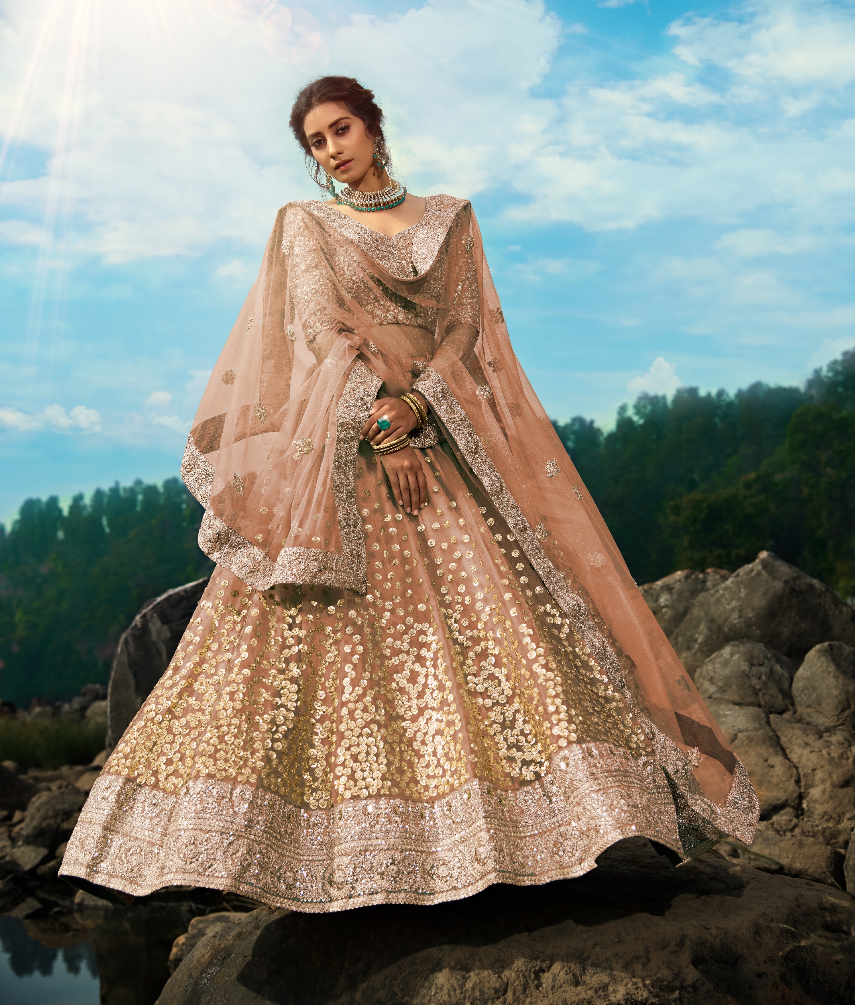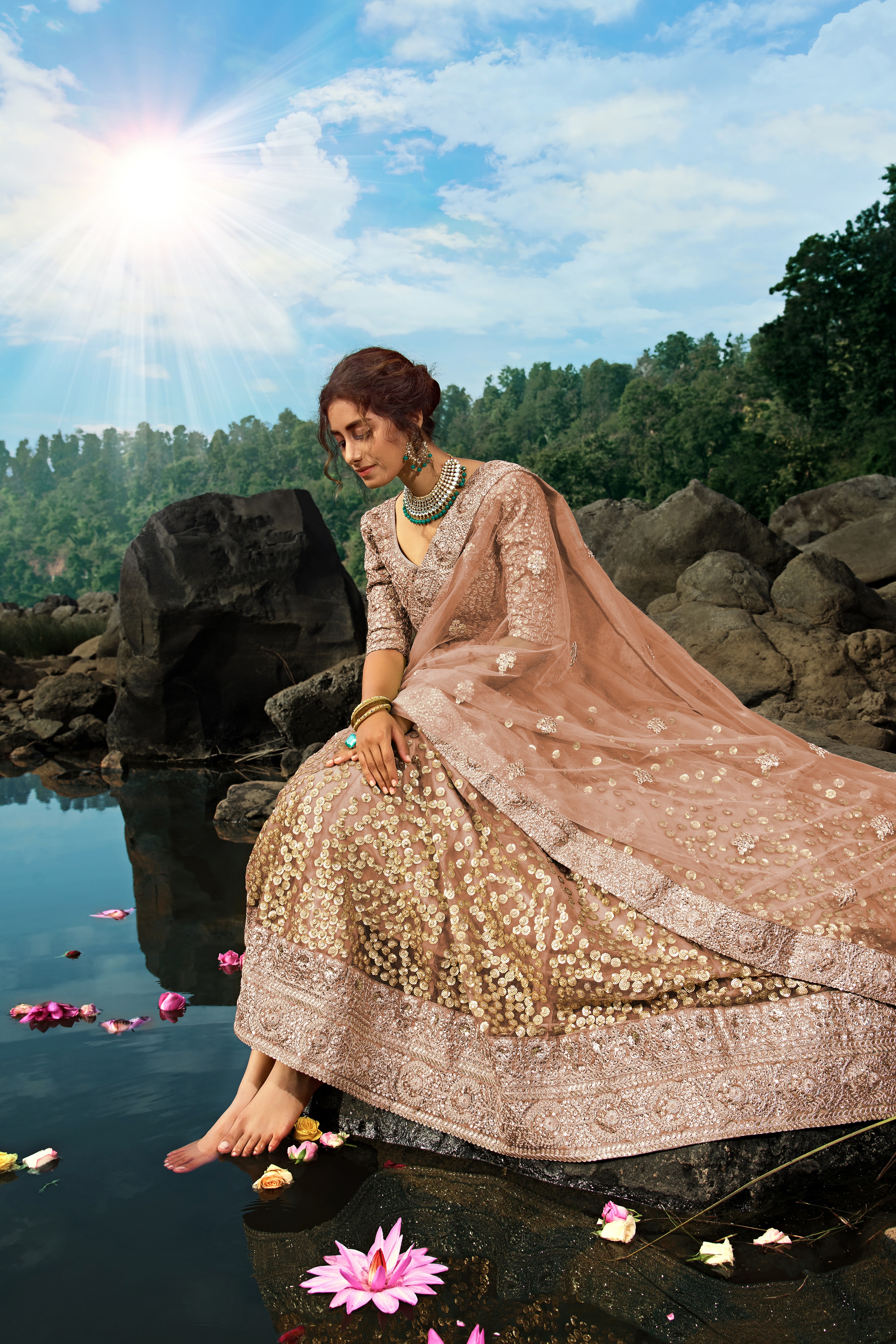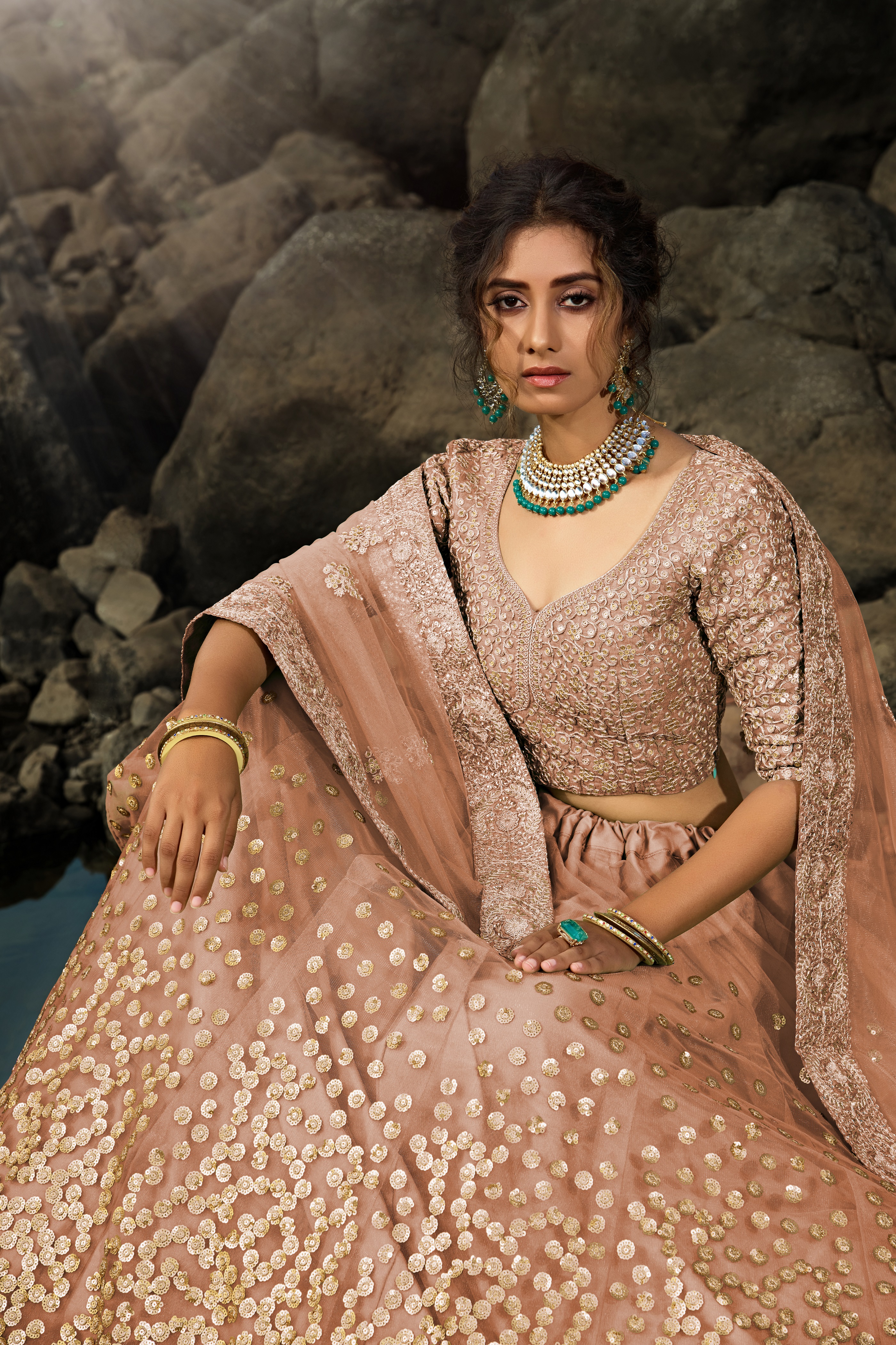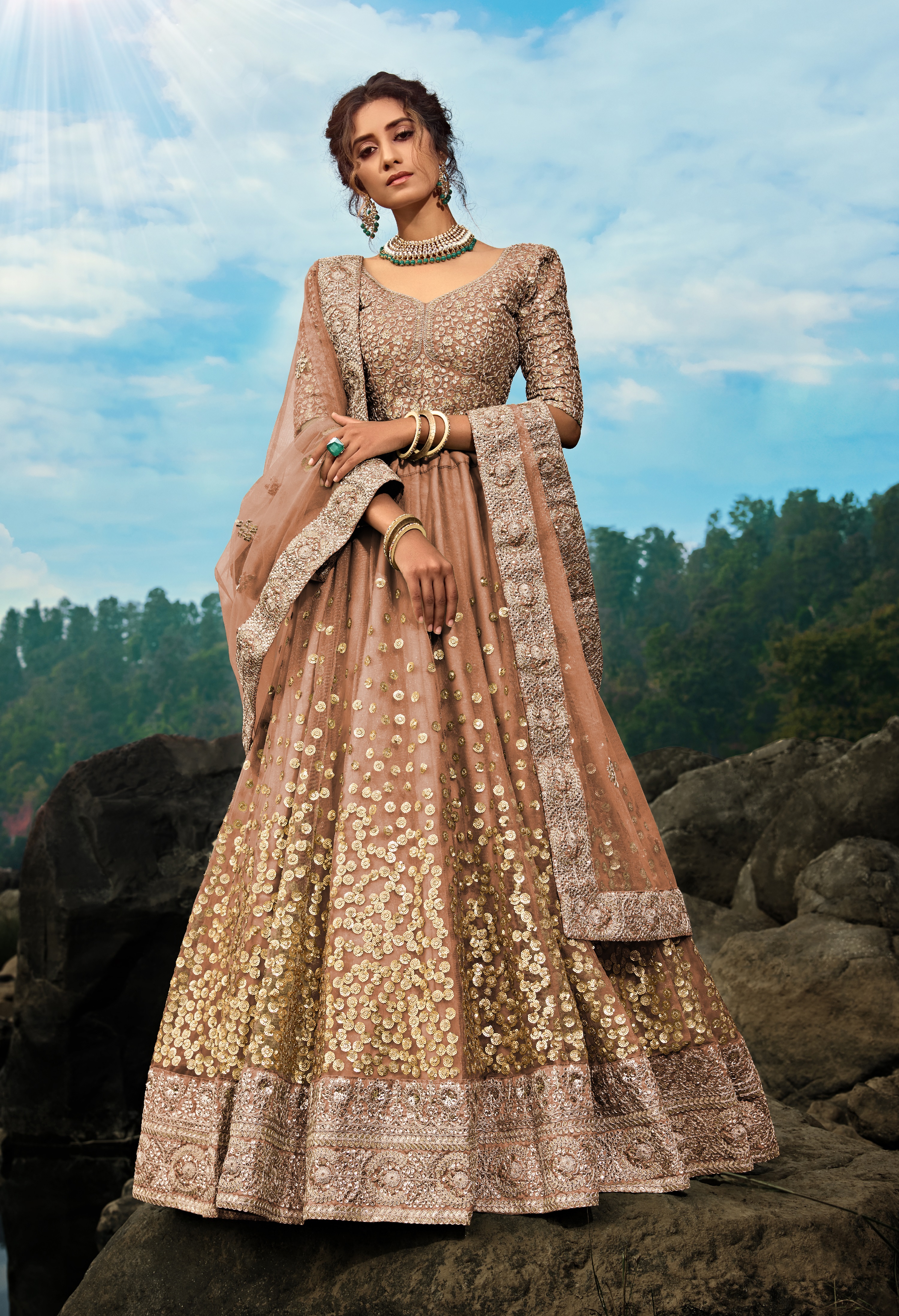 Elevate your ethnic look with this brown net lehenga featuring sequience work work. Designed for festive occasions and celebrations, it offers a graceful flow and timeless appeal.Crafted from lightweight net fabric with a semi-stitched finish, this lehenga ensures comfort and easy customization. Dry clean recommended.