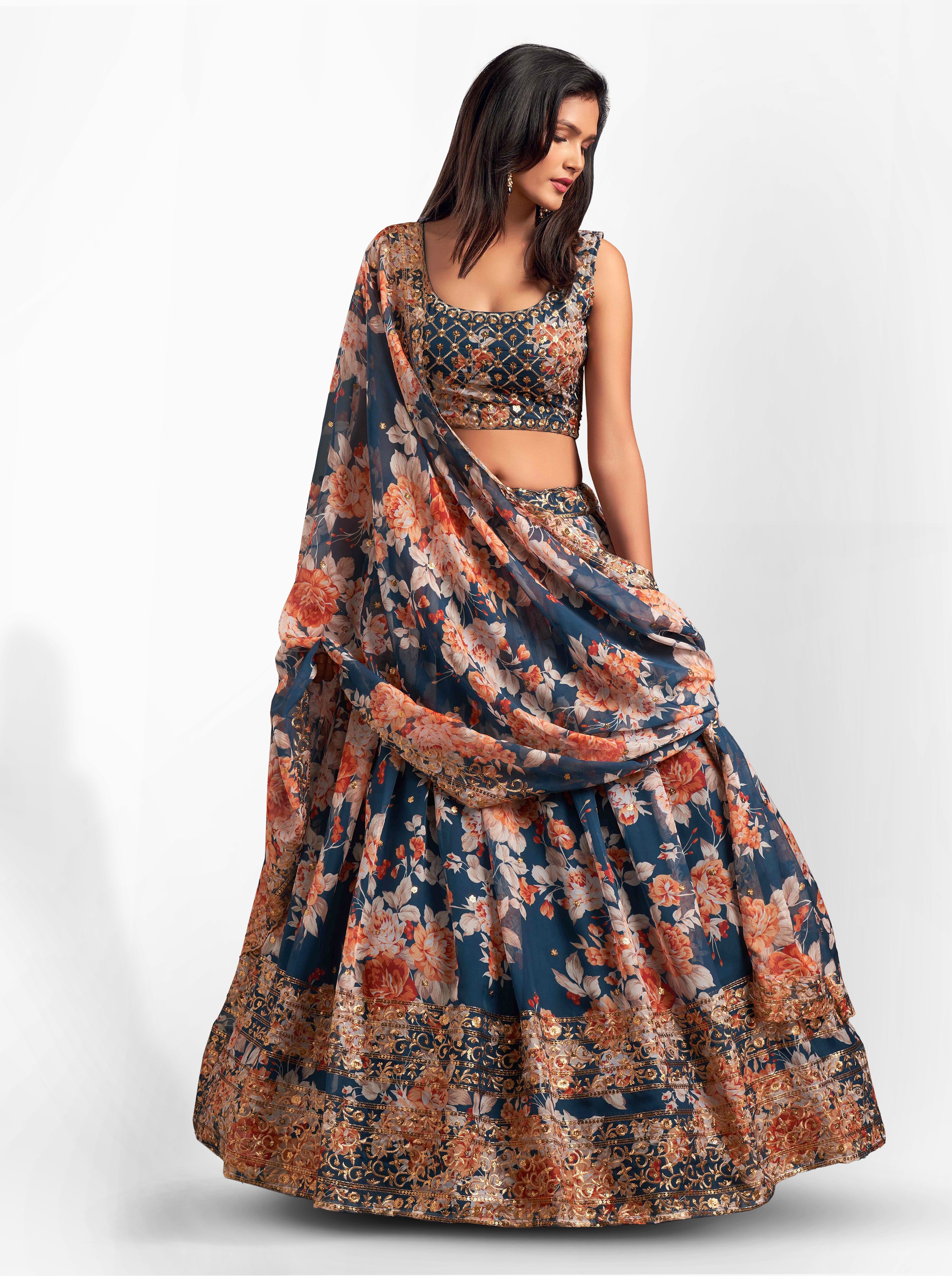 Womens Dove Blue Organza Sequence Work,Floral Work Embroidery Lehenga Set