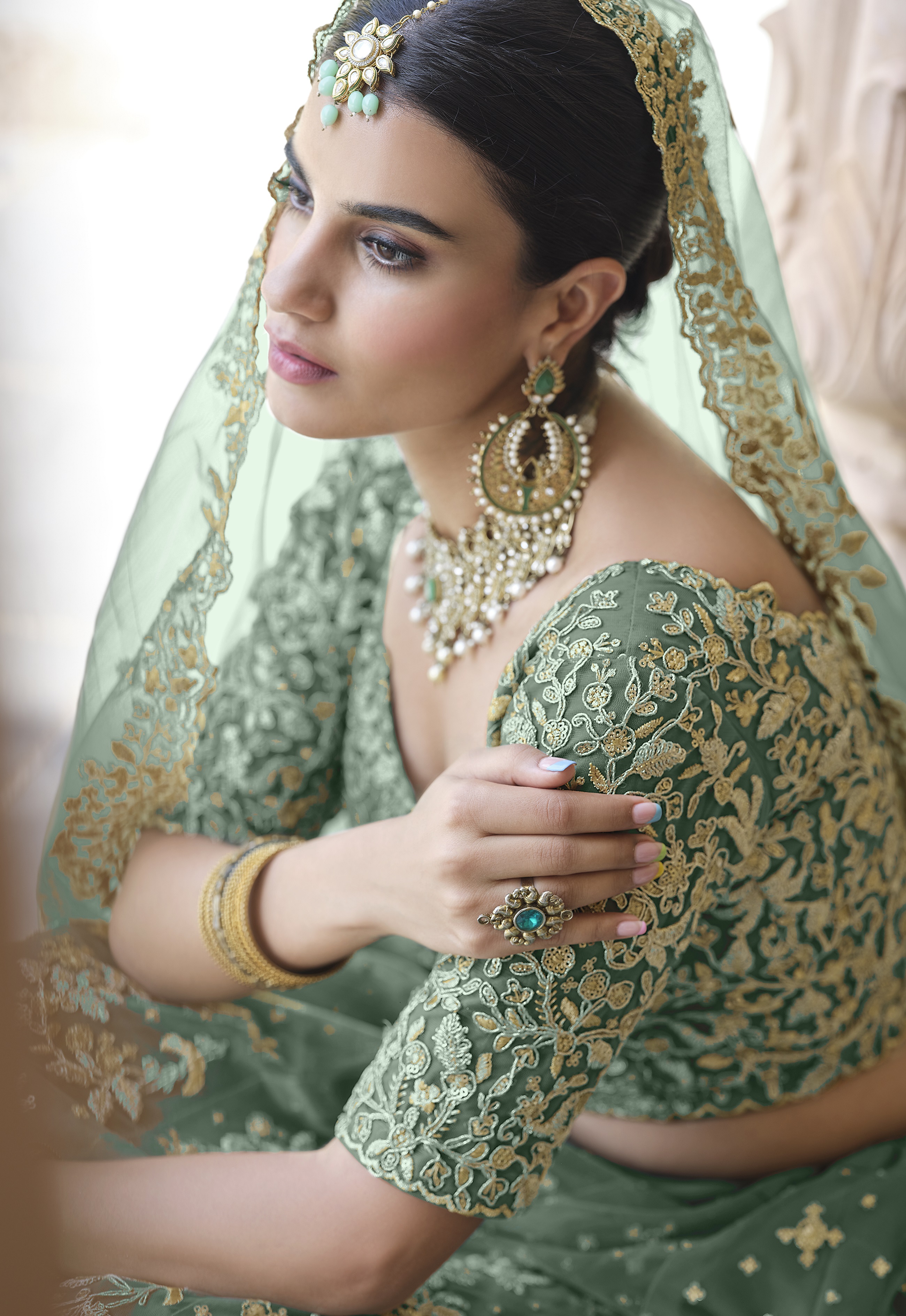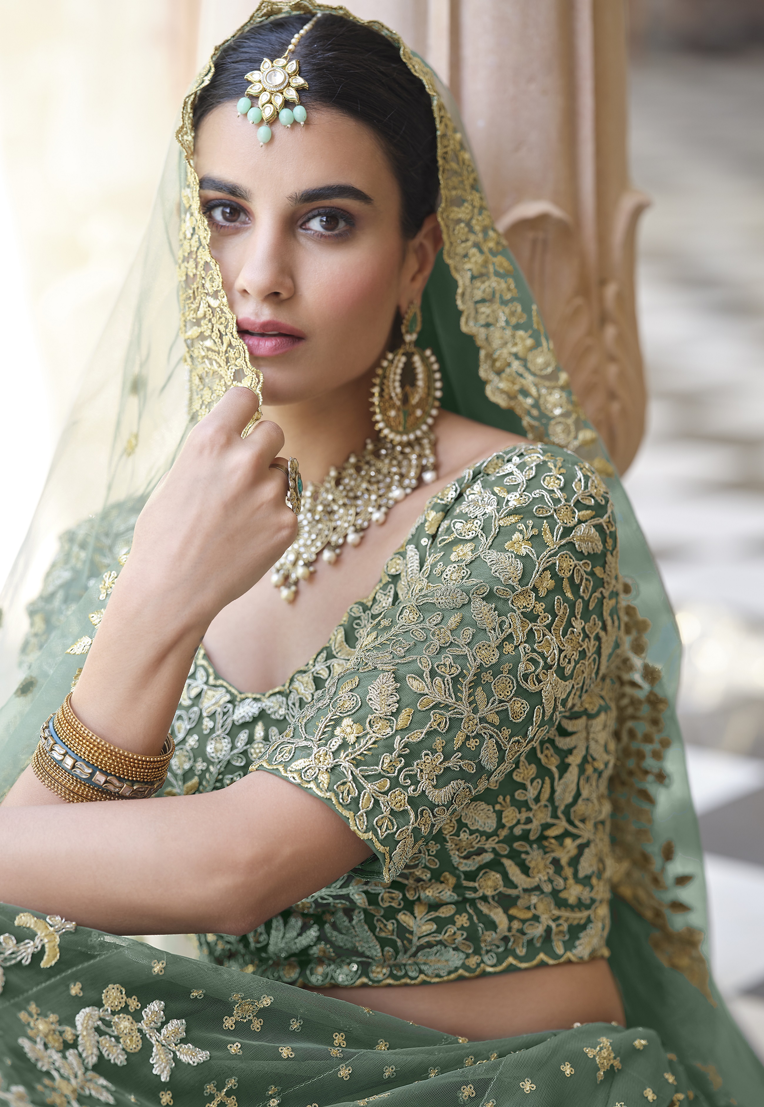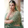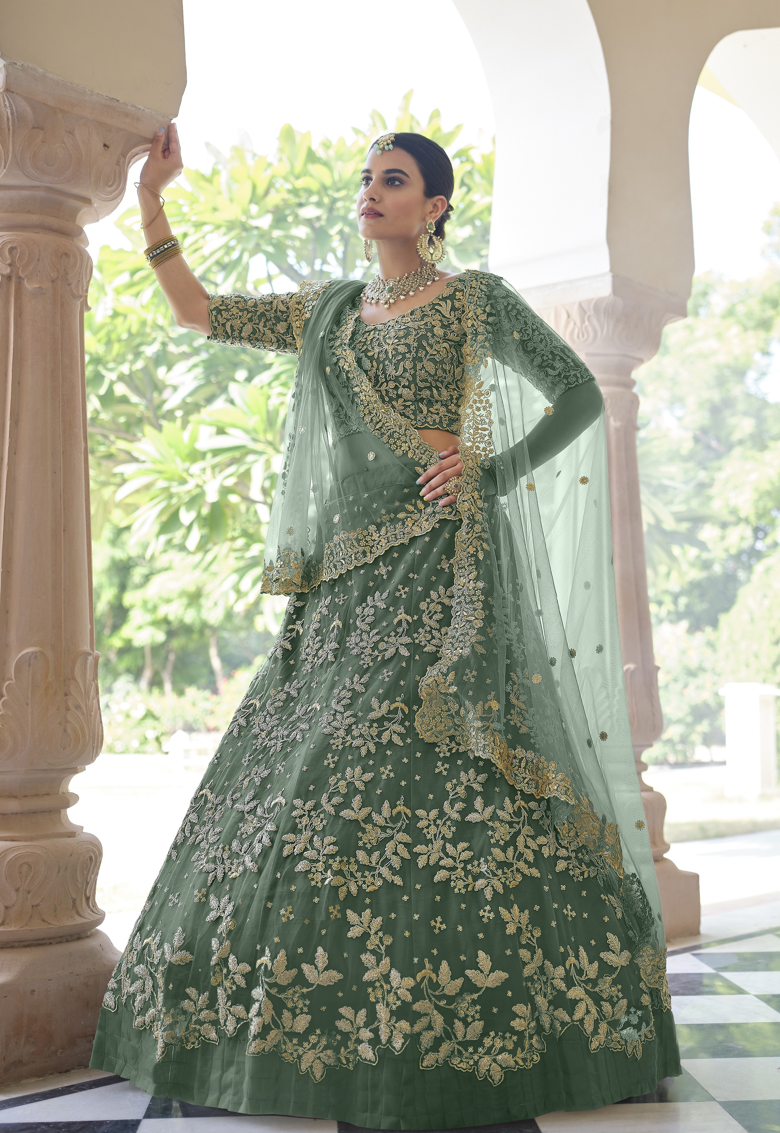 Elevate your ethnic look with this green net lehenga featuring zari work work. Designed for festive occasions and celebrations, it offers a graceful flow and timeless appeal.Crafted from lightweight net fabric with a semi-stitched finish, this lehenga ensures comfort and easy customization. Dry clean recommended.