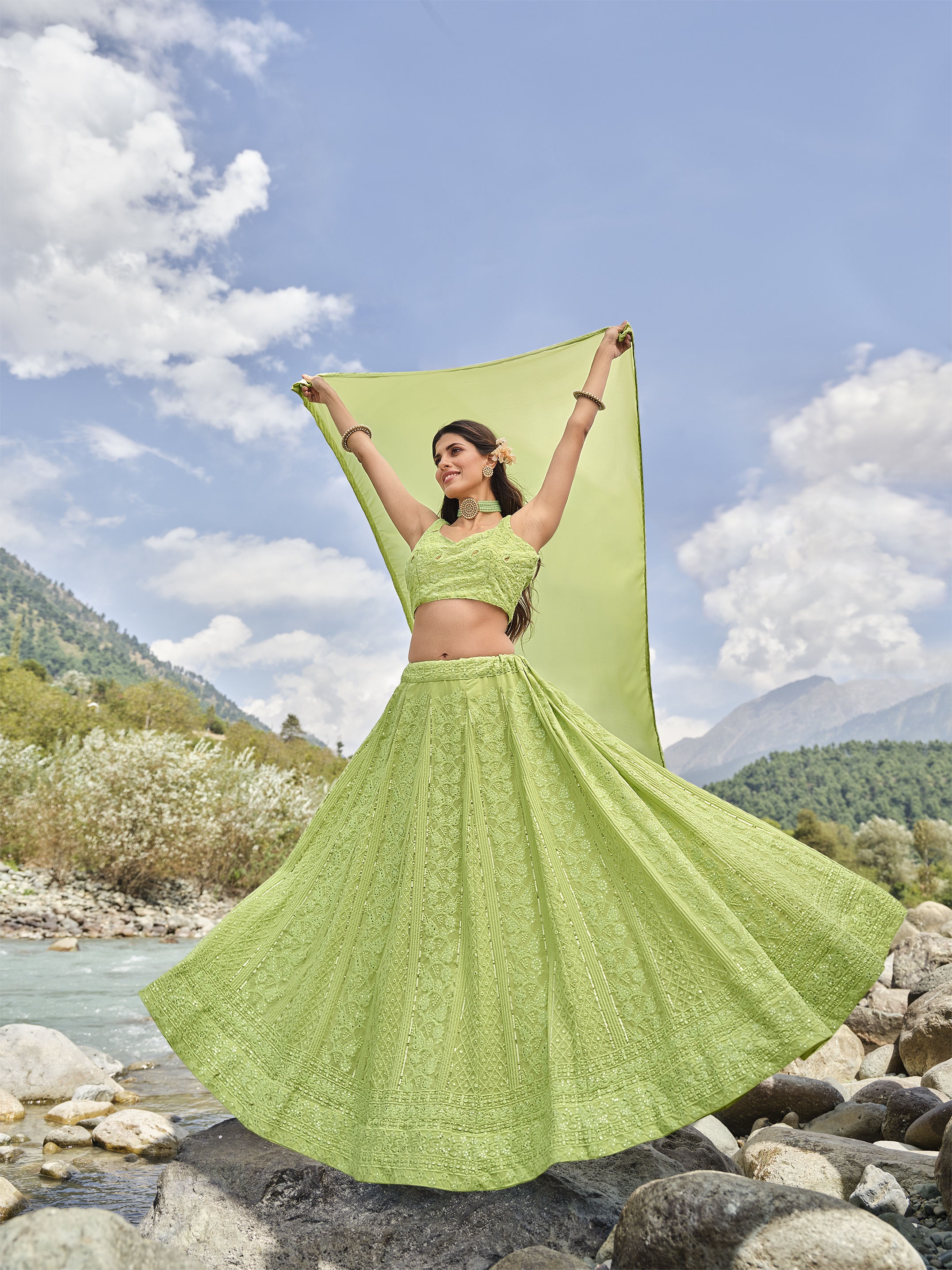 Womens Light Green Faux Georgette Thread Embroidery Lehenga Set