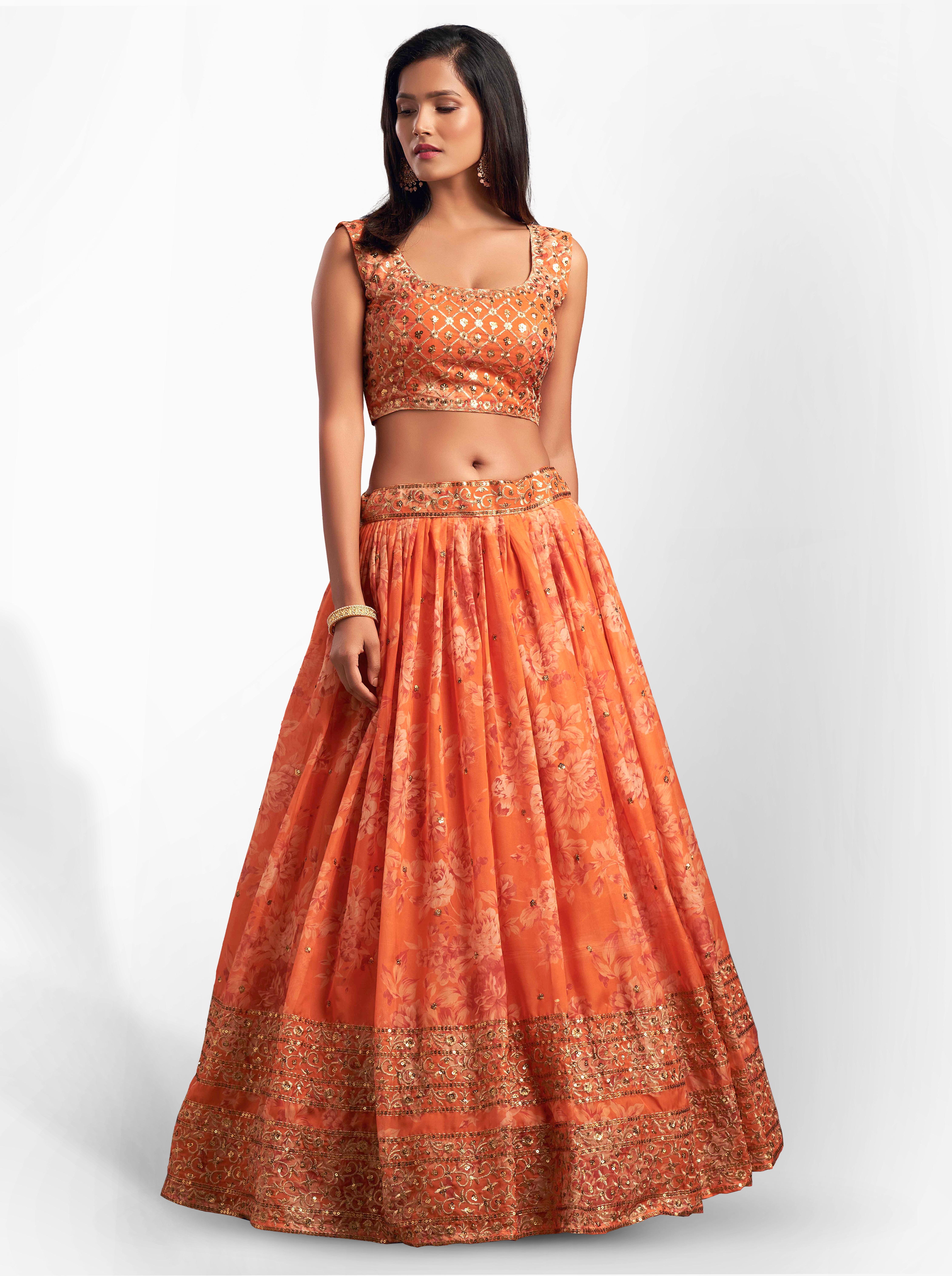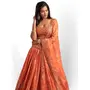 Elevate your ethnic look with this orange organza lehenga featuring sequence work,floral work embroidery work. Designed for festive occasions and celebrations, it offers a graceful flow and timeless appeal.Crafted from lightweight organza fabric with a semi-stitched finish, this lehenga ensures comfort and easy customization. Dry clean recommended.