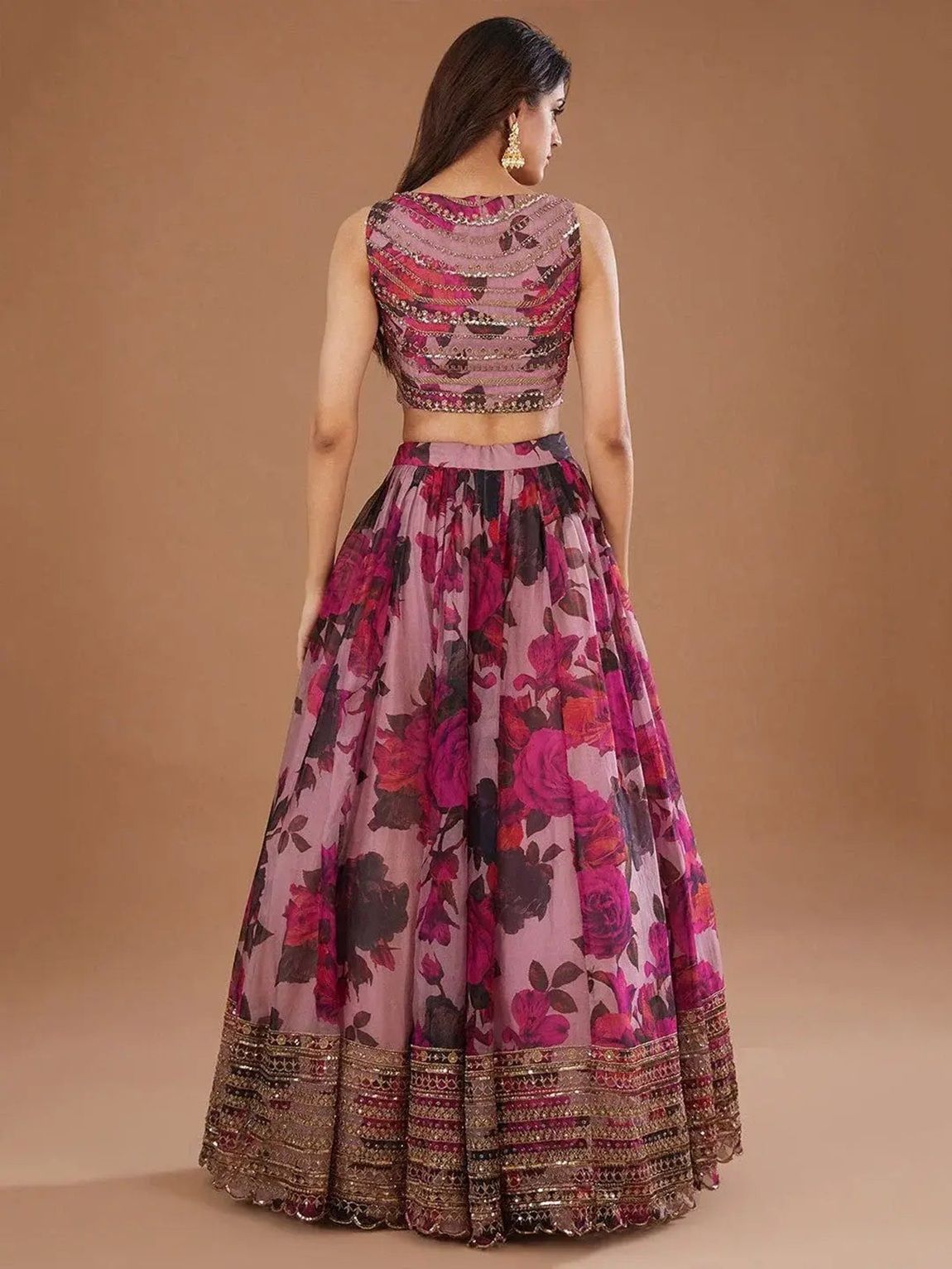 Elevate your ethnic look with this pink organza lehenga featuring sequence work,floral work embroidery work. Designed for festive occasions and celebrations, it offers a graceful flow and timeless appeal.Crafted from lightweight organza fabric with a semi-stitched finish, this lehenga ensures comfort and easy customization. Dry clean recommended.