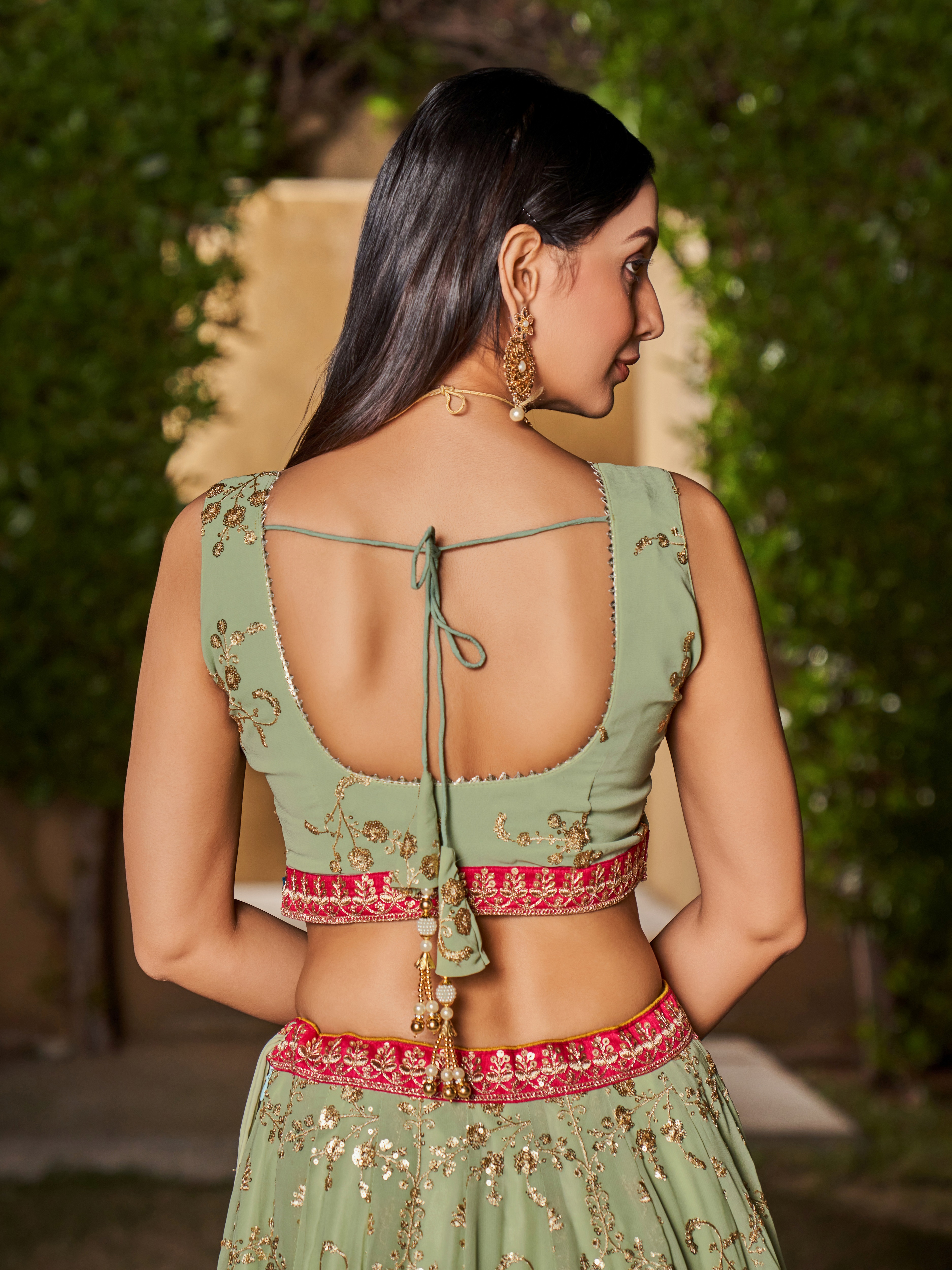 Elevate your ethnic look with this pista green georgette lehenga featuring thread embroidery work. Designed for festive occasions and celebrations, it offers a graceful flow and timeless appeal.Crafted from lightweight georgette fabric with a semi-stitched finish, this lehenga ensures comfort and easy customization. Dry clean recommended.
