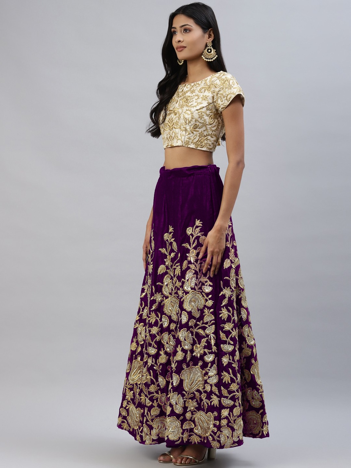 Elevate your ethnic look with this purple velvet lehenga featuring embroidered work. Designed for festive occasions and celebrations, it offers a graceful flow and timeless appeal.Crafted from lightweight velvet fabric with a semi-stitched finish, this lehenga ensures comfort and easy customization. Dry clean recommended.