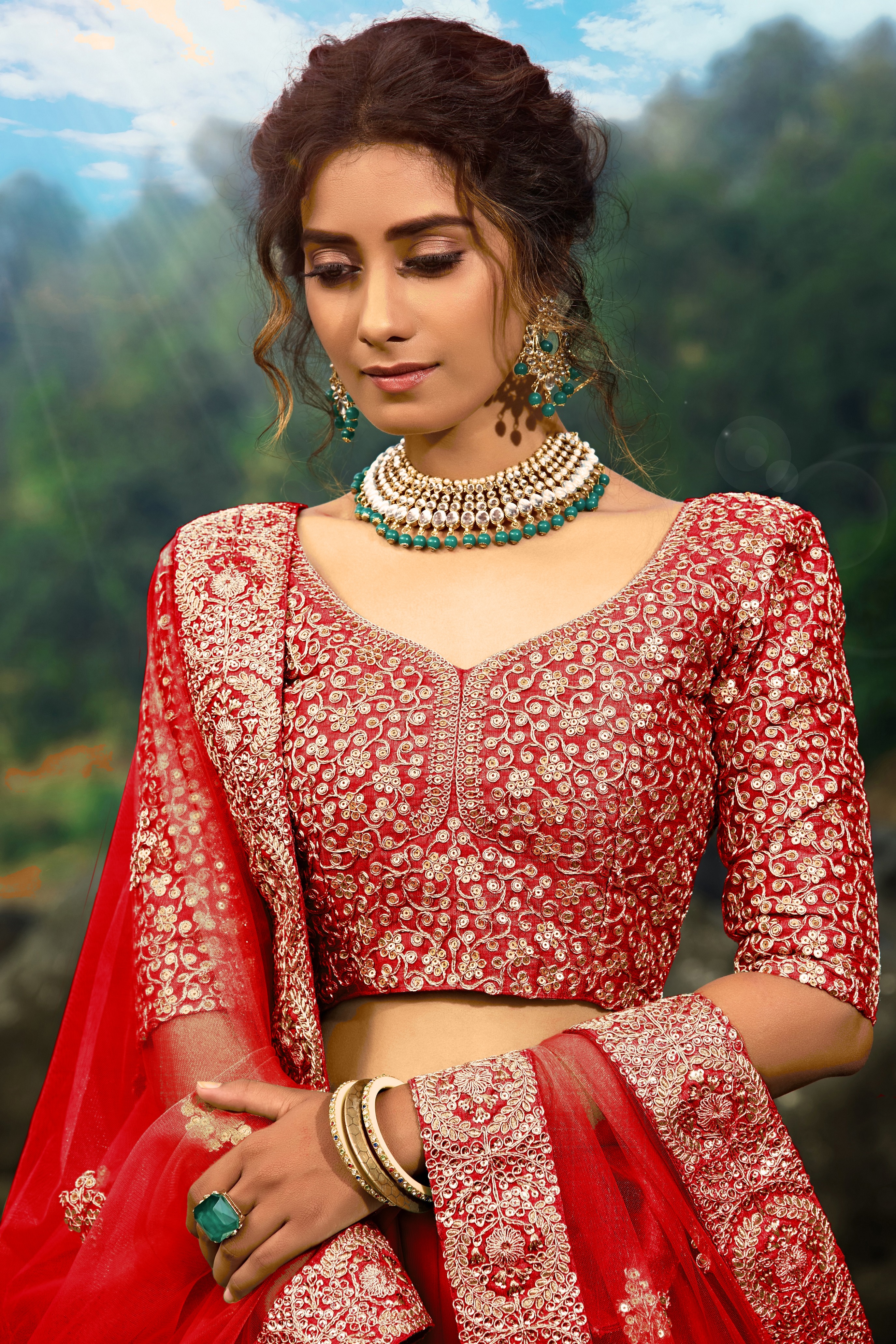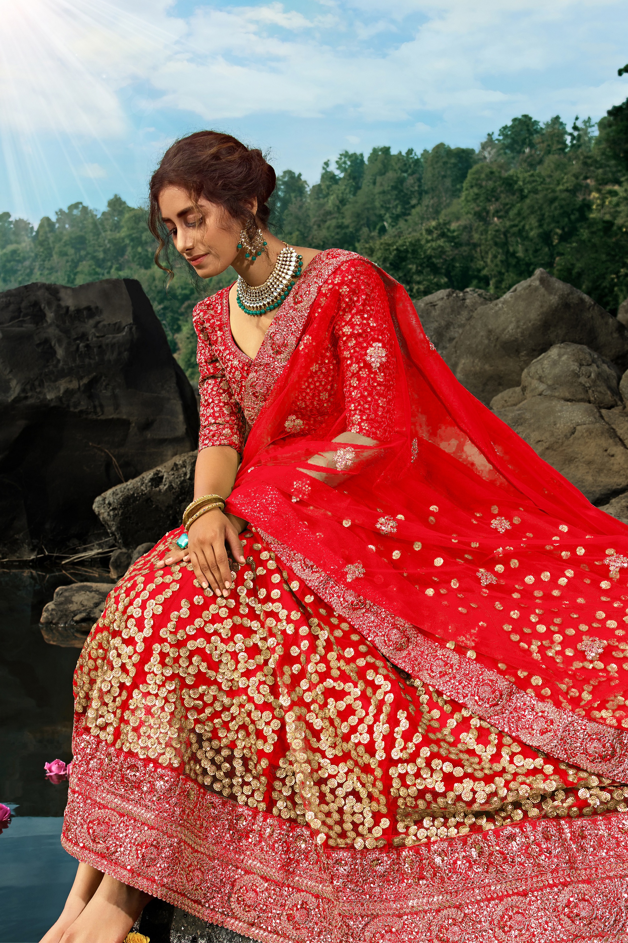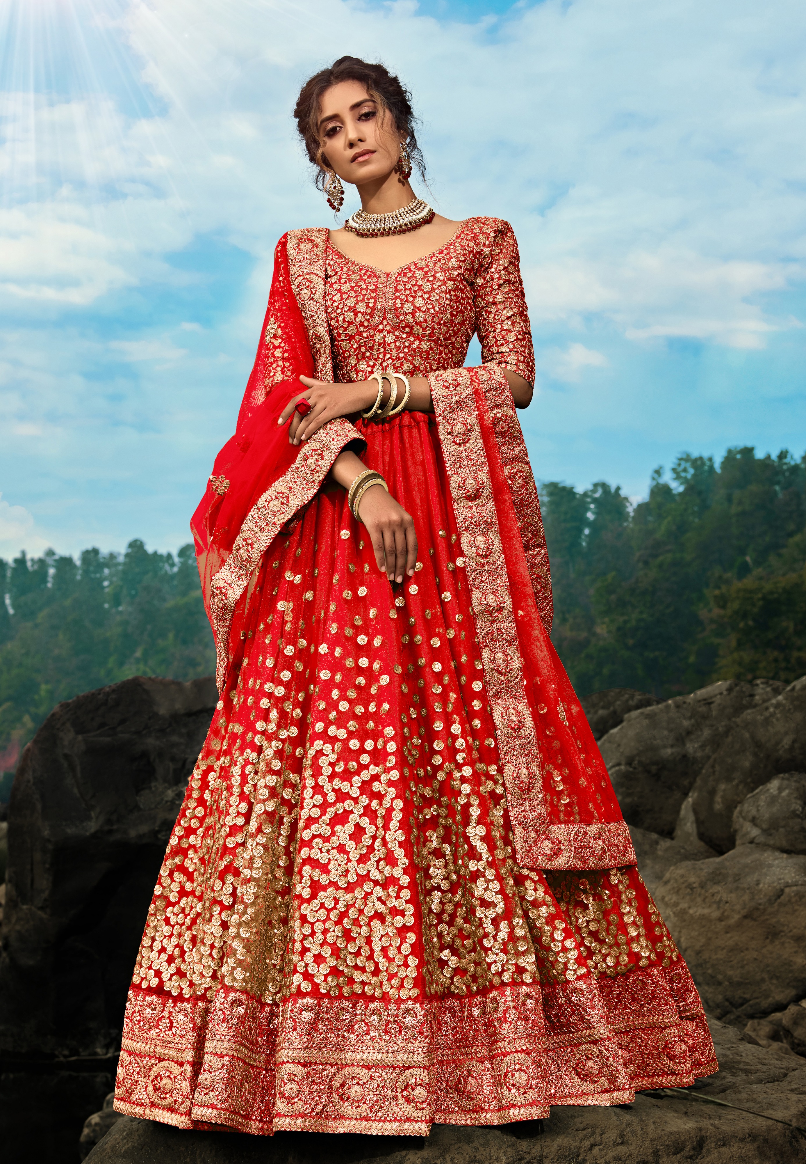 Elevate your ethnic look with this red net lehenga featuring sequience work work. Designed for festive occasions and celebrations, it offers a graceful flow and timeless appeal.Crafted from lightweight net fabric with a semi-stitched finish, this lehenga ensures comfort and easy customization. Dry clean recommended.