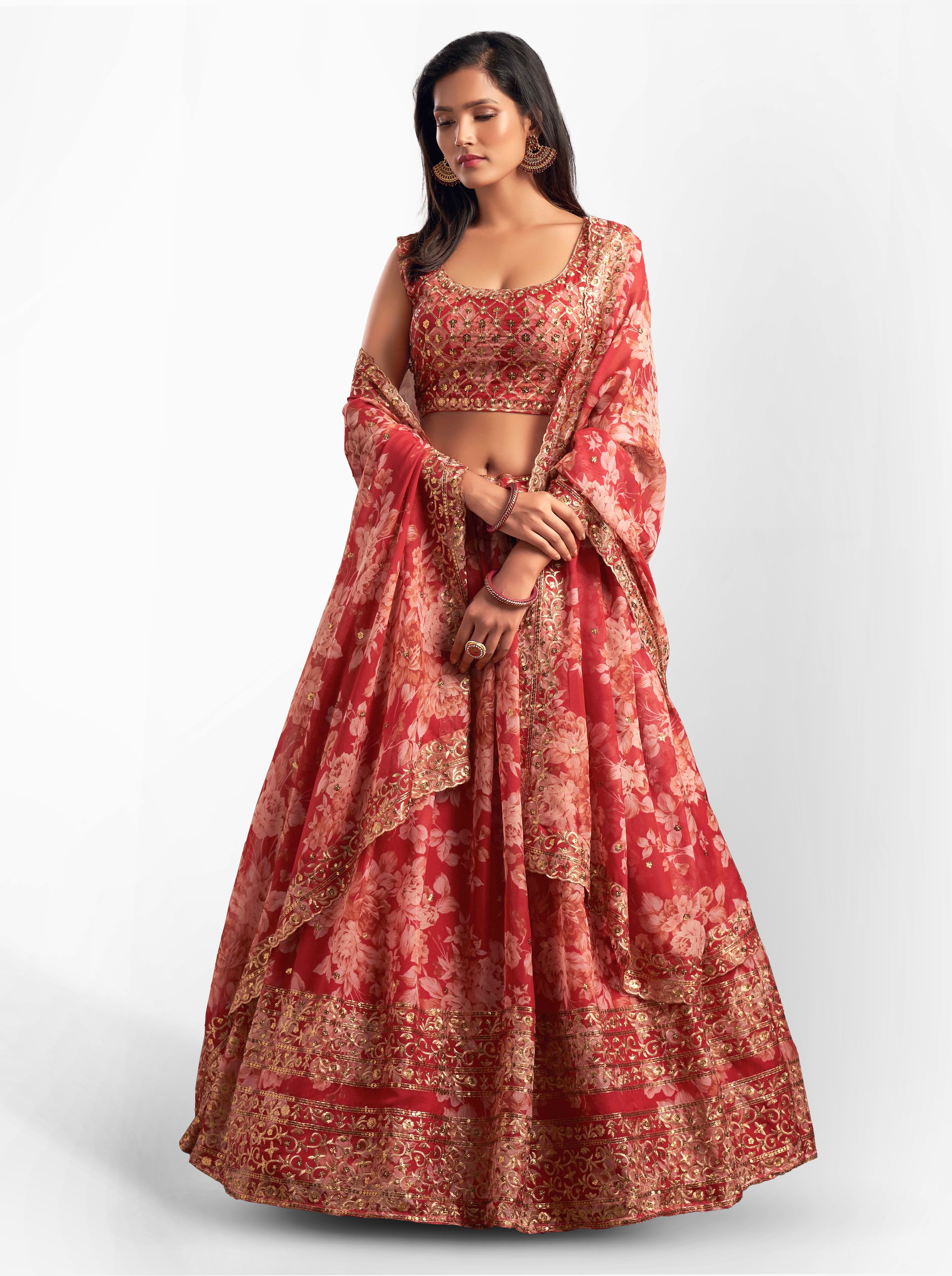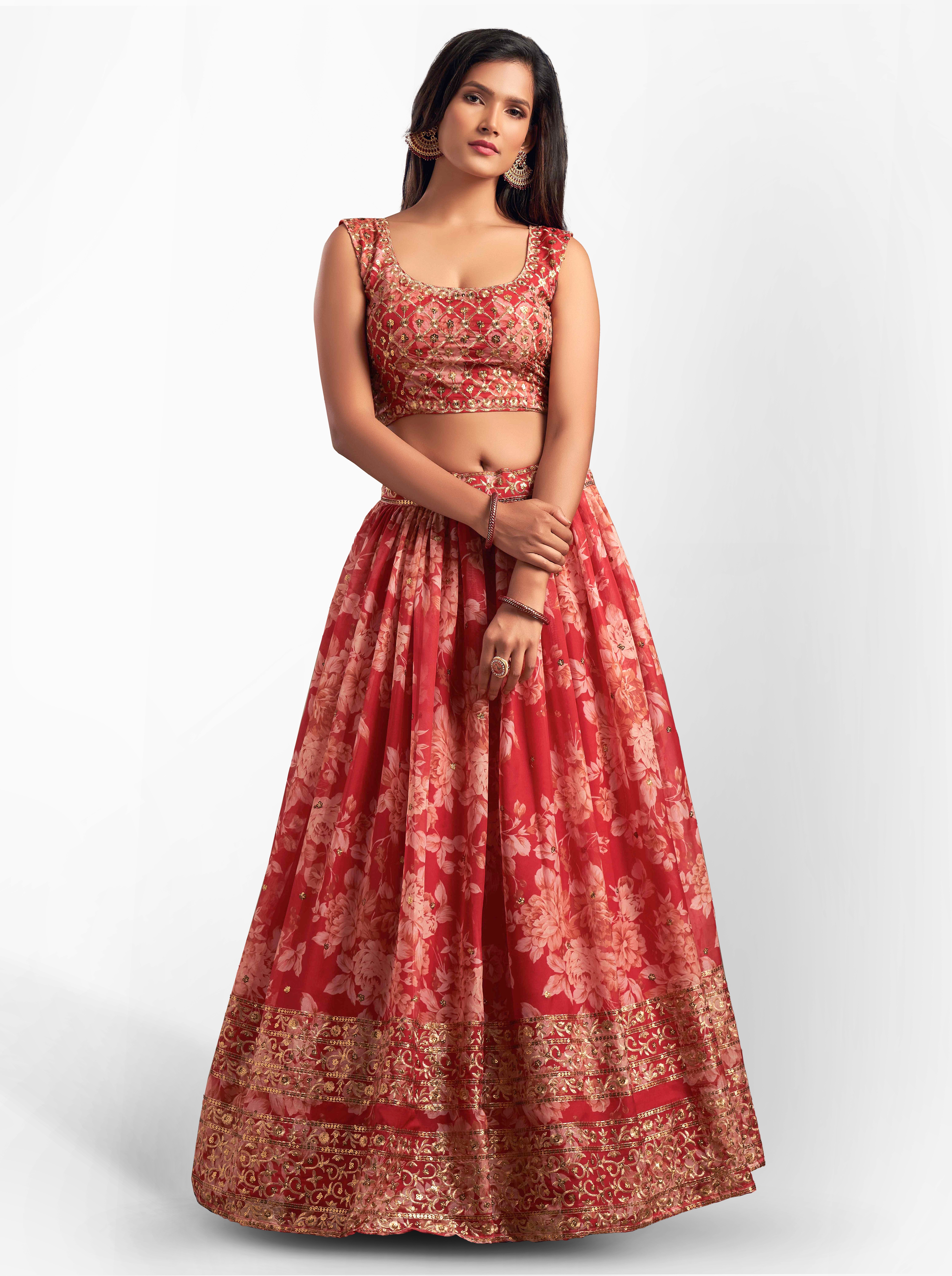 Elevate your ethnic look with this red organza lehenga featuring sequence work,floral work embroidery work. Designed for festive occasions and celebrations, it offers a graceful flow and timeless appeal.Crafted from lightweight organza fabric with a semi-stitched finish, this lehenga ensures comfort and easy customization. Dry clean recommended.