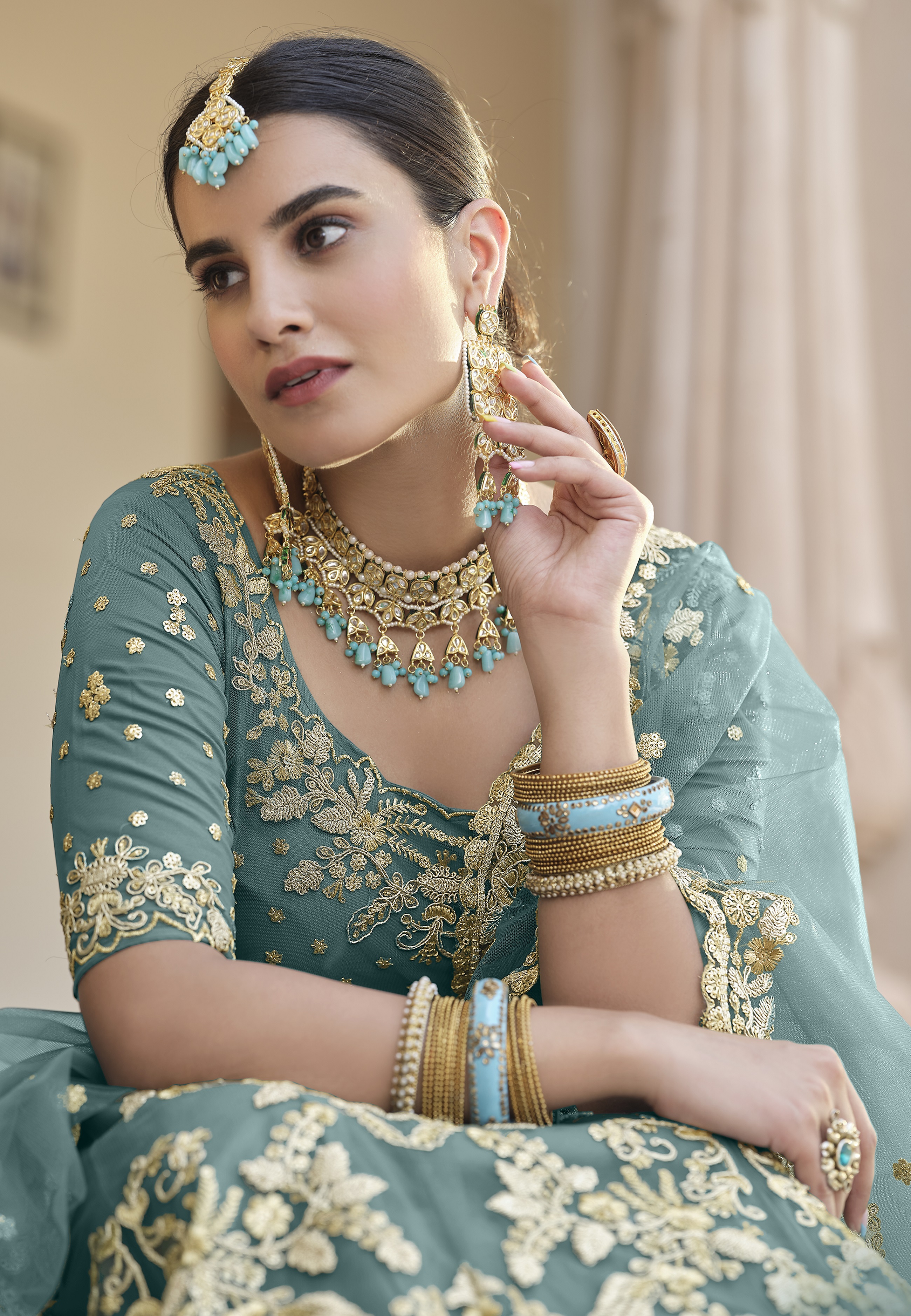 Womens Turquoise Net Zari Work Lehenga Set
