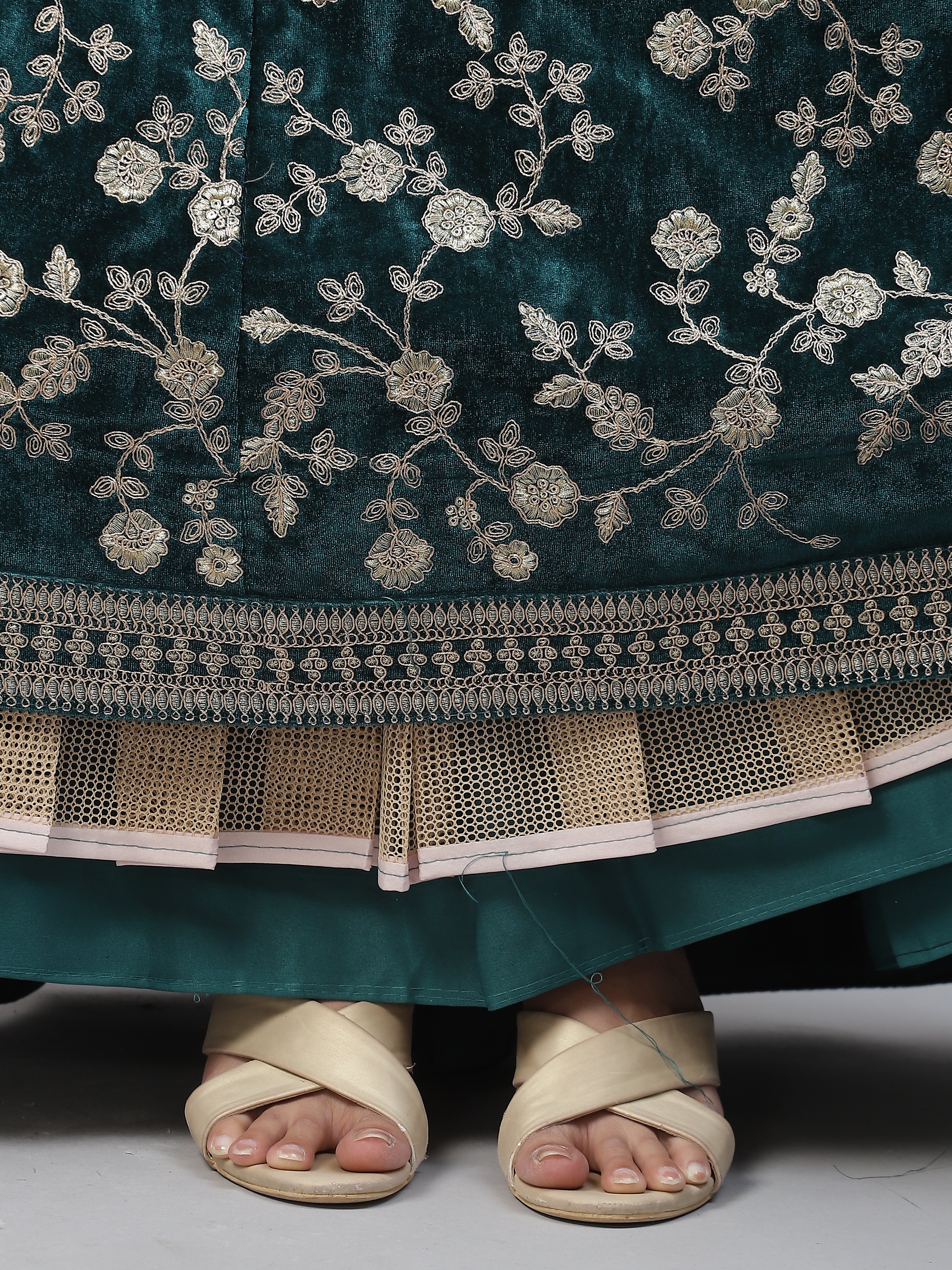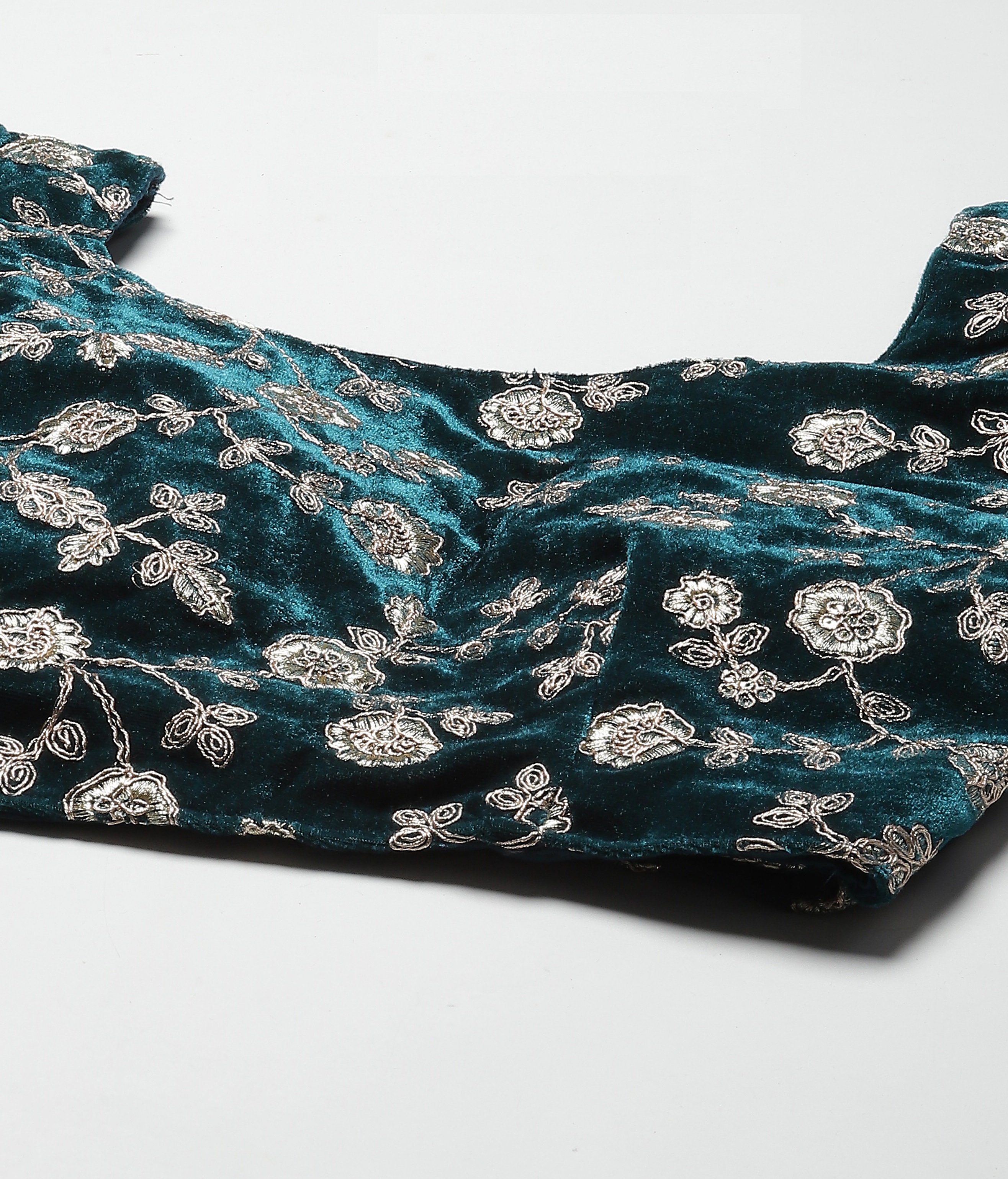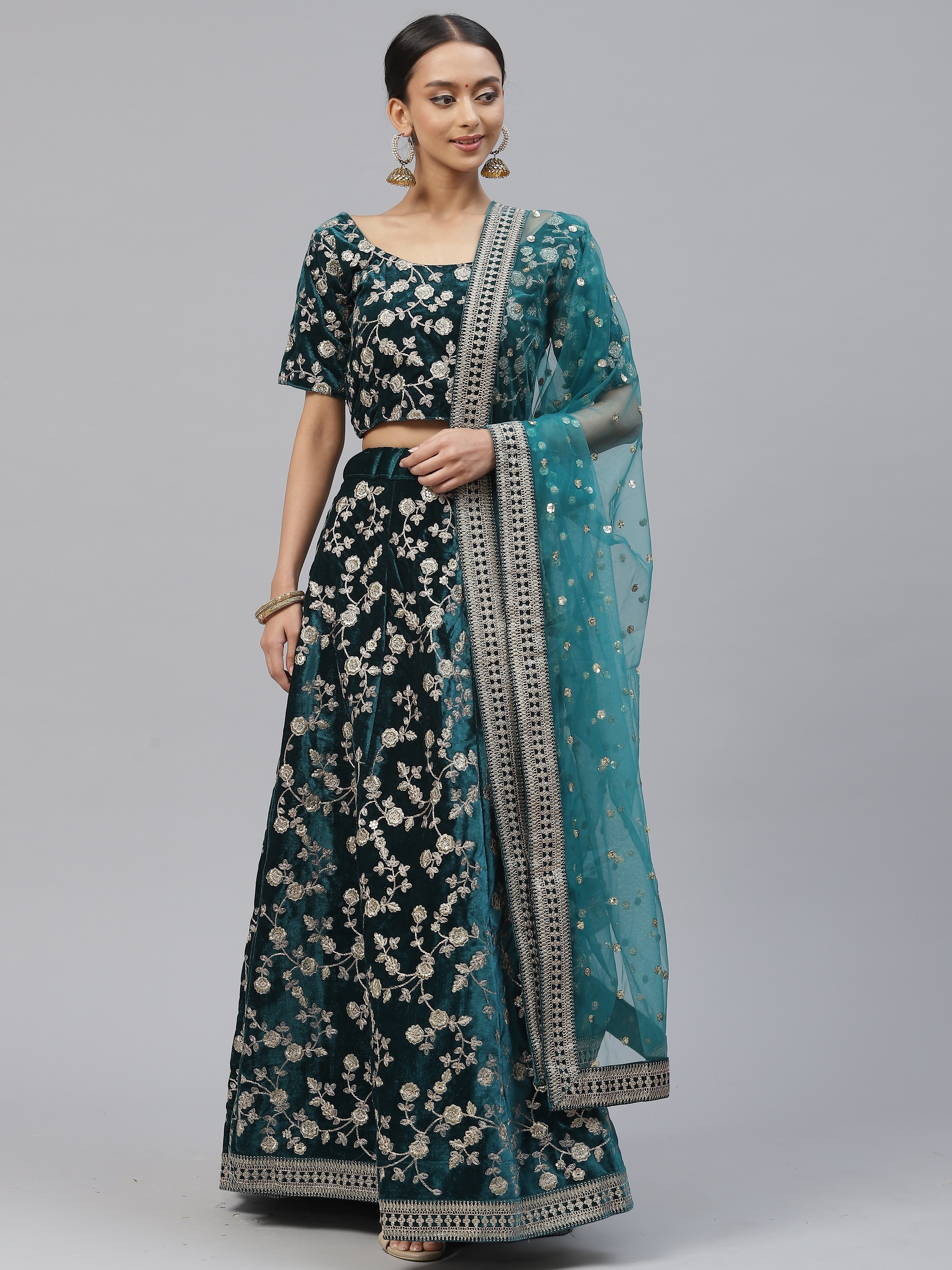 Elevate your ethnic look with this turquoise velvet lehenga featuring dori embroidery work. Designed for festive occasions and celebrations, it offers a graceful flow and timeless appeal.Crafted from lightweight velvet fabric with a semi-stitched finish, this lehenga ensures comfort and easy customization. Dry clean recommended.