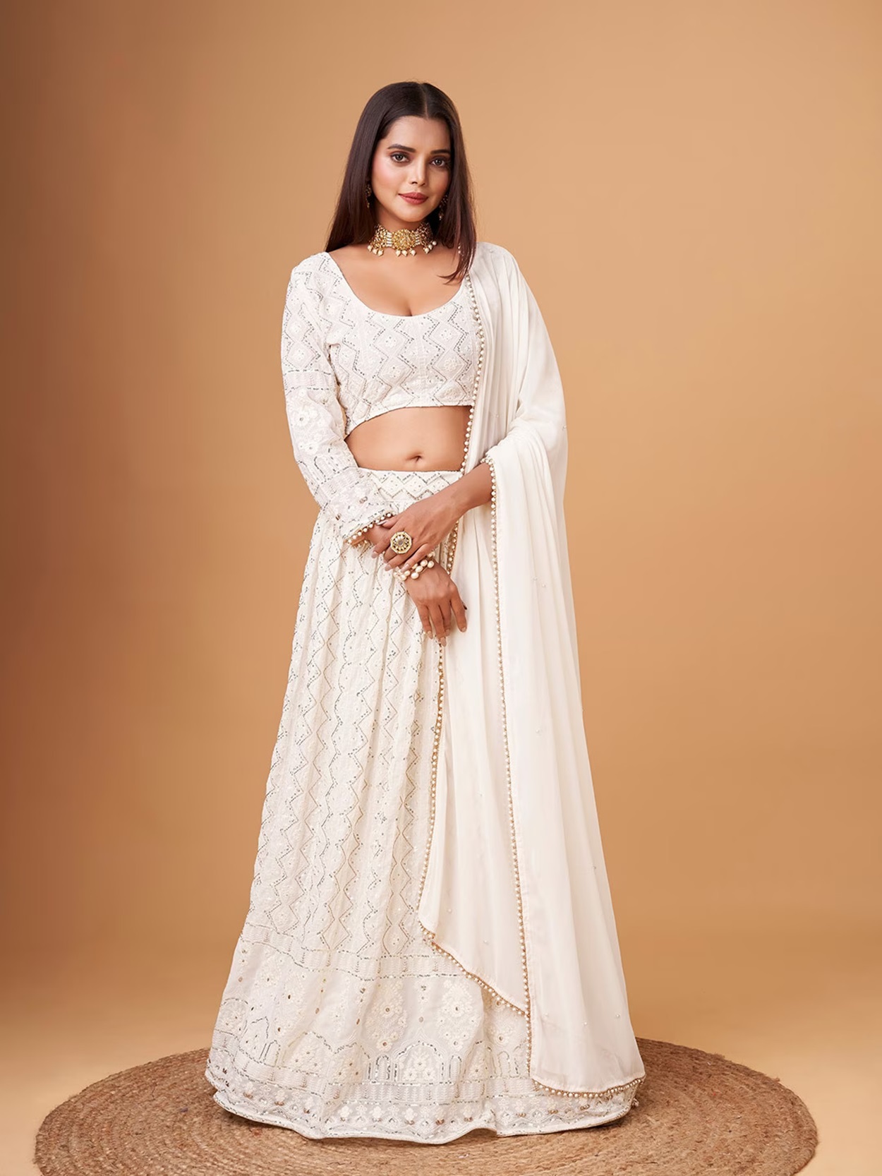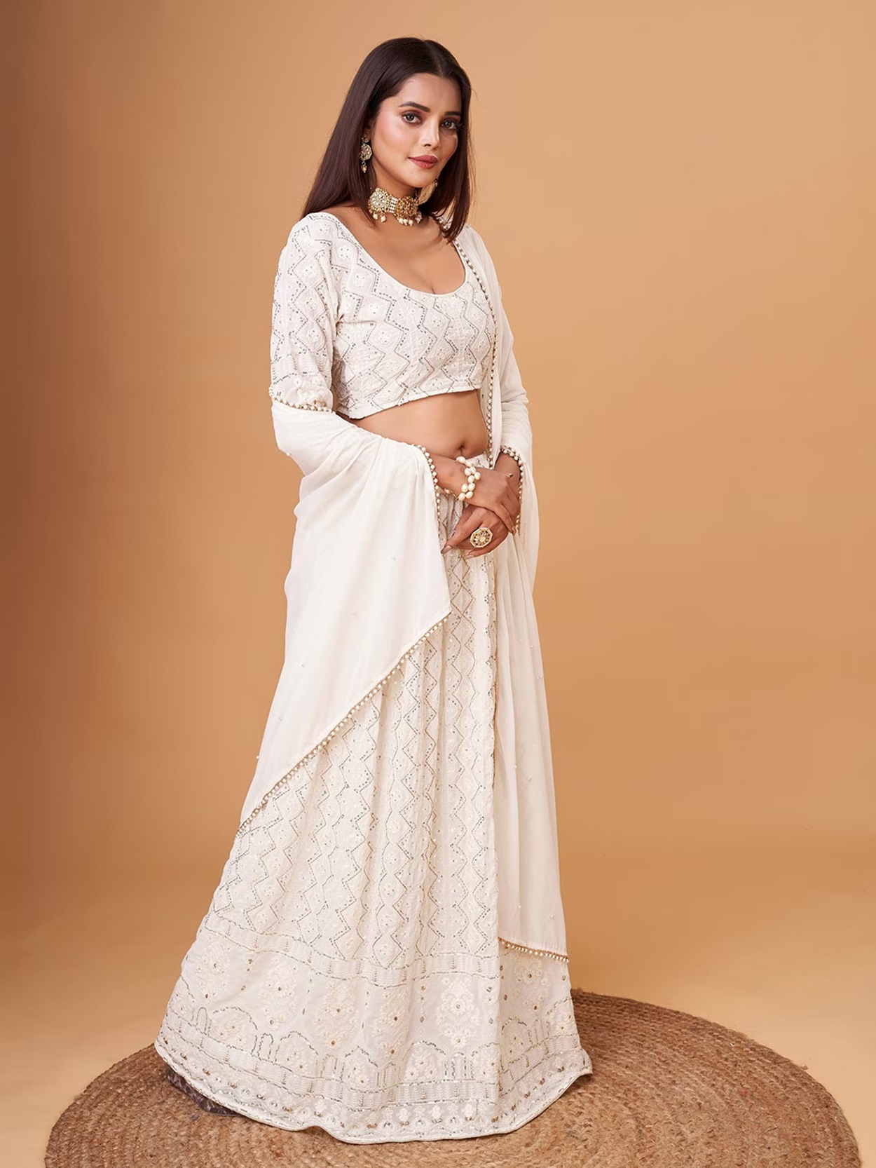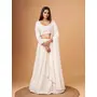 Elevate your ethnic look with this white faux georgette lehenga featuring thread embroidery work. Designed for festive occasions and celebrations, it offers a graceful flow and timeless appeal.Crafted from lightweight faux georgette fabric with a semi-stitched finish, this lehenga ensures comfort and easy customization. Dry clean recommended.