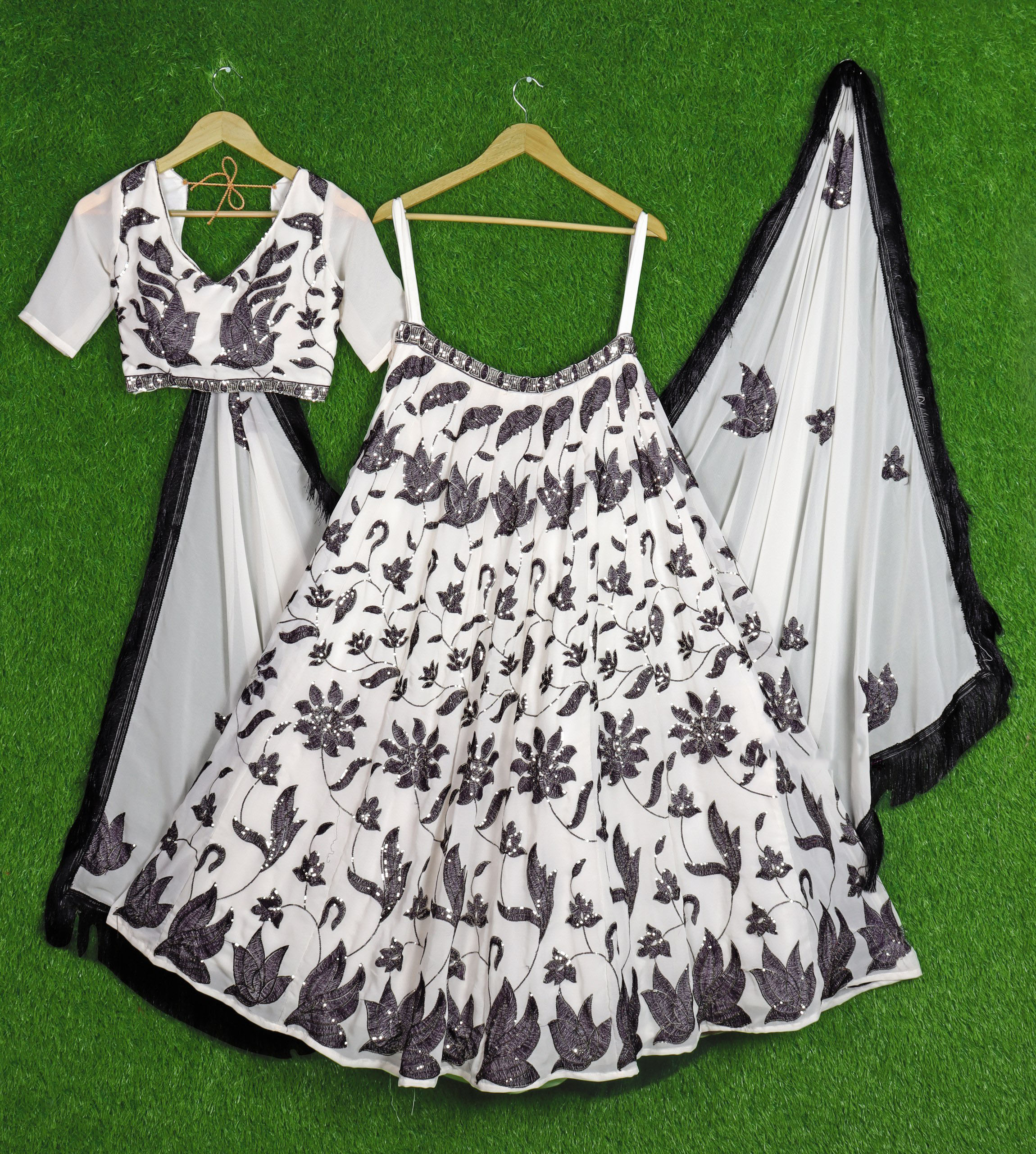 LEHENGA(BOTTOM)FABRIC:- FAUX GEORGETTEINNER:- MICRO FABRICWORK:- BLACK THREAD AND 3MM SEQUINS EMBROIDERY WORKSTITCH:- SEMI STITCHED WITH CANCAN AND CANVASSIZE:- 42HEIGHT AND 42WAISTFLAIR:- 3.50 METER FLAIR COLOR:- BALCK AND OFFWHITECHOLI(TOP):-FABRIC:- FAUX GEORGETTESIZE:- 0.80 METER FABRICWORK:- BLACK THREAD AND 3MM SEQUINS EMBROIDERY WORK STITCH:- UN STITCHED FABRICCOLOR:- BALCK AND OFFWHITEINNER:- MICRO FABRICDUPATTA:-FABRIC:- FAUX GEORGETTEWORK:- BLACK THREAD AND 3MM SEQUINS EMBROIDERY WORKSIZE:- 2.25 METER DUPATTASTITCH:- FULL STITCHEDCOLOR:- BALCK AND OFFWHITEADDITIONALWASH CARE: - DRY CLEAN ONLYCOLOR: - PRODUCT COLOR MAY SLIGHTLY VARY DUE TO PHOTOGRAPHIC LIGHTNING SOURCES OR YOUR DEVICE DISPLAY SETTINGSTHESE ARE MADE TO ORDER DESIGNER STYLES, HENCE EXPECT A SLIGHT VARIATION FROM THE IMAGE DISPLAYEDIN THE BOX 1 PIECE LEHENGA 1 PIECE DUPATTA 1 PIECE BLOUSE FABRIC.