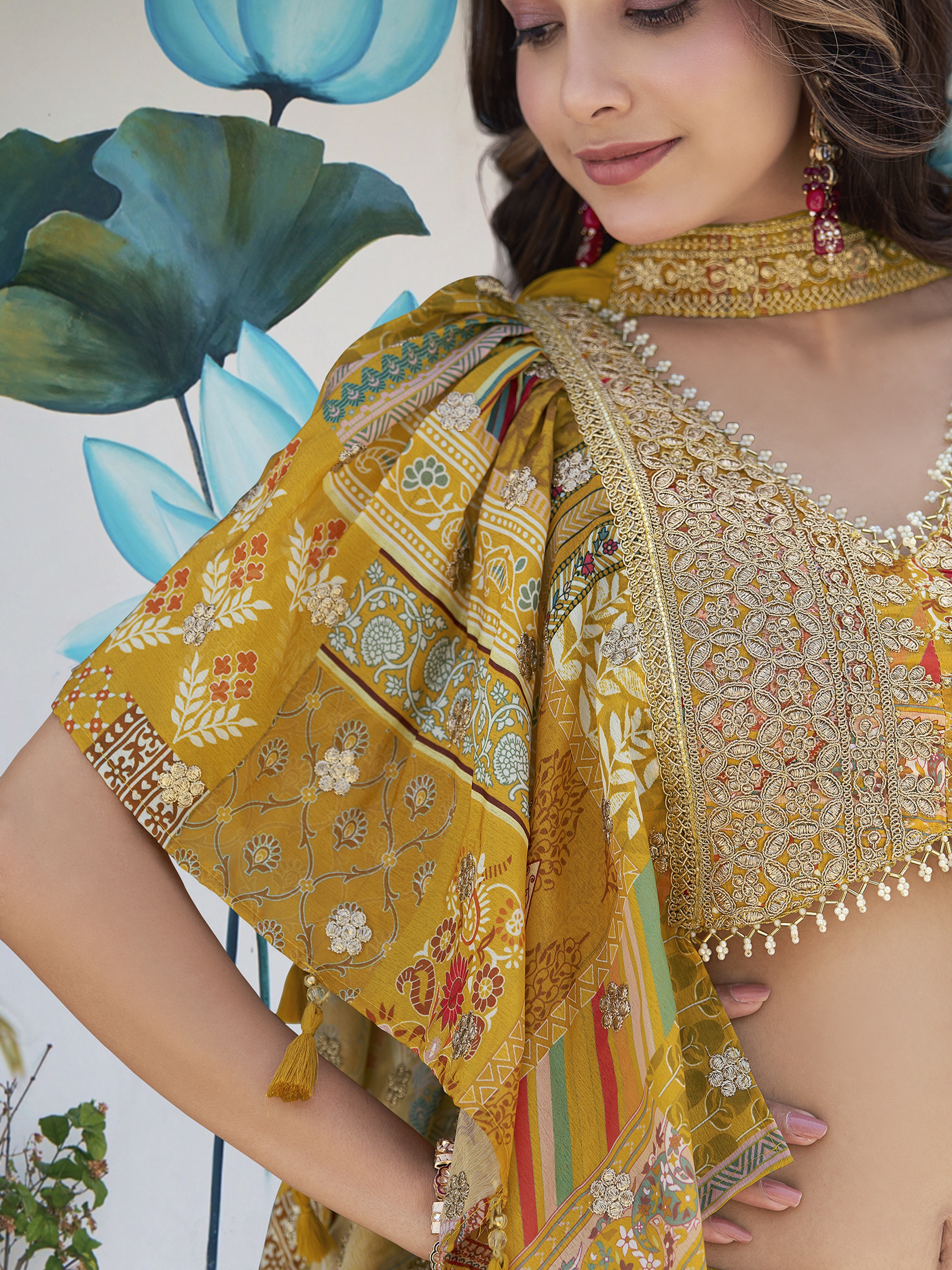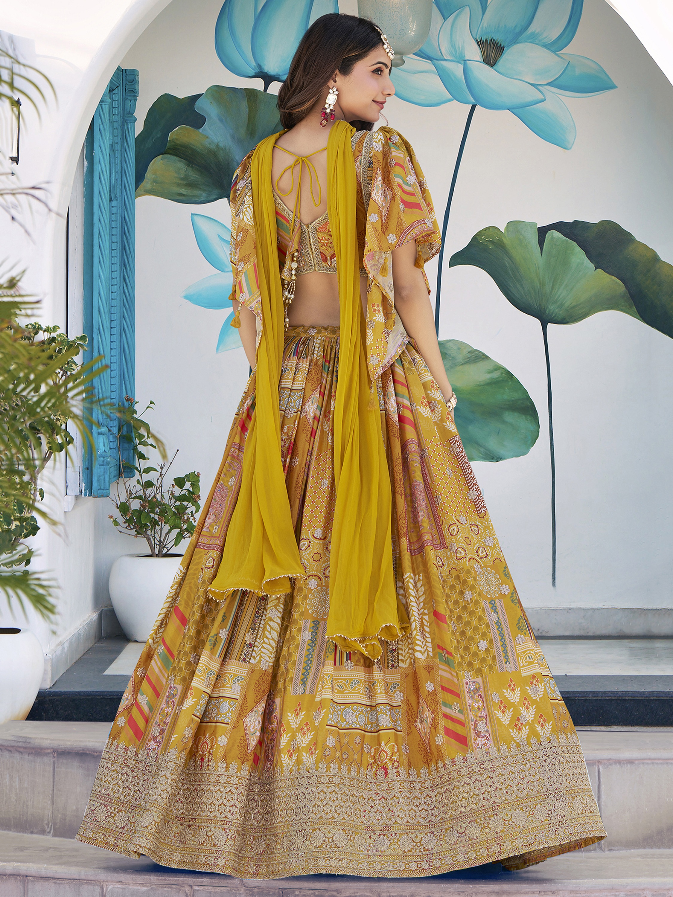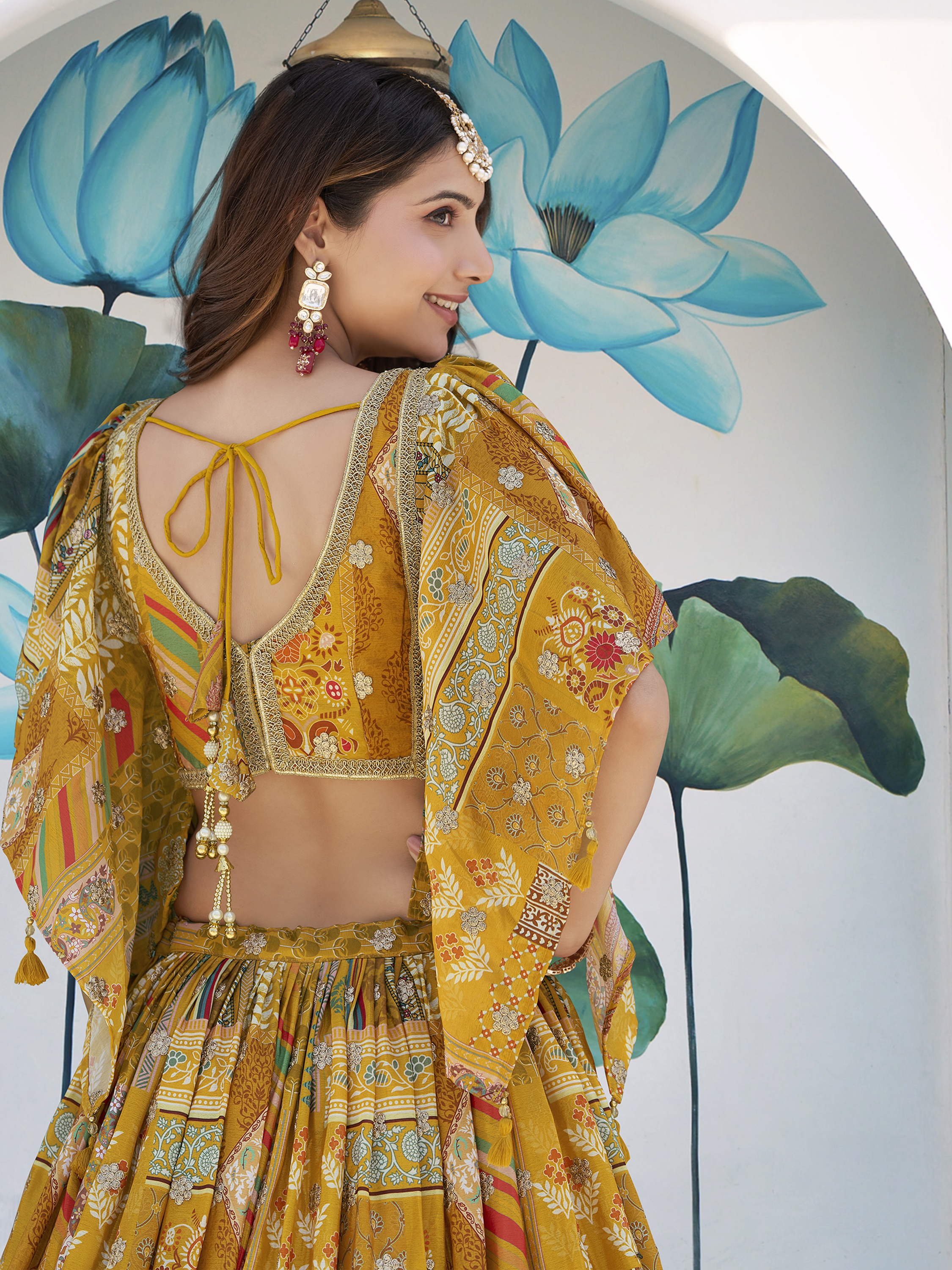 Elevate your ethnic look with this yellow chinnon lehenga featuring dori embroidery work. Designed for festive occasions and celebrations, it offers a graceful flow and timeless appeal.Crafted from lightweight chinnon fabric with a semi-stitched finish, this lehenga ensures comfort and easy customization. Dry clean recommended.