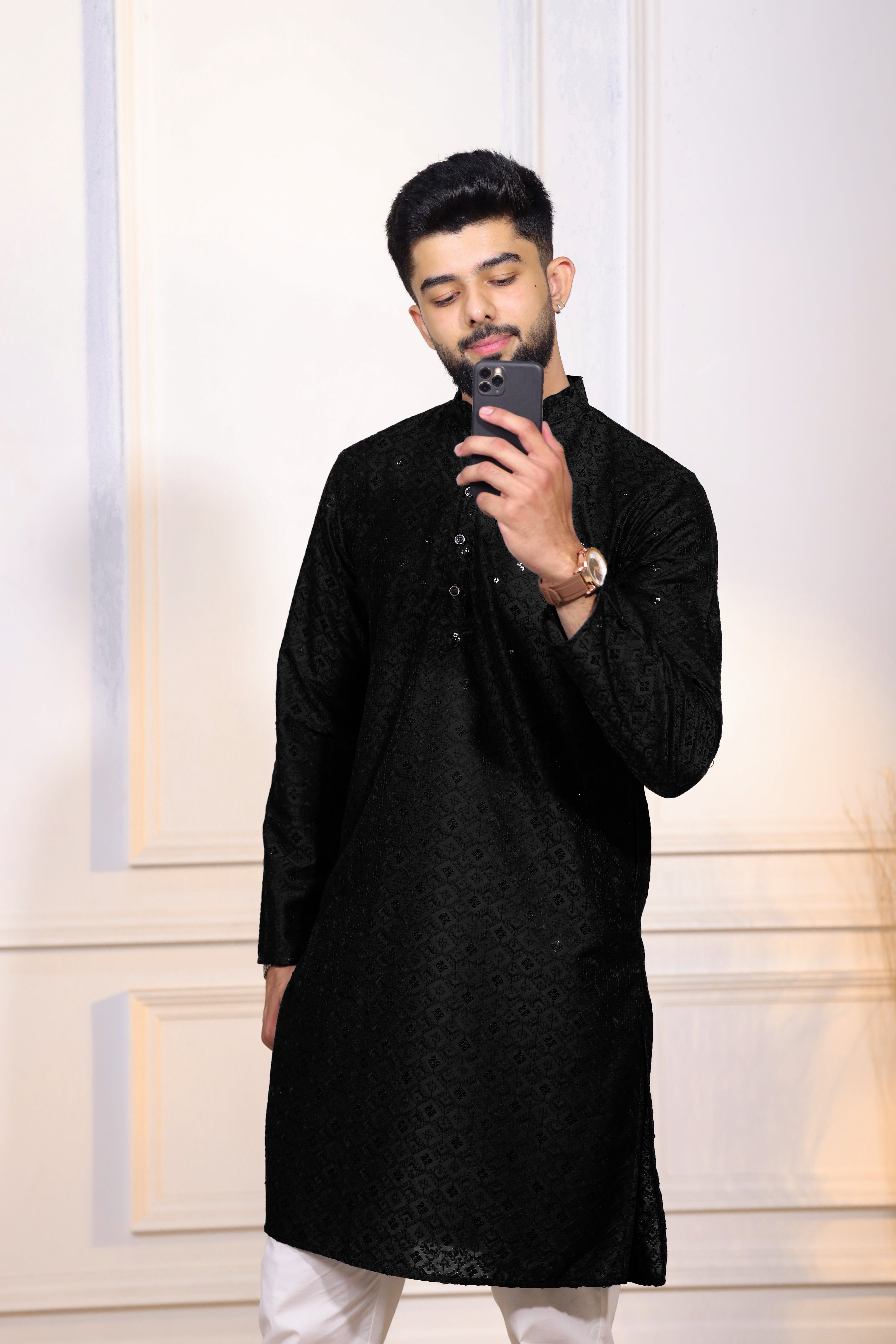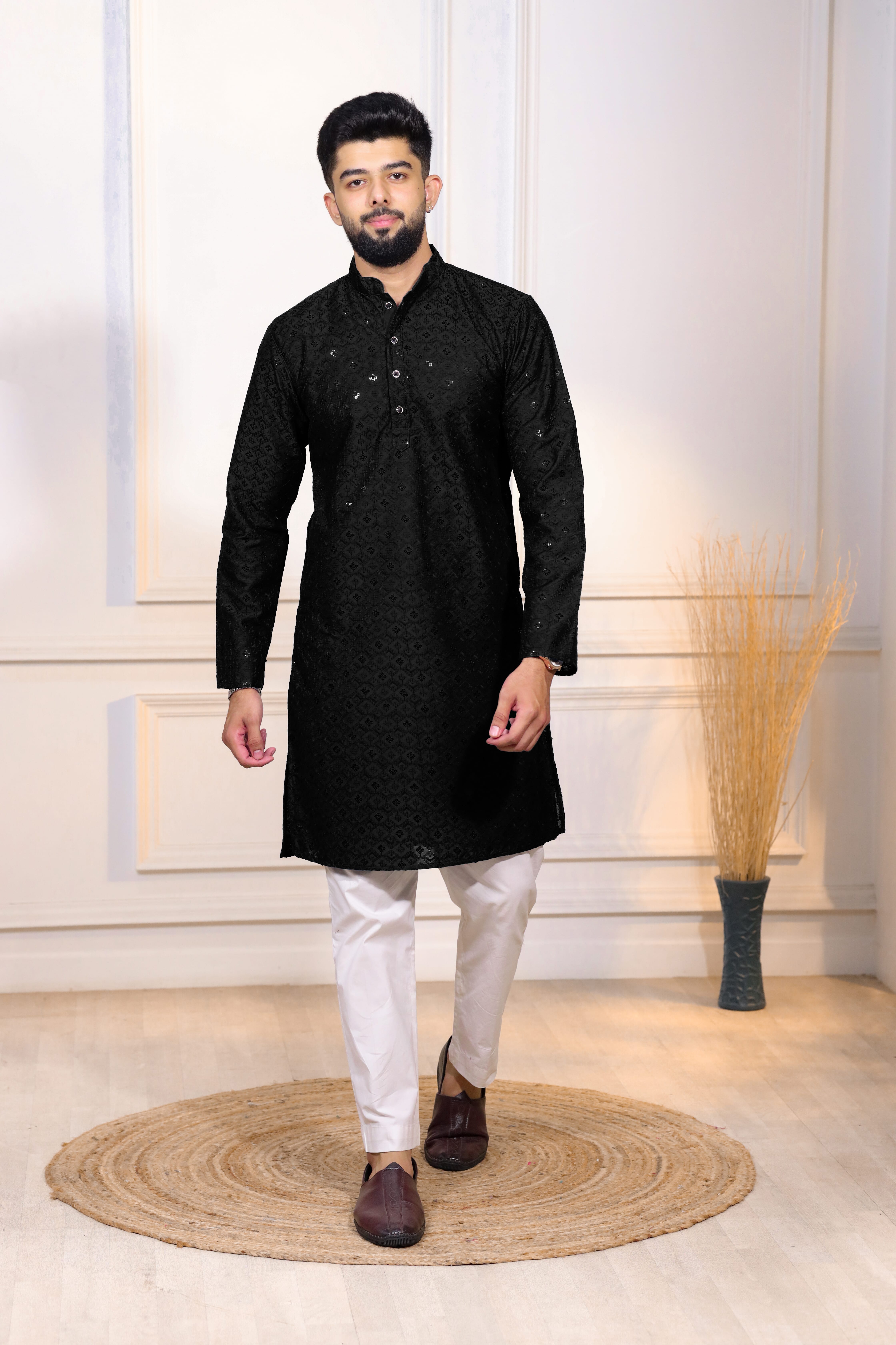 Black Color Designer Embroidery Work Ceremonial Ethnic Kurta Payjama For Men's