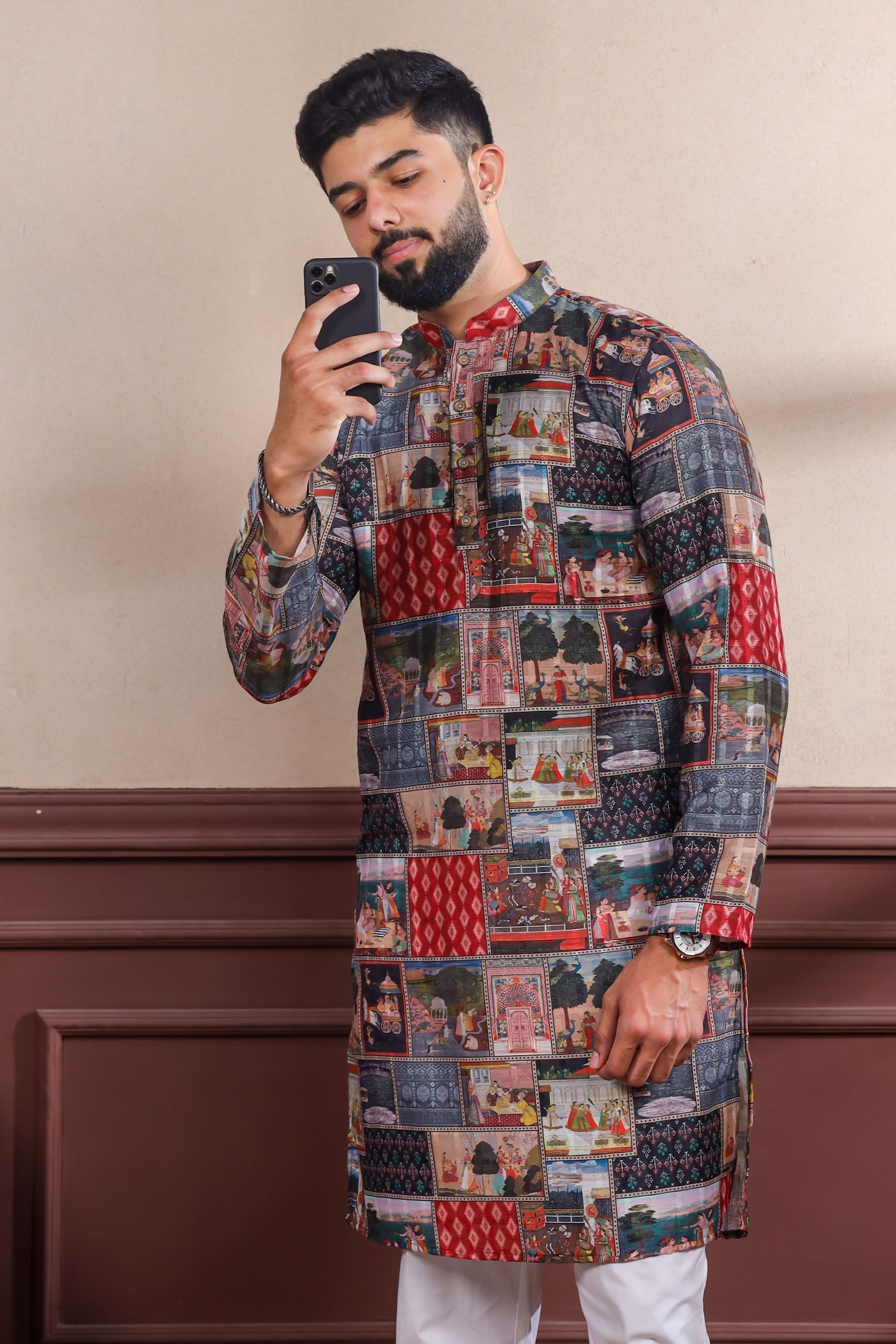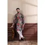 Black Color Ethnic Woven Patta With Digital Printed Ceremonial Kurta Payjama For Men's