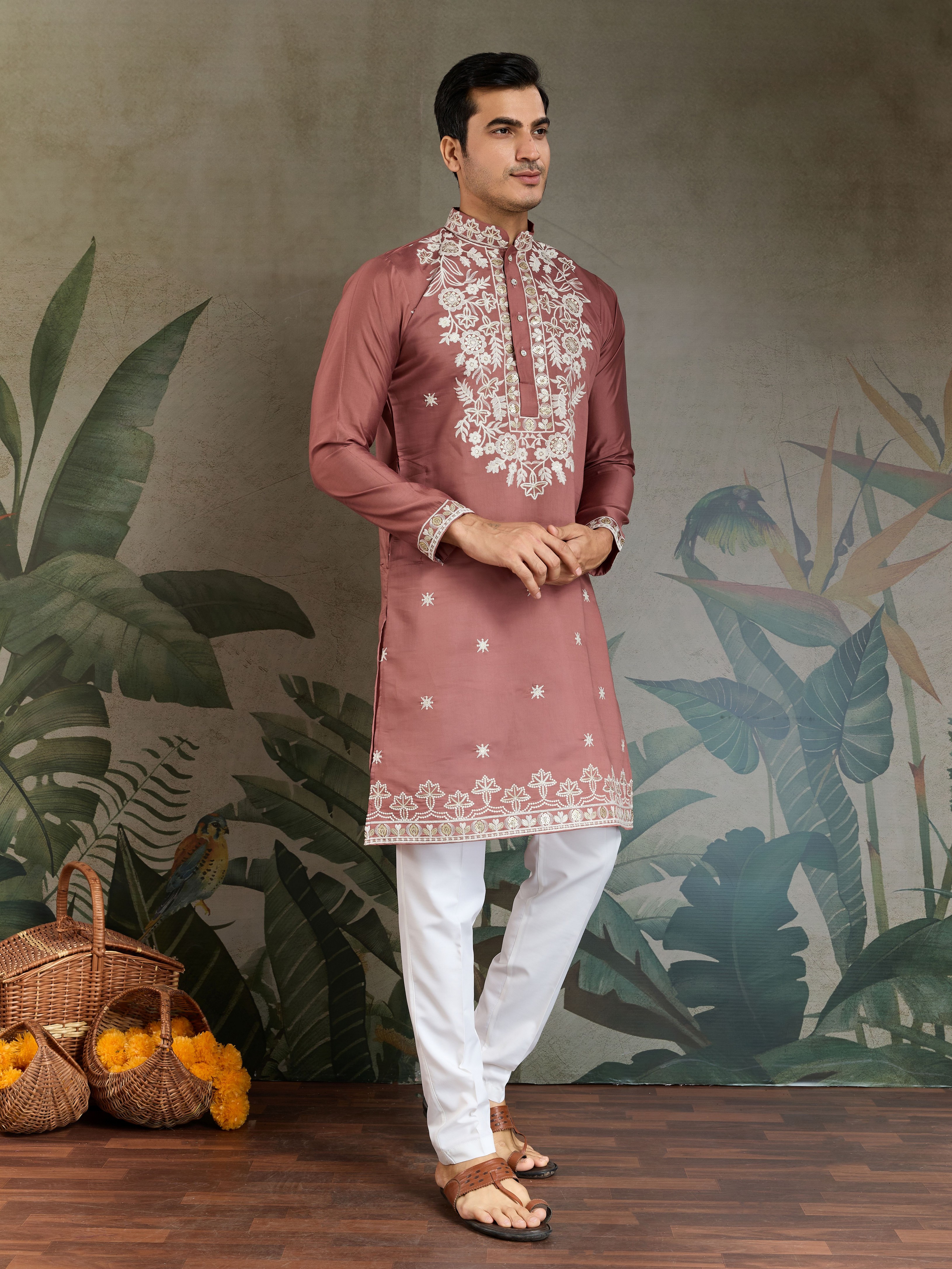 Dusty Pink Color Rayon Fabric Sequins Embroidery Work Ethnic Ceremonial Wear Men's Kurta