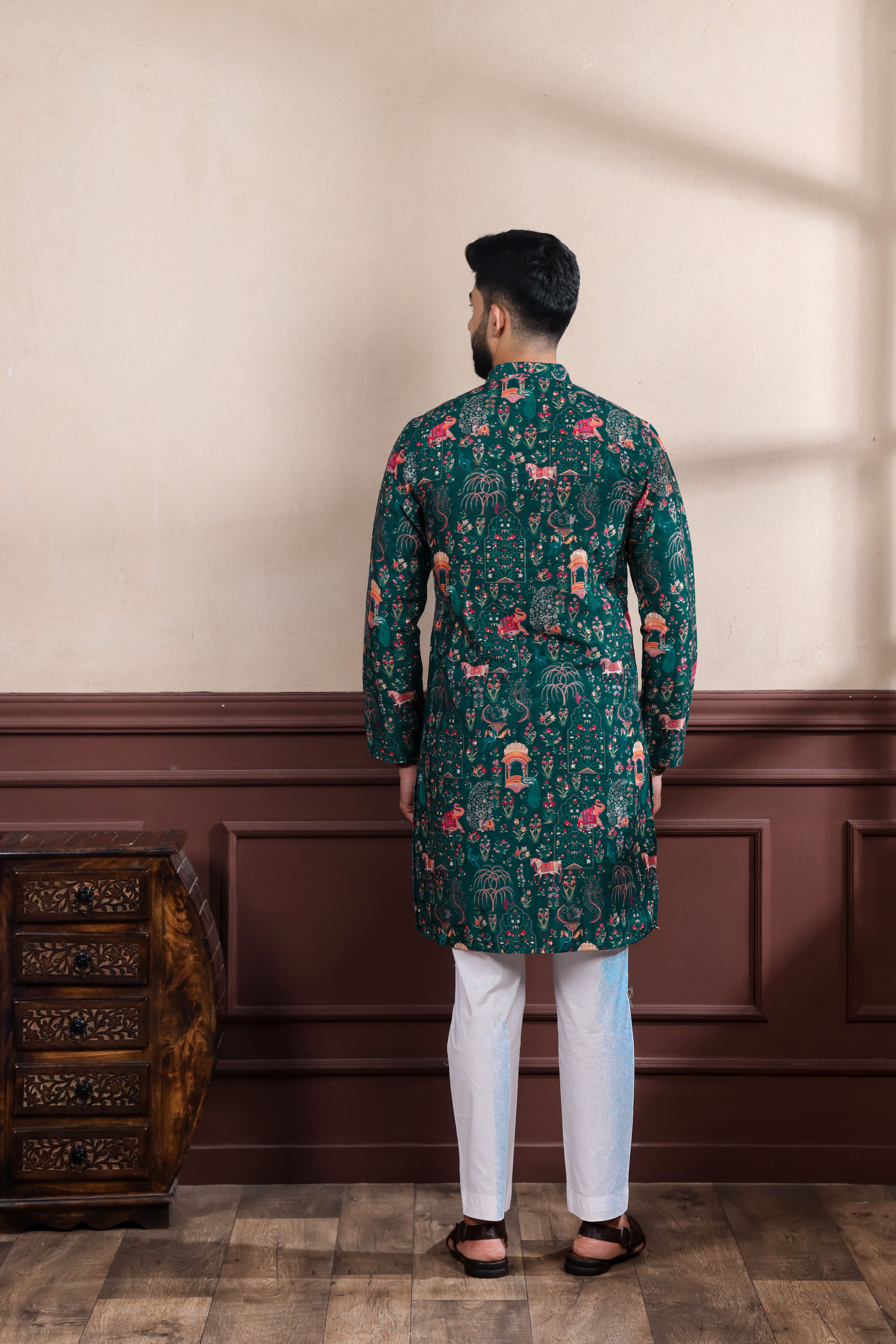 Green Color Ethnic Woven Patta With Digital Printed Ceremonial Kurta Payjama For Men's