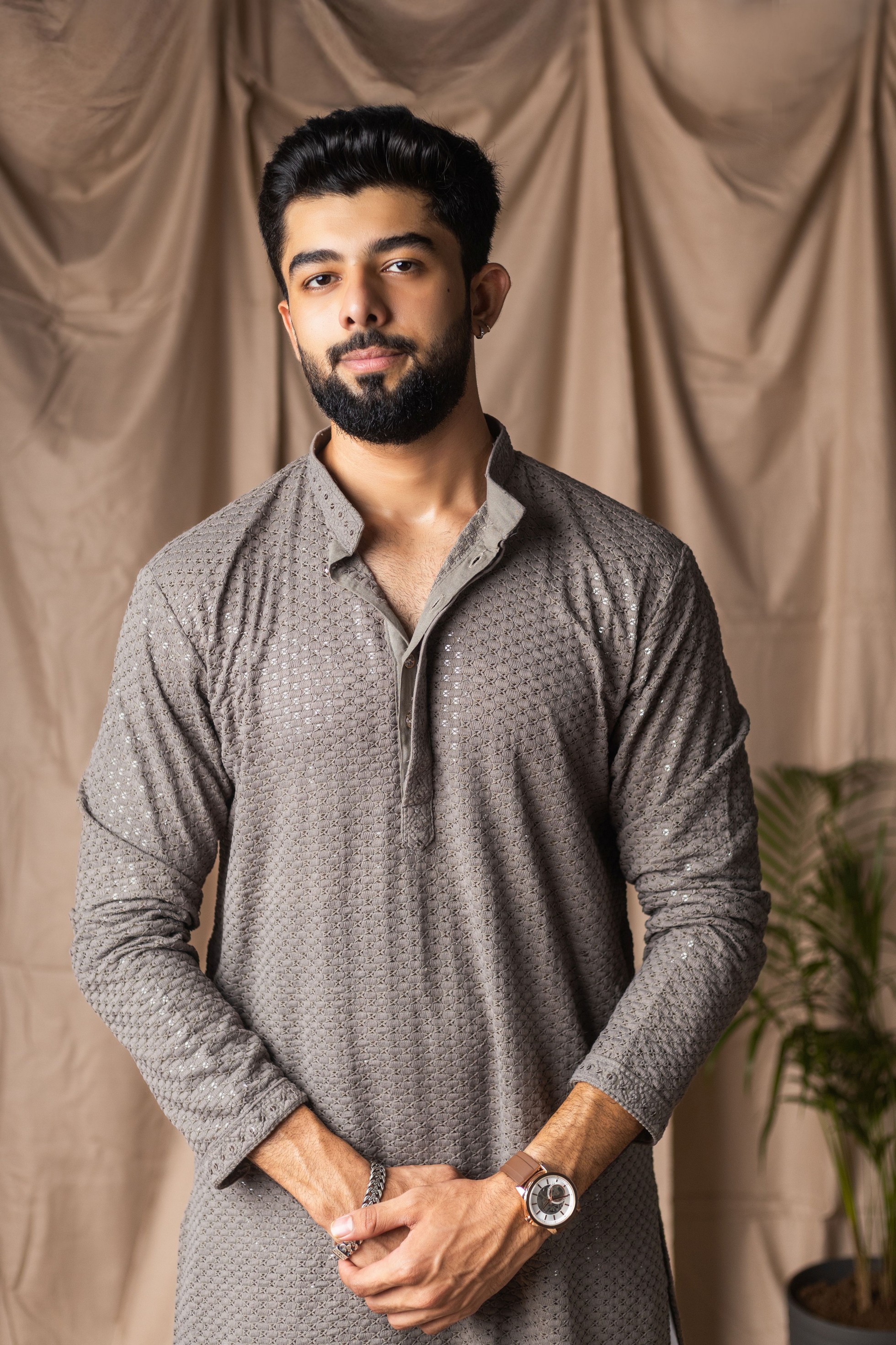 Grey Color Beautiful Thread Embroidery Work Rayon Fabric Ceremonial Men's Kurta Payjama