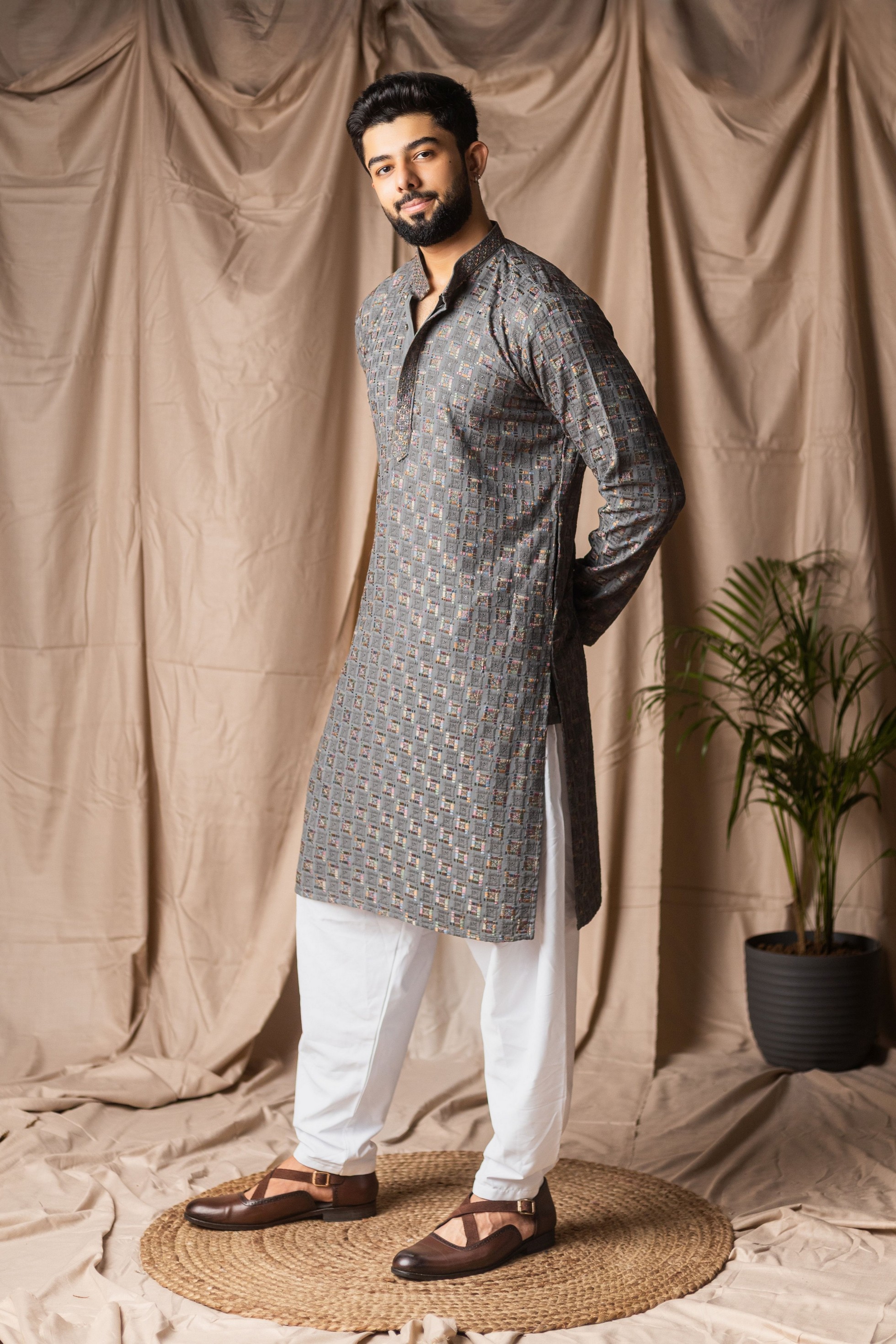 Grey Color Rayon Fabric Festive Wear Ethnic Men's Embroidered Kurta Payjama