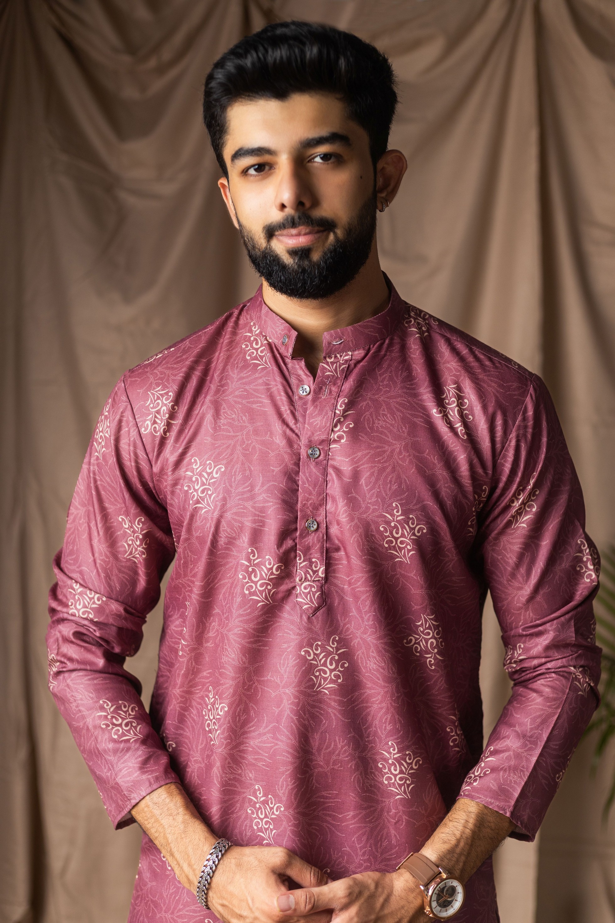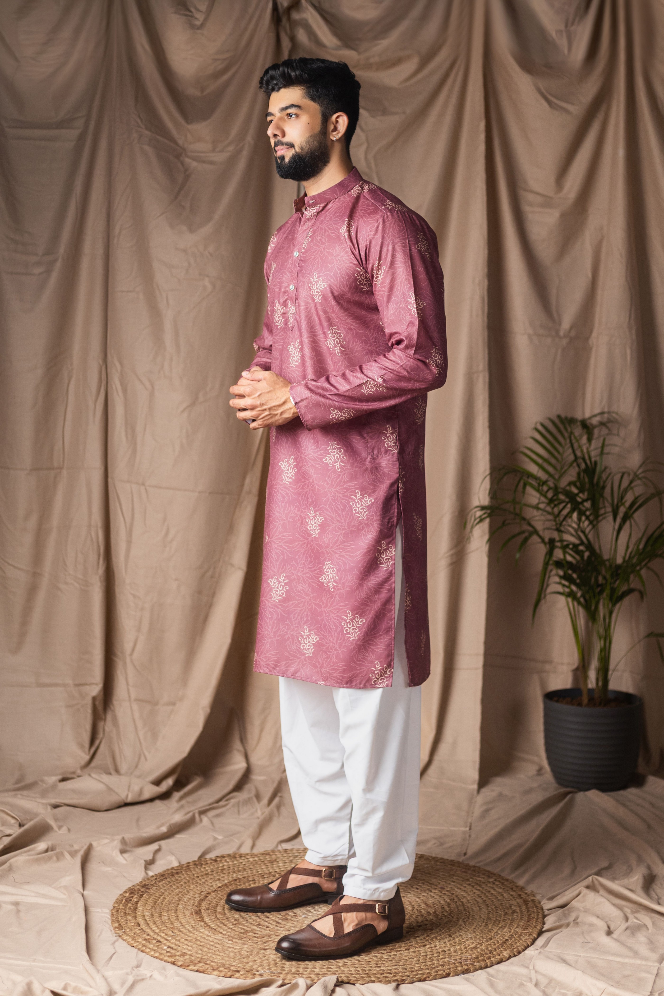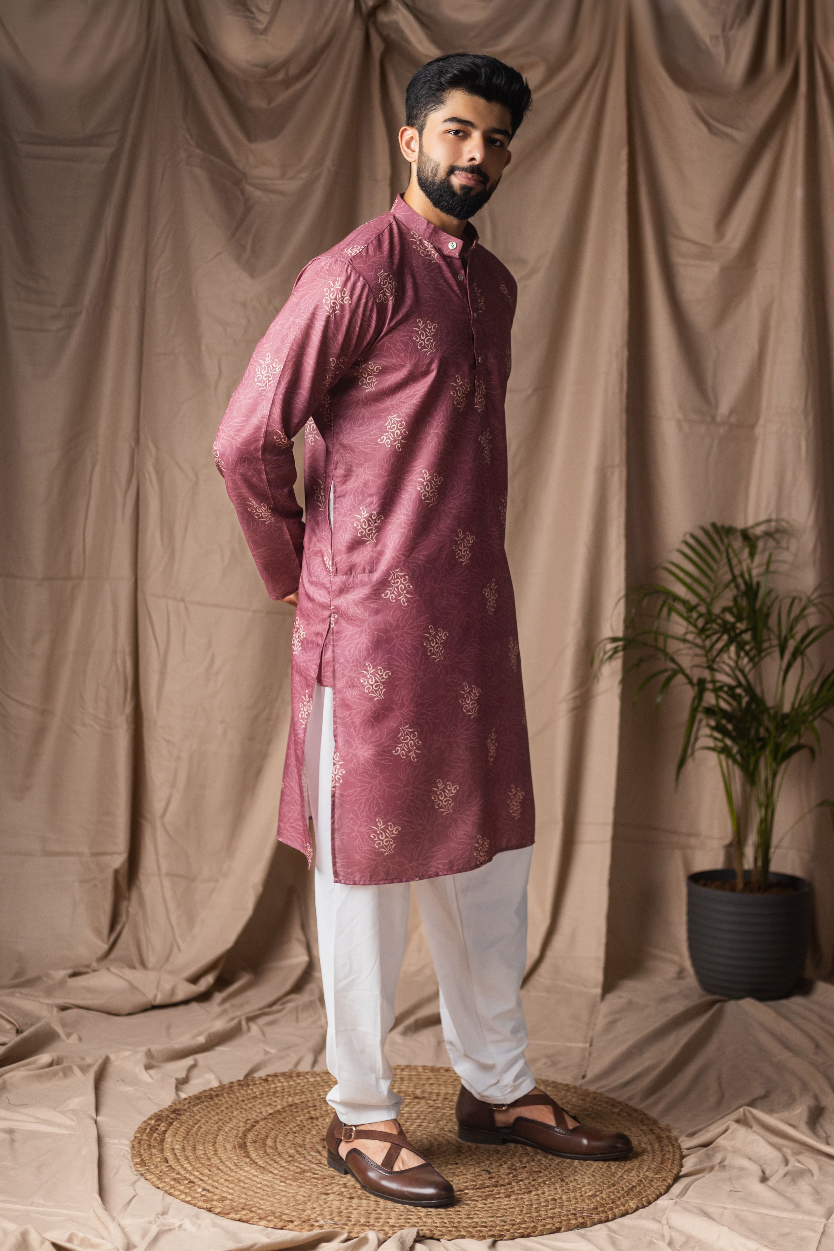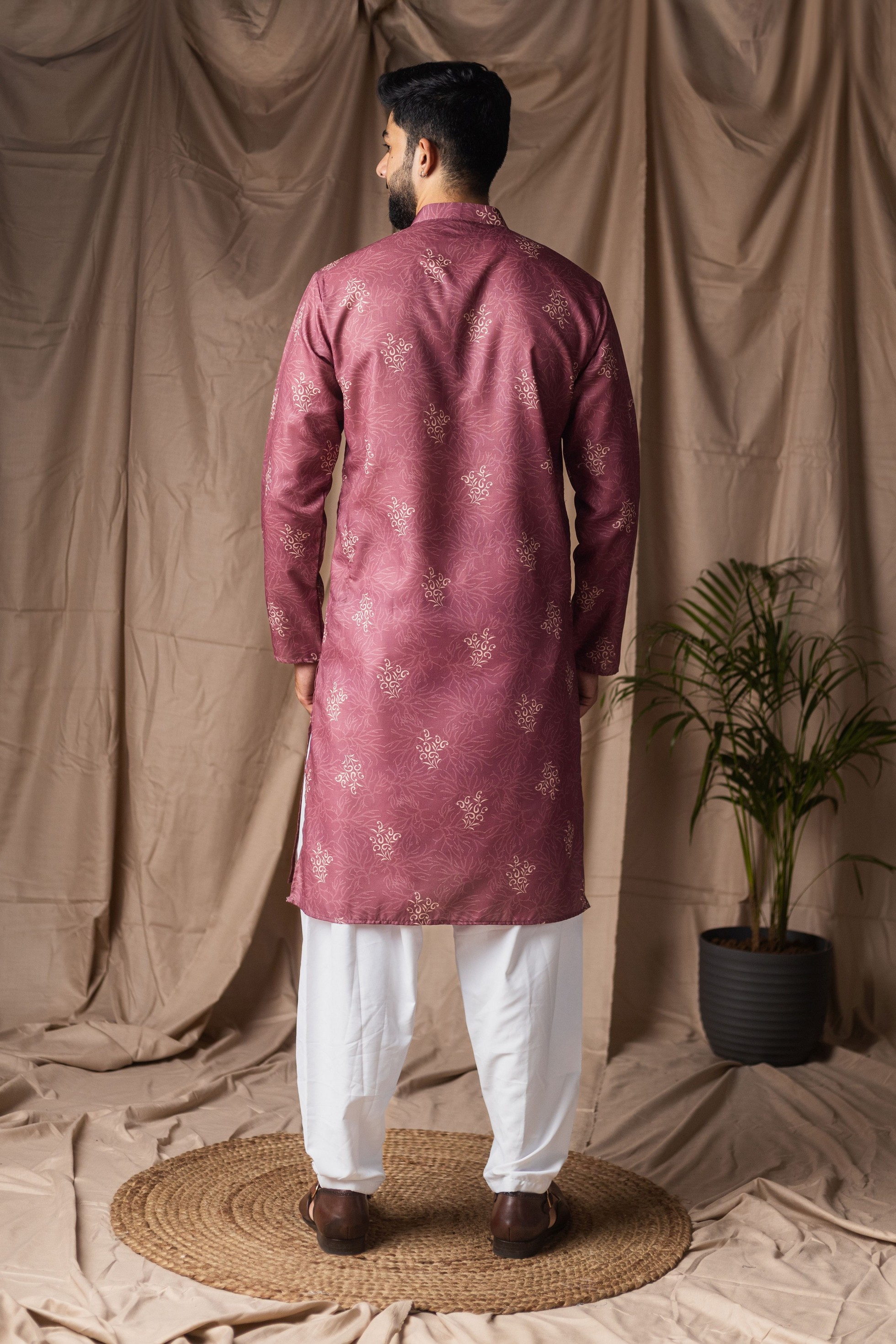 Mauve Color Blended Linen Designer Printed Stylish Kurta Payjama For Mens'