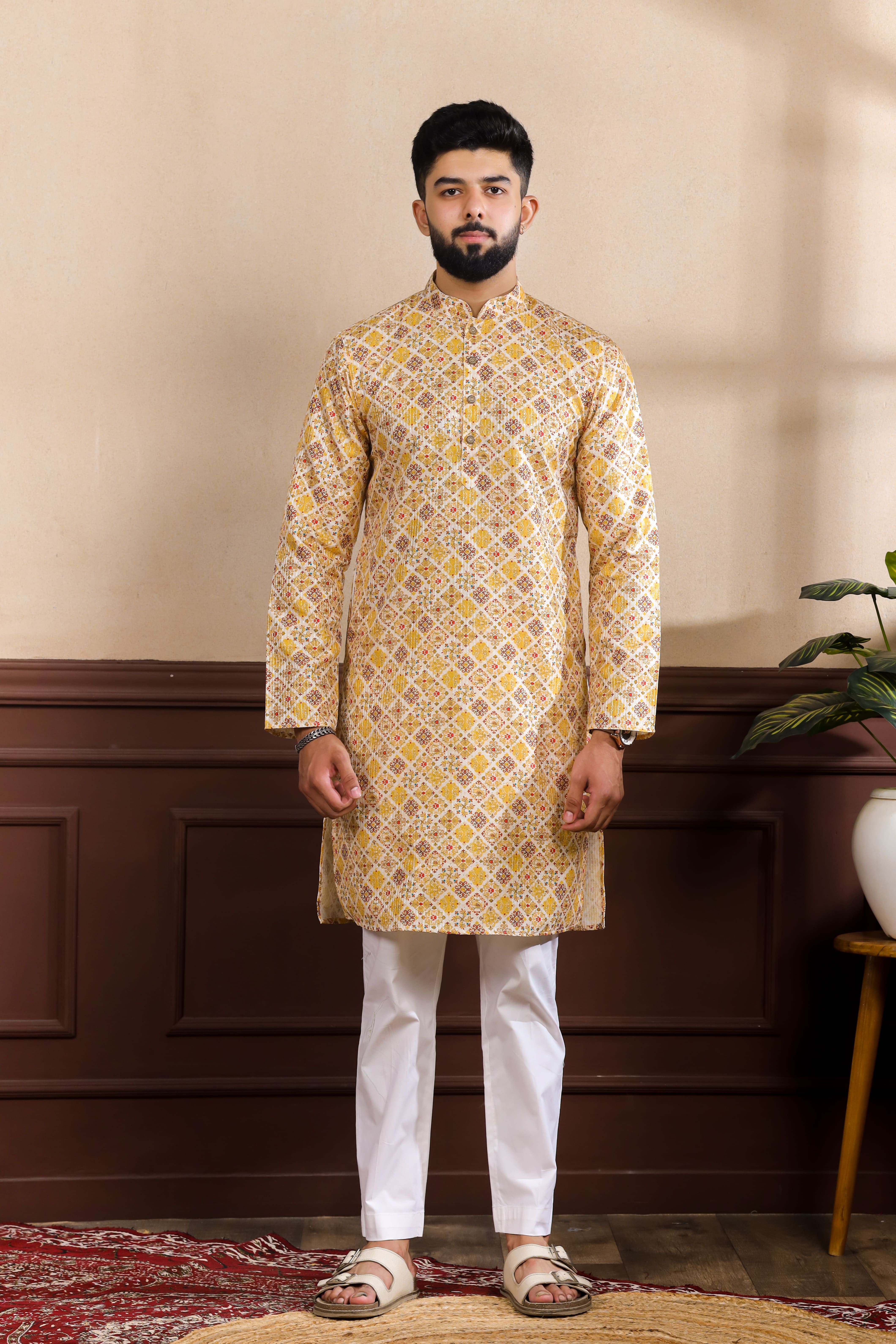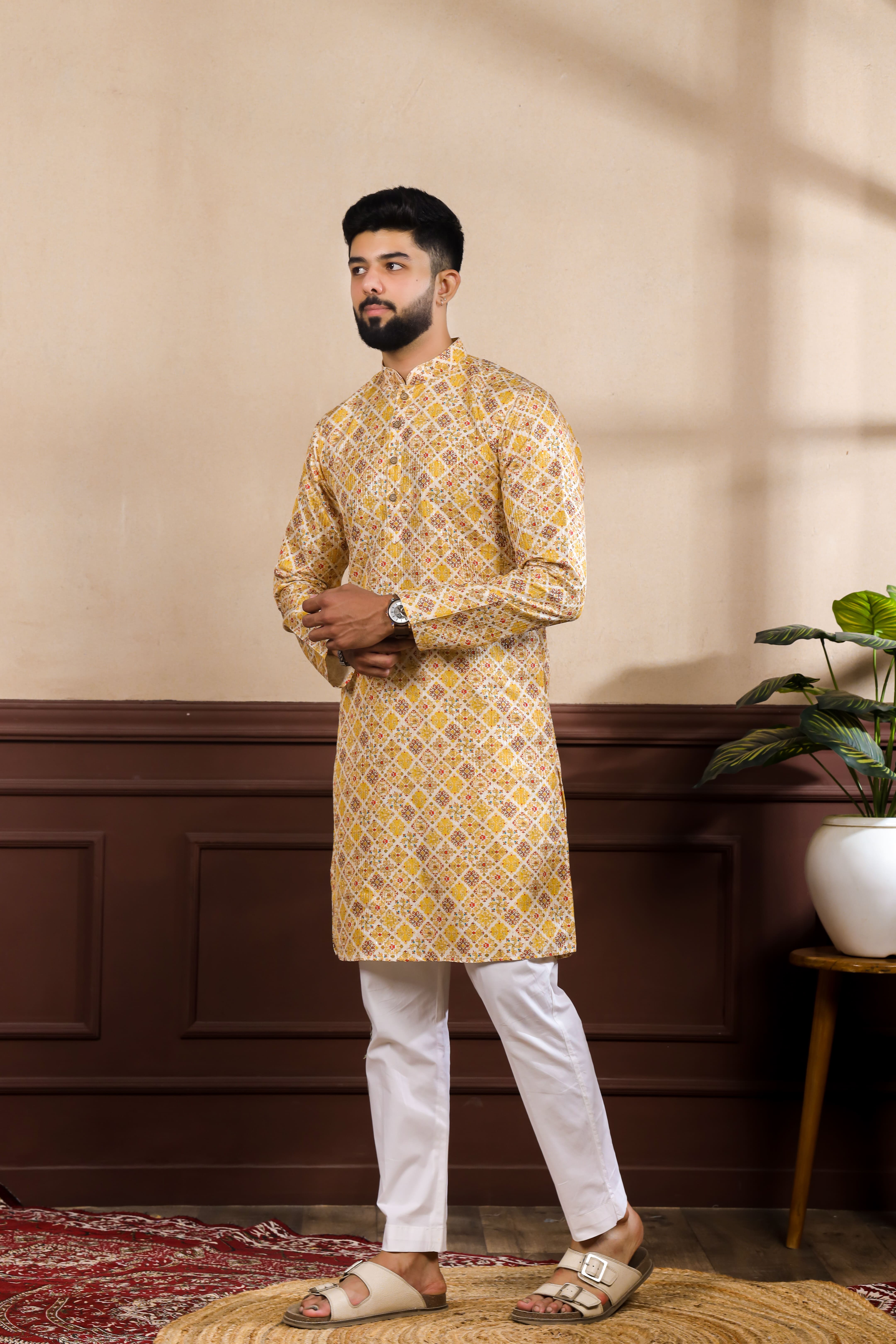 Mustard Color Beautiful Art Silk Fabric Smart Print Designer Kurta Payjama