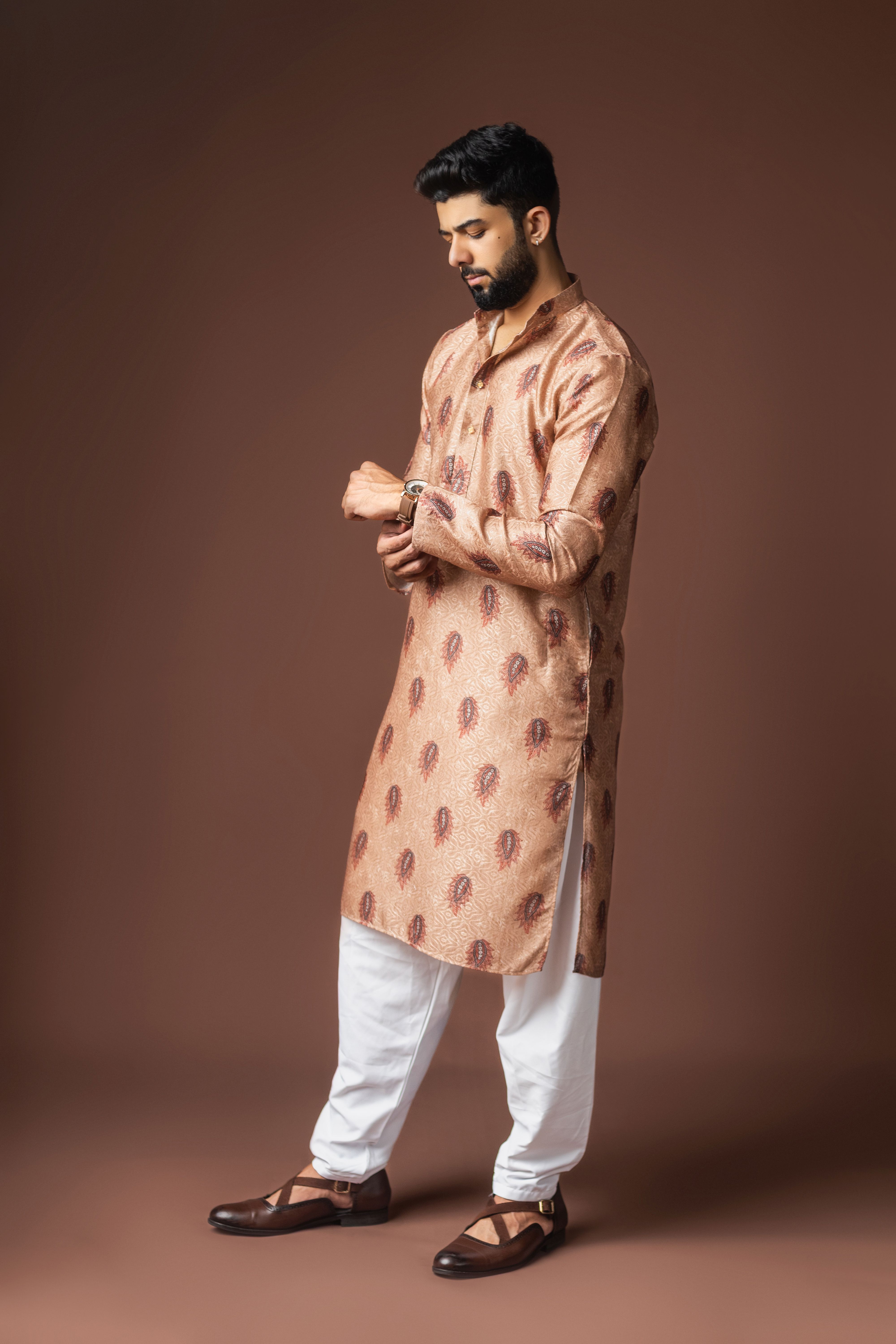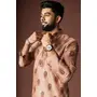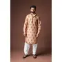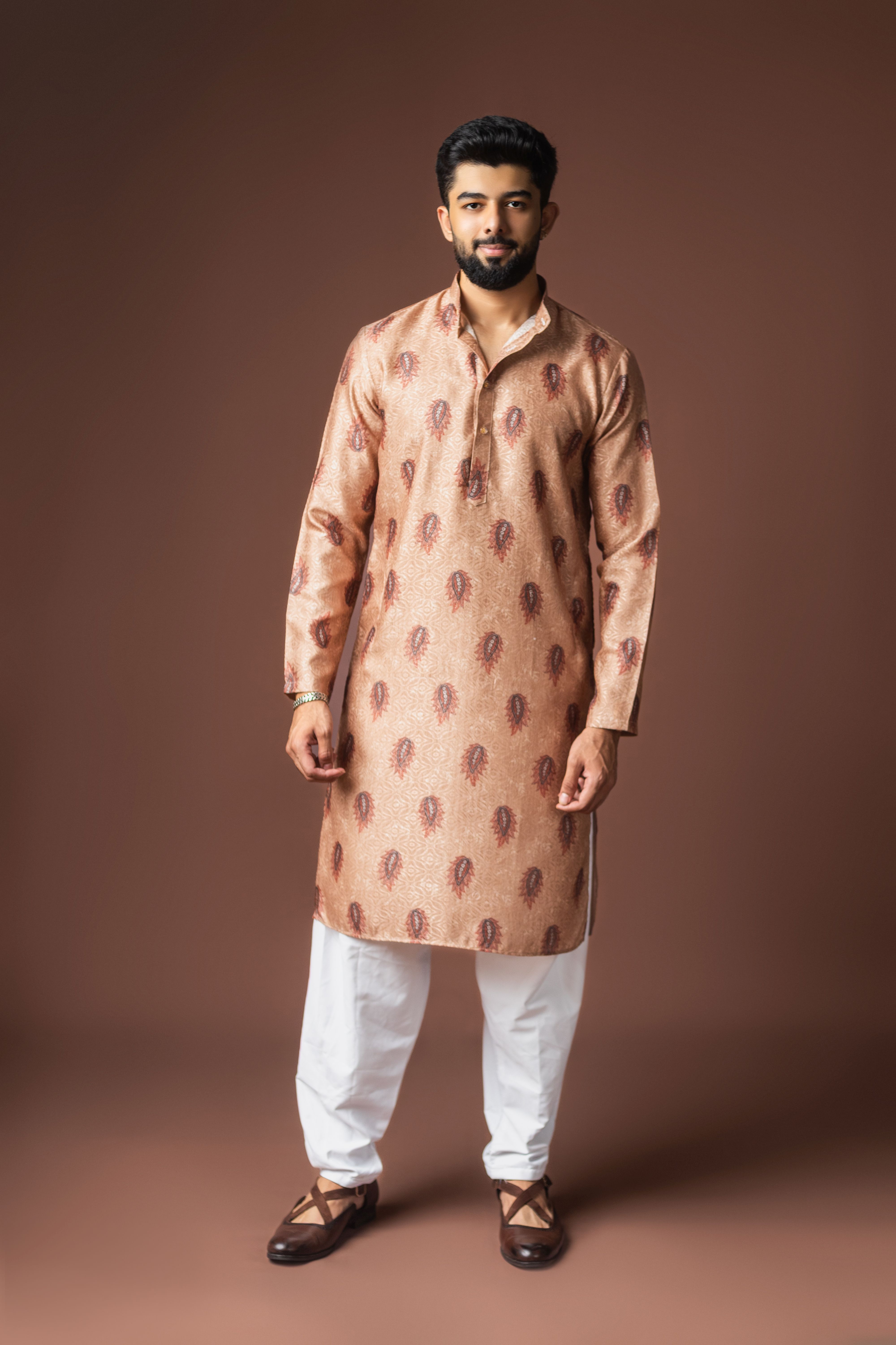 Orangish Brown Color Blended Linen Designer Printed Stylish Kurta Payjama For Mens'