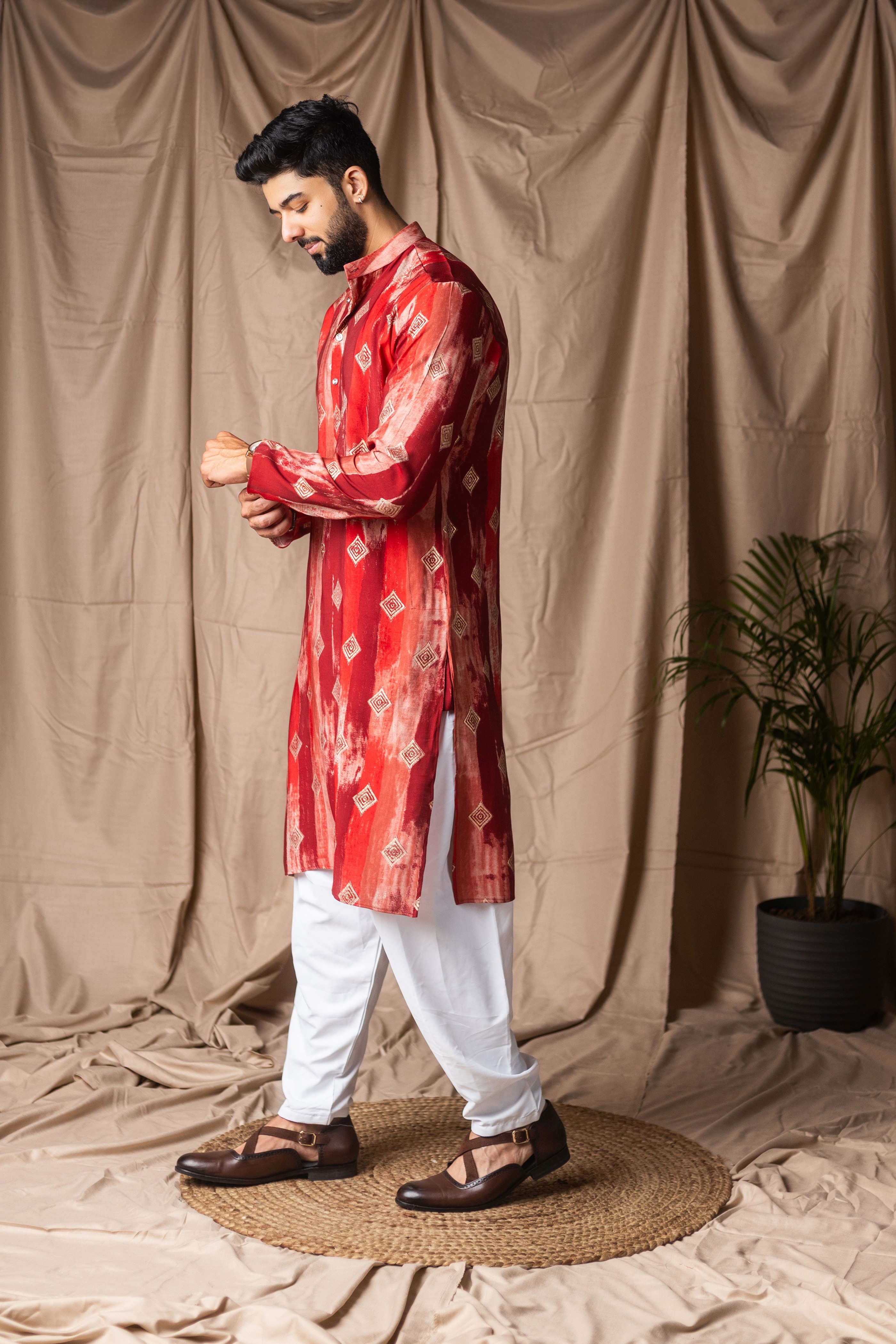 Red Color Modal Silk Fabric Designer Printed Festive Wear Men's Kurta Payjama