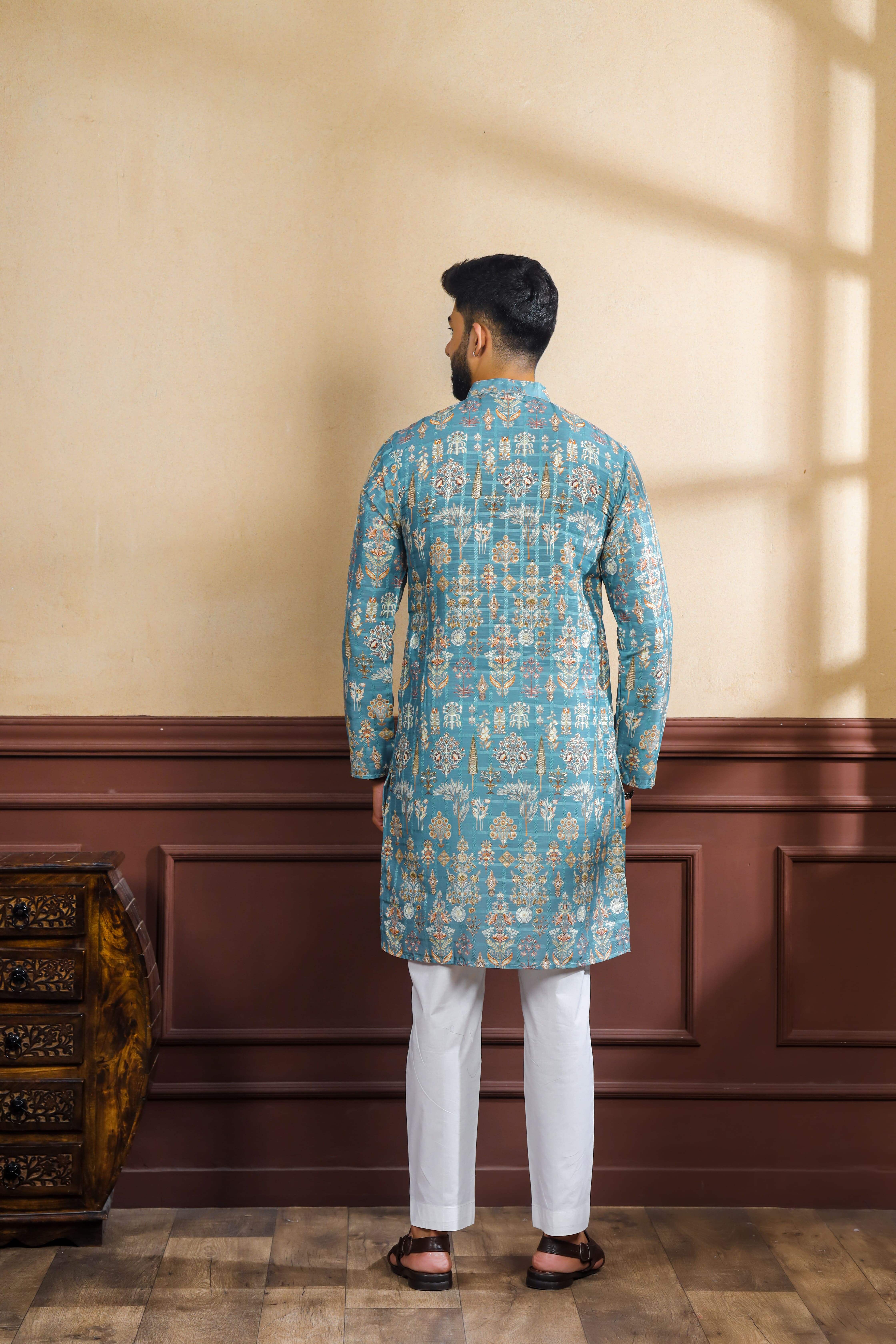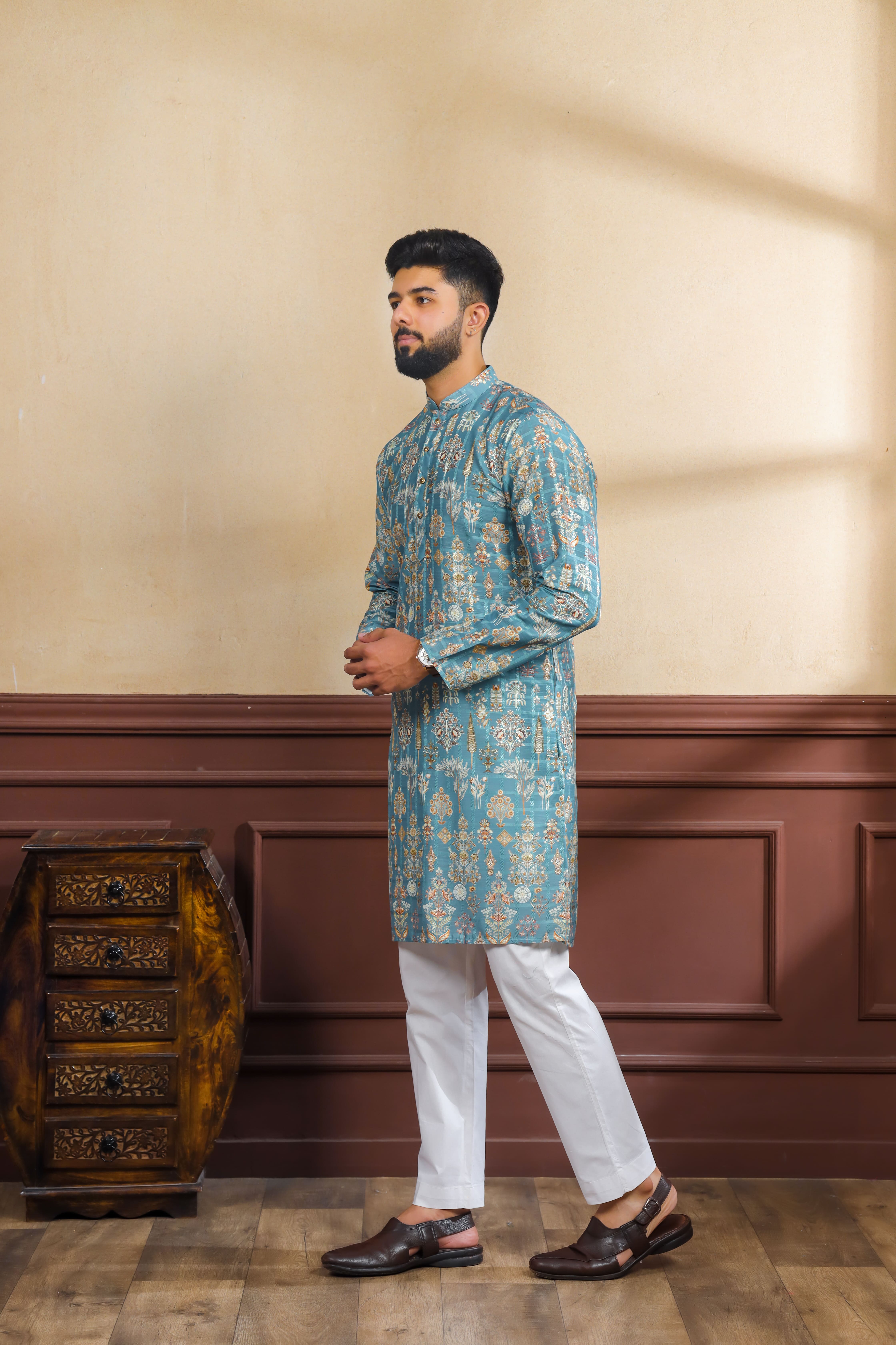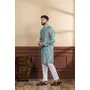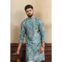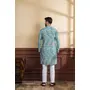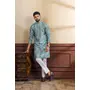 Teal Color Ethnic Woven Patta With Digital Printed Ceremonial Kurta Payjama For Men's