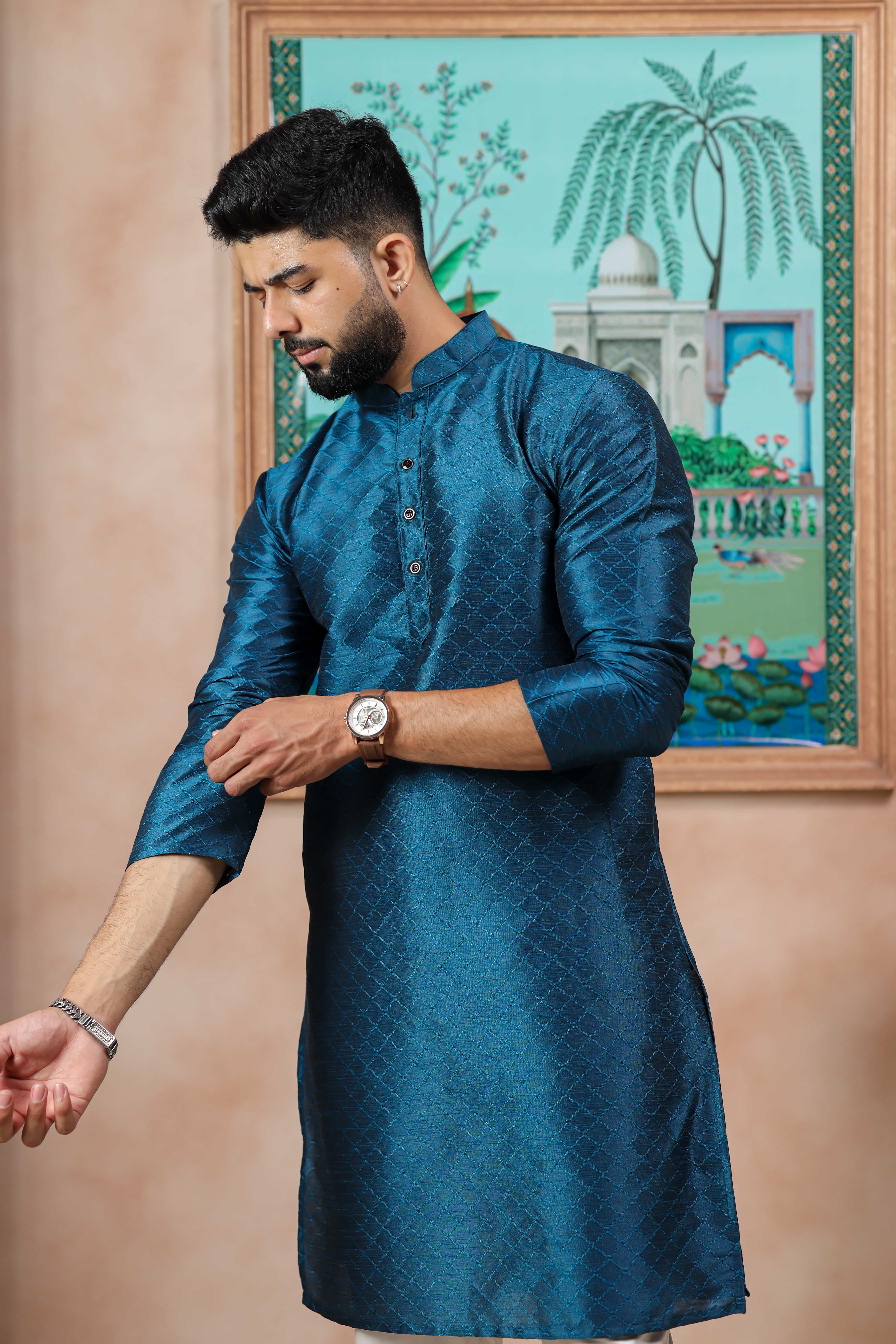 Teal Color Graceful Partywear Kurta Payjama For Mens Ceremonial Looks